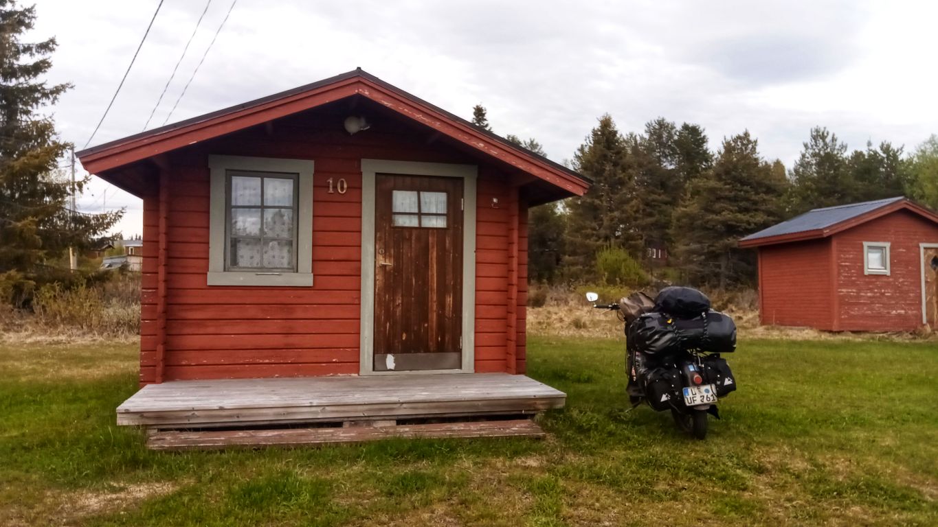 Nun bin ich da, wo Nils Holgerson immer hin wollte. Und Bernde. In Lappland. So weit, so gut. Zwei Probleme tauchen auf: Mein Lenkkopflager bekommt mangels Bewegung Druckstellen. Mein zweites und dickeres Problem ist mein Hinterreifen. Dieser nutzt sich durch gefräste Asphaltstraßen viel schneller ab als gedacht. Gut, bis nach Hause wäre es eh knapp geworden, aber jetzt schon Glatze? Morgen muß ich nach Reifenhändler Ausschau halten. Mein Ziel, die finnische Grenze, hab ich leider nicht ganz geschafft. Morgen soll bestes Wetter werden und die Bedingungen zum Erreichen des Nordkaps wären hervorragend gewesen. Aber nun brauch ich erst mal einen neuen Reifen. Ansonsten kommt es mir vor, ich hätte ein Loch im Tank. Man döst so vor sich und der innere Rechner sagt schön regelmäßig „tanken“. Aber 200km vergehen dann doch schnell, wenn man an nichts denkt und nur Kilometer abspult ohne Abwechslung. Abgesehen davon finde ich meinen Verbrauch von 6l/100km nun auch nicht wirklich sparsam.