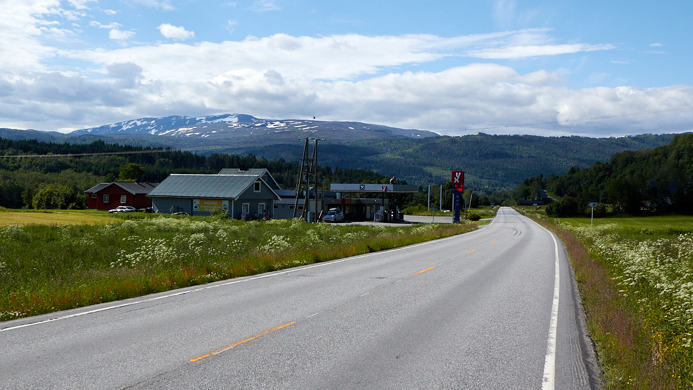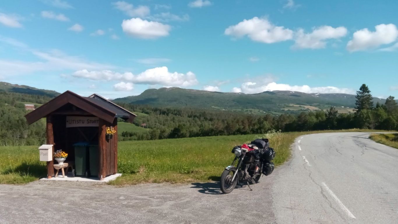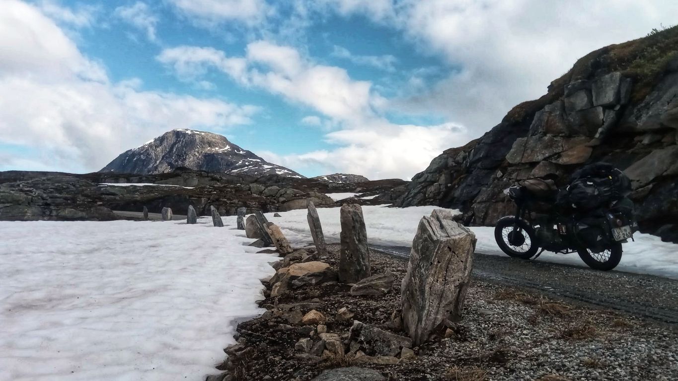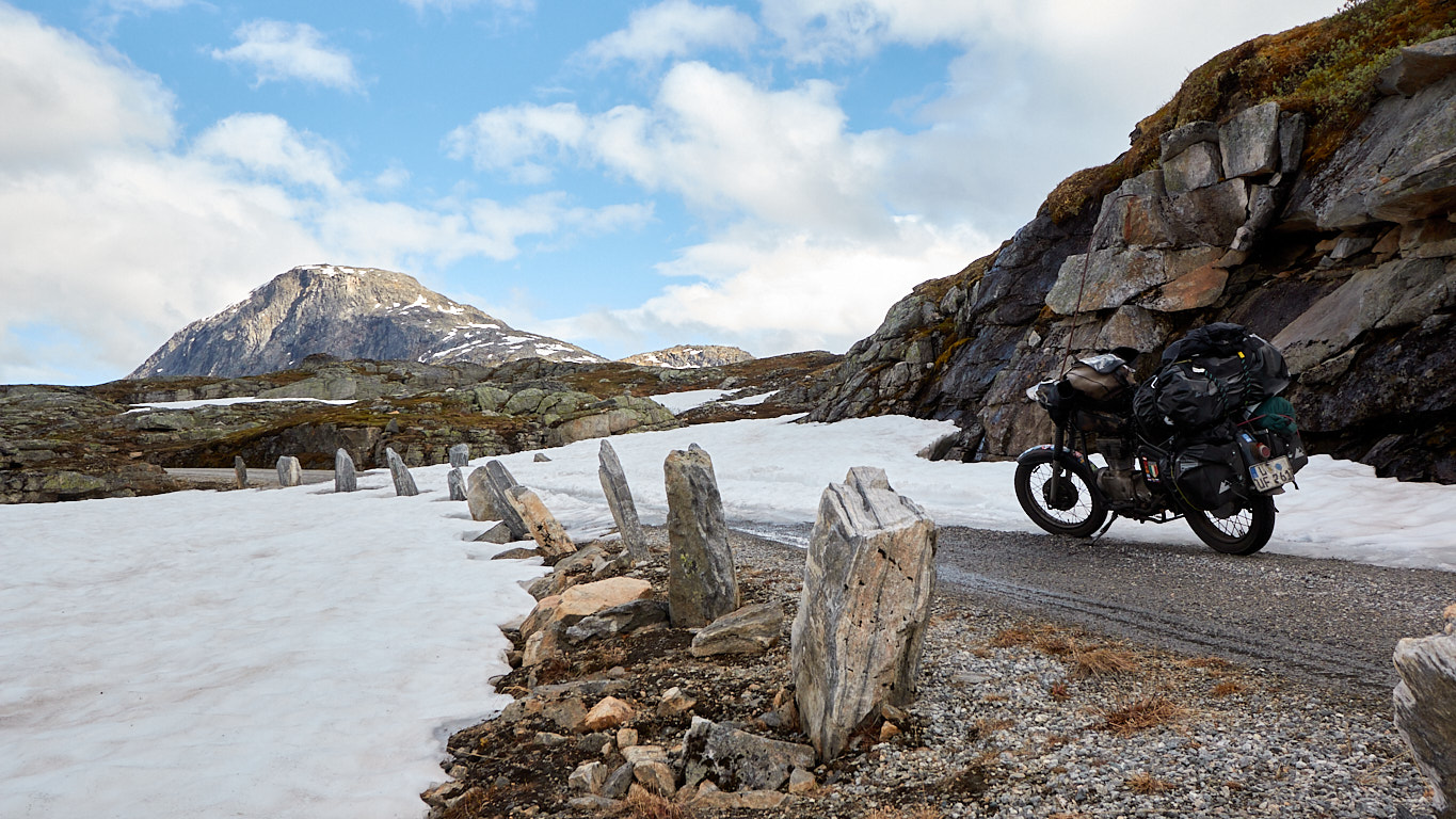 Letzte Nacht ging wieder an die Substanz. Zelt und Schlafsack sind nicht gut bei Erkältung. Alles für die Genesung kommt zu kurz. Nützt nichts, auch heute muß es weiter gehen. Dabei ist noch garnicht raus, wohin ich mich eigentlich bewege. Bergen wäre die kürzeste und schnellste Lösung. Ab auf die Fähre und nach Dänemark. Von da an wäre ich in zwei Tagen zu Hause. Oder doch zu Oliver nach Jørpeland, um die Schwungscheibe noch zu wechseln. Fragt sich nur, ob sich das noch lohnt. Mehr als die Hälfte der Strecke von Alta aus hätte ich weg, und bis heute Abend lief die Maschine wie ein Bienchen. Nur das blöde Öl tropft hinten am Motor gerne mal raus. Aber egal, welche Entscheidung gefällt wird, Trollstigen und Geiranger stehen noch auf dem Programm. Bis dahin liegen aber noch 3 Fähren auf dem Weg. Und genau wegen denen hab ich heute aber mal sowas von die Faxen dicke! Alle drei legen kurz vor meiner Nase ab! Was ich bei der dritten Fähre verlautbarte, kann ich hier nicht veröffentlichen. Aber es war laut! Der Spass kostet nicht nur Geld, sondern auch Zeit. Reisezeit. Eine Stunde etwa 60km. Und wenn du weißt, daß es abends regnen wird, dann bist du über jeden Kilometer froh, den du trocken fahren kannst. Und über eine Stunde Wartezeit ist dann ein Ärgerniss. Auch im Urlaub. Etwas pieselig erreiche ich Trollstigen von Norden her. Ein kurzes Picknick am Wegesrand zuvor, und dann ab durch die Mitte. Haha, kennt von den Lesern jemand Picknick am Wegesrand? Eins meiner Lieblingsbücher zu einem meiner Lieblingsfilme. Aber ich schweife ab. Trollstigen ist schön und fahrenswert, vor allem, wenn man hunderte Kilometer auf der E6 hinter sich hat, wo fahrerisches Können nicht so gefordert ist. Oben angelangt kommt man zur schönen Terrasse für die Touristen zum nach unten Gucken. Busse karren hier die ganze Zeit rum zwischen Trollstigen und Geiranger. Was ein Krauß. Ich spare mir die Plattform, mache aber kurz hinterher ein Stop, obwohl ich so recht fotomachwertes garnicht entdecken kann. Dafür steht ein Leipziger mit so einer modernen BMW da oben, und erzählt mir Sachen. Also so Sachen eben. Ein Foto muß natürlich sein von der AWO. Mit mir? Ja klar, warum nicht. Anschließend empfiehlt er mir seine Frau. Nein, nicht was ihr denkt. Sie arbeitet bei Fielmann im Zentrum von Leipzig. Ich weiß jetzt nicht so richtig, was er damit sagen will, aber statt nun zornig zu gucken bewahre ich weiterhin mein erstaunten Gesichtsausdruck. Unmittelbar schlägt ein finnisches Paar samt Harleys neben uns auf. Der Fahrer ist wie Kelle und will meine AWO fotografieren. Kein Problem. Mit mir? Schon wieder? Wie zerstört muß ich denn heute aussehen, daß die Leute mich in ihr Fotoalbum rein haben wollen? Der Finne, ein Rocker vom Club „haste nicht gesehen“, erzählt mir noch, sie haben ganz frisch geheiratet und sind auf Jungfernfahrt. Also irgendwie hat sie auch die ganze Zeit so geguckt. Aber ich schweife schon wieder ab. Auf zum Geiranger. Und kaum fresse ich die ersten Serpentinen in mich hinein, was sehe ich, das Albtraumschiff Aida. Das ist in den letzten zwei Jahren nun das dritte mal. Kommt man so ahnungslos und froh gesinnt ans Wasser gefahren, denkt, hier isset aber schön, und noch um die Ecke gekiekt, peng, Aida. Touristenauflauf heißt das. Aber ok, der Ort Geiranger macht auch genau den Eindruck auf mich, und ich verzieh mich ratzfatz auf der anderen Seite den Berg wieder nach oben. Und hier werden meine Sinne wieder gestreichelt. Eine Hochebe, Schnee, ein halb aufgetauter See, und kaum Menschen. Nach etwas nicht so glücklichen Momenten heute, fahre ich nun gut gelaunt wieder abwärts bis zur Rv15. Und komme an einen Punkt, wo ich eine Entscheidung treffen muß. Bergen oder Oliver, oder weiter im Text. Ich rede in mich hinein, frage Hals und Nase, ob sie immer noch ein auf Dicke machen wollen. Und ich habe das Gefühl, sie werden etwas kleinlaut. Es mag sein, daß ich morgen die Entscheidung bereue, aber ich entscheide mich für links rum. Lom mit Stabkirche und das Wasserkraftwerk Vemork wären die nächsten Ziele. Lom ist schnell erreicht. Ein kurzer Rundgang um die Stabkirche, welche leider nicht offen ist, und dann schnell zum Campingplatz 50 Meter weiter. Die ersten Tropfen fallen bereits. Weil ich gestern gratis campen durfte, nehm ich heute Hütte. Kost ja nüscht.
