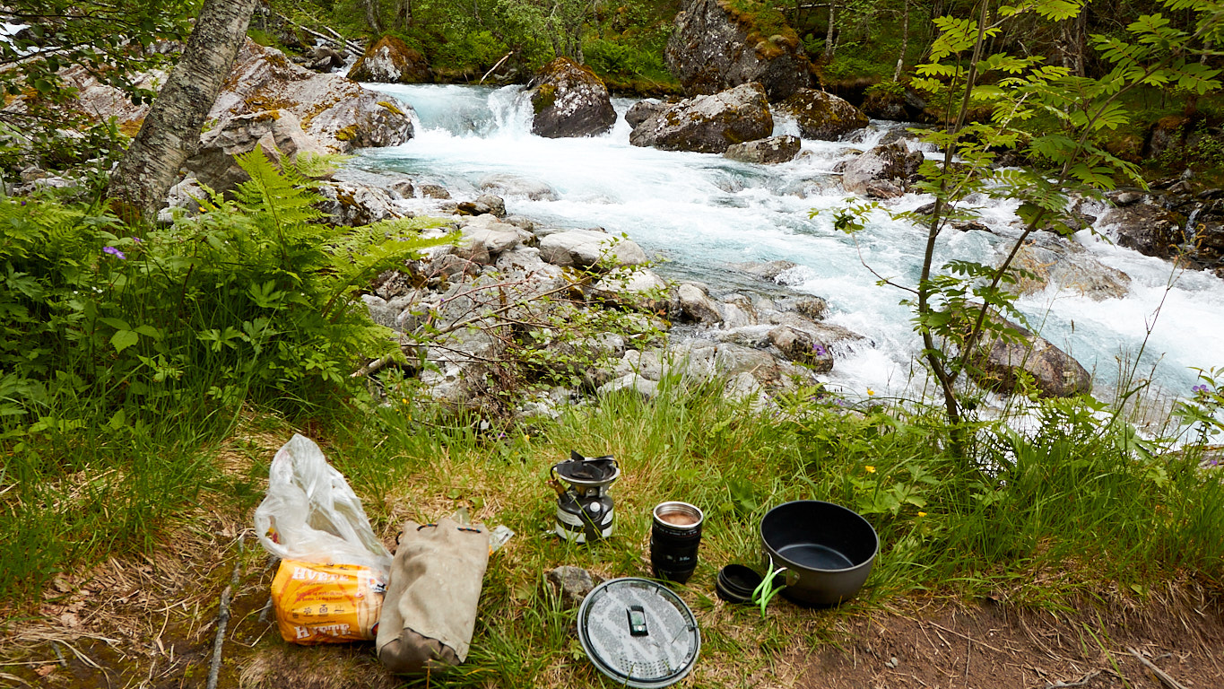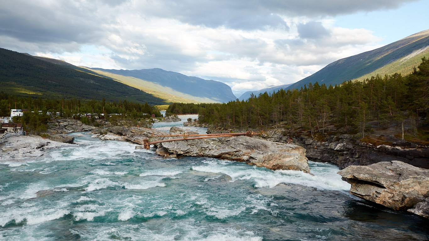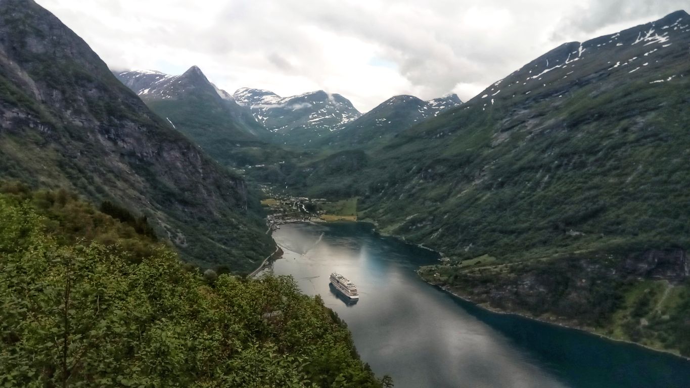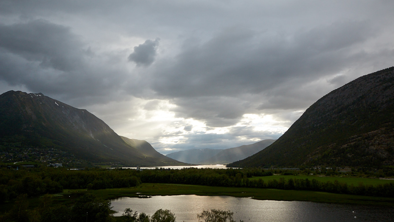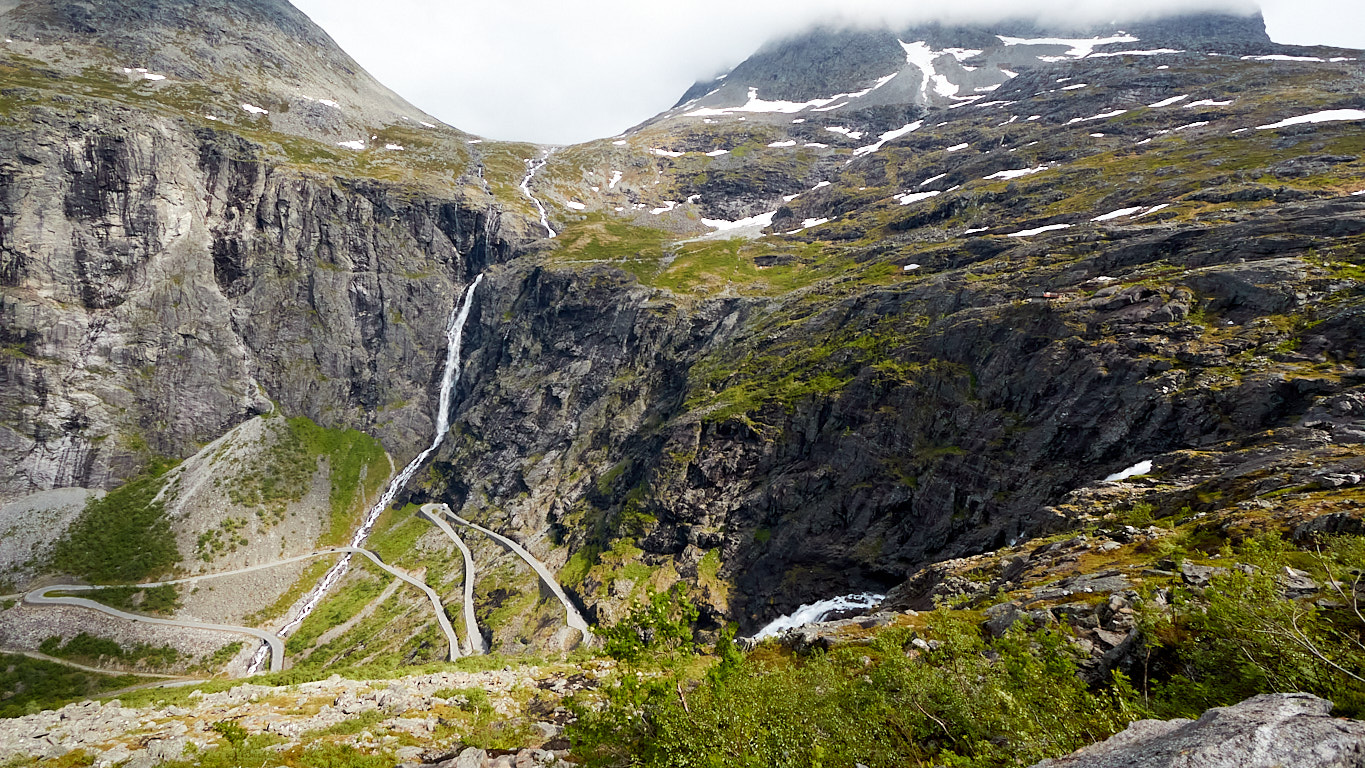 Letzte Nacht ging wieder an die Substanz. Zelt und Schlafsack sind nicht gut bei Erkältung. Alles für die Genesung kommt zu kurz. Nützt nichts, auch heute muß es weiter gehen. Dabei ist noch garnicht raus, wohin ich mich eigentlich bewege. Bergen wäre die kürzeste und schnellste Lösung. Ab auf die Fähre und nach Dänemark. Von da an wäre ich in zwei Tagen zu Hause. Oder doch zu Oliver nach Jørpeland, um die Schwungscheibe noch zu wechseln. Fragt sich nur, ob sich das noch lohnt. Mehr als die Hälfte der Strecke von Alta aus hätte ich weg, und bis heute Abend lief die Maschine wie ein Bienchen. Nur das blöde Öl tropft hinten am Motor gerne mal raus. Aber egal, welche Entscheidung gefällt wird, Trollstigen und Geiranger stehen noch auf dem Programm. Bis dahin liegen aber noch 3 Fähren auf dem Weg. Und genau wegen denen hab ich heute aber mal sowas von die Faxen dicke! Alle drei legen kurz vor meiner Nase ab! Was ich bei der dritten Fähre verlautbarte, kann ich hier nicht veröffentlichen. Aber es war laut! Der Spass kostet nicht nur Geld, sondern auch Zeit. Reisezeit. Eine Stunde etwa 60km. Und wenn du weißt, daß es abends regnen wird, dann bist du über jeden Kilometer froh, den du trocken fahren kannst. Und über eine Stunde Wartezeit ist dann ein Ärgerniss. Auch im Urlaub. Etwas pieselig erreiche ich Trollstigen von Norden her. Ein kurzes Picknick am Wegesrand zuvor, und dann ab durch die Mitte. Haha, kennt von den Lesern jemand Picknick am Wegesrand? Eins meiner Lieblingsbücher zu einem meiner Lieblingsfilme. Aber ich schweife ab. Trollstigen ist schön und fahrenswert, vor allem, wenn man hunderte Kilometer auf der E6 hinter sich hat, wo fahrerisches Können nicht so gefordert ist. Oben angelangt kommt man zur schönen Terrasse für die Touristen zum nach unten Gucken. Busse karren hier die ganze Zeit rum zwischen Trollstigen und Geiranger. Was ein Krauß. Ich spare mir die Plattform, mache aber kurz hinterher ein Stop, obwohl ich so recht fotomachwertes garnicht entdecken kann. Dafür steht ein Leipziger mit so einer modernen BMW da oben, und erzählt mir Sachen. Also so Sachen eben. Ein Foto muß natürlich sein von der AWO. Mit mir? Ja klar, warum nicht. Anschließend empfiehlt er mir seine Frau. Nein, nicht was ihr denkt. Sie arbeitet bei Fielmann im Zentrum von Leipzig. Ich weiß jetzt nicht so richtig, was er damit sagen will, aber statt nun zornig zu gucken bewahre ich weiterhin mein erstaunten Gesichtsausdruck. Unmittelbar schlägt ein finnisches Paar samt Harleys neben uns auf. Der Fahrer ist wie Kelle und will meine AWO fotografieren. Kein Problem. Mit mir? Schon wieder? Wie zerstört muß ich denn heute aussehen, daß die Leute mich in ihr Fotoalbum rein haben wollen? Der Finne, ein Rocker vom Club „haste nicht gesehen“, erzählt mir noch, sie haben ganz frisch geheiratet und sind auf Jungfernfahrt. Also irgendwie hat sie auch die ganze Zeit so geguckt. Aber ich schweife schon wieder ab. Auf zum Geiranger. Und kaum fresse ich die ersten Serpentinen in mich hinein, was sehe ich, das Albtraumschiff Aida. Das ist in den letzten zwei Jahren nun das dritte mal. Kommt man so ahnungslos und froh gesinnt ans Wasser gefahren, denkt, hier isset aber schön, und noch um die Ecke gekiekt, peng, Aida. Touristenauflauf heißt das. Aber ok, der Ort Geiranger macht auch genau den Eindruck auf mich, und ich verzieh mich ratzfatz auf der anderen Seite den Berg wieder nach oben. Und hier werden meine Sinne wieder gestreichelt. Eine Hochebe, Schnee, ein halb aufgetauter See, und kaum Menschen. Nach etwas nicht so glücklichen Momenten heute, fahre ich nun gut gelaunt wieder abwärts bis zur Rv15. Und komme an einen Punkt, wo ich eine Entscheidung treffen muß. Bergen oder Oliver, oder weiter im Text. Ich rede in mich hinein, frage Hals und Nase, ob sie immer noch ein auf Dicke machen wollen. Und ich habe das Gefühl, sie werden etwas kleinlaut. Es mag sein, daß ich morgen die Entscheidung bereue, aber ich entscheide mich für links rum. Lom mit Stabkirche und das Wasserkraftwerk Vemork wären die nächsten Ziele. Lom ist schnell erreicht. Ein kurzer Rundgang um die Stabkirche, welche leider nicht offen ist, und dann schnell zum Campingplatz 50 Meter weiter. Die ersten Tropfen fallen bereits. Weil ich gestern gratis campen durfte, nehm ich heute Hütte. Kost ja nüscht.