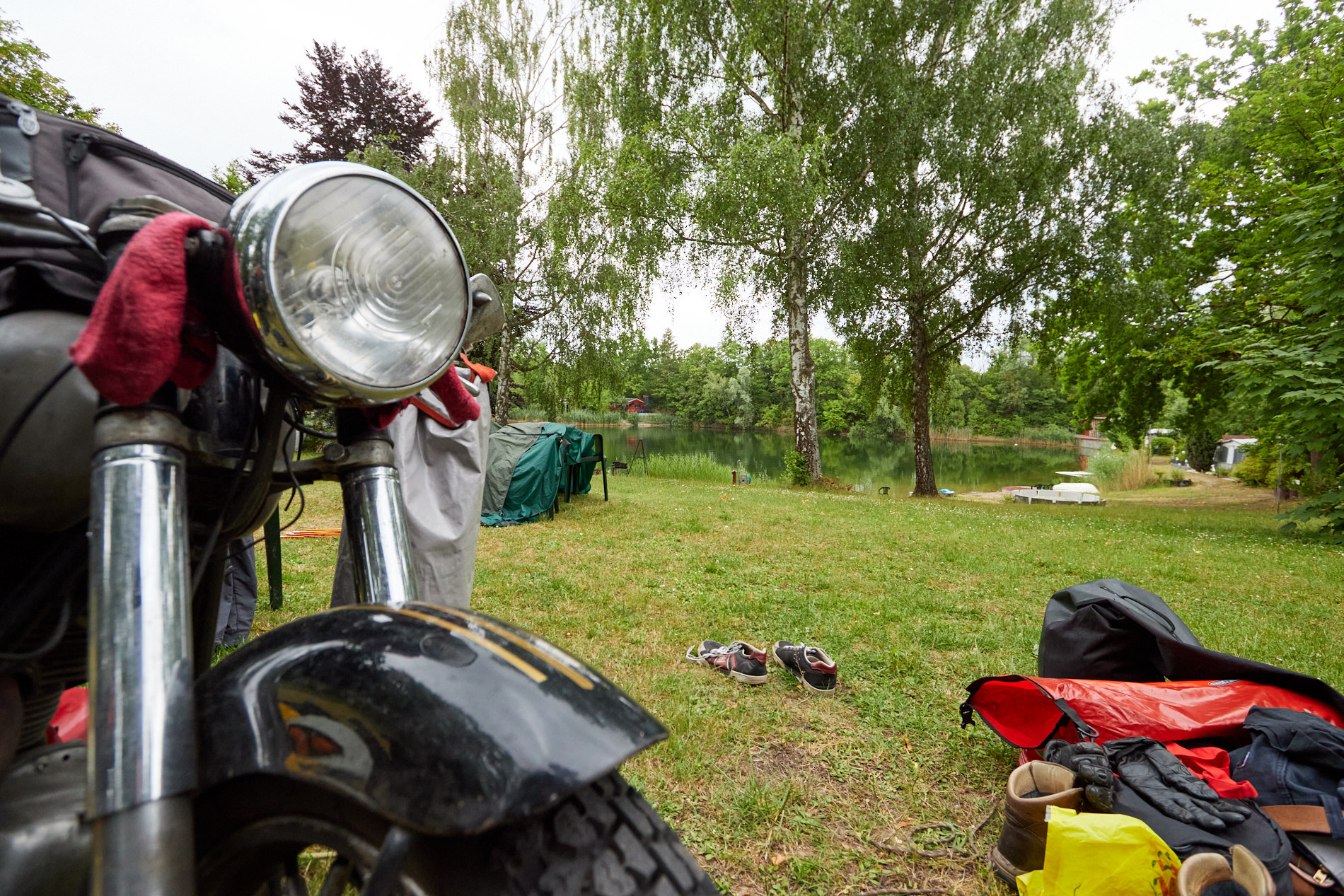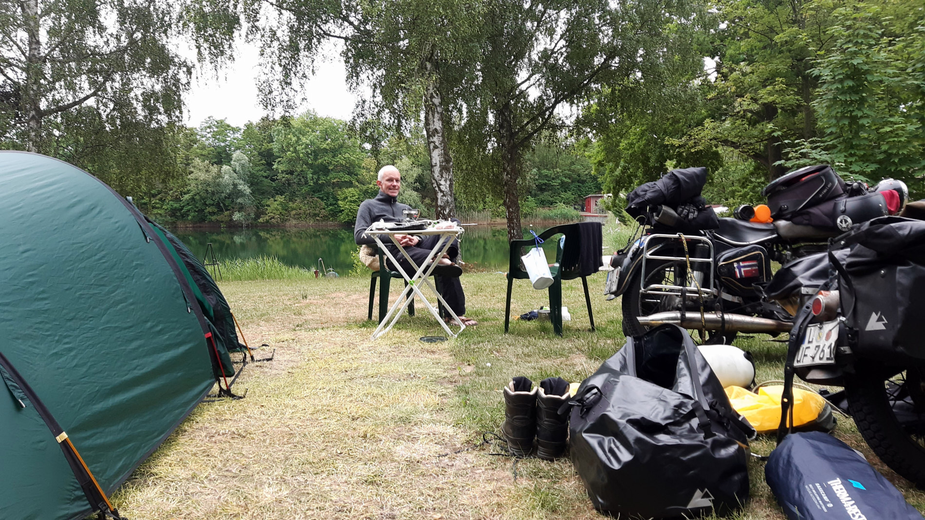Ach ja, nach Thüringen hat es nicht mehr geregnet. Bis Biblis blieben die Regenklamotten nur zur Sicherheit an. Den ersten leichten Schauer gab es erst wieder nach Zeltaufbau.