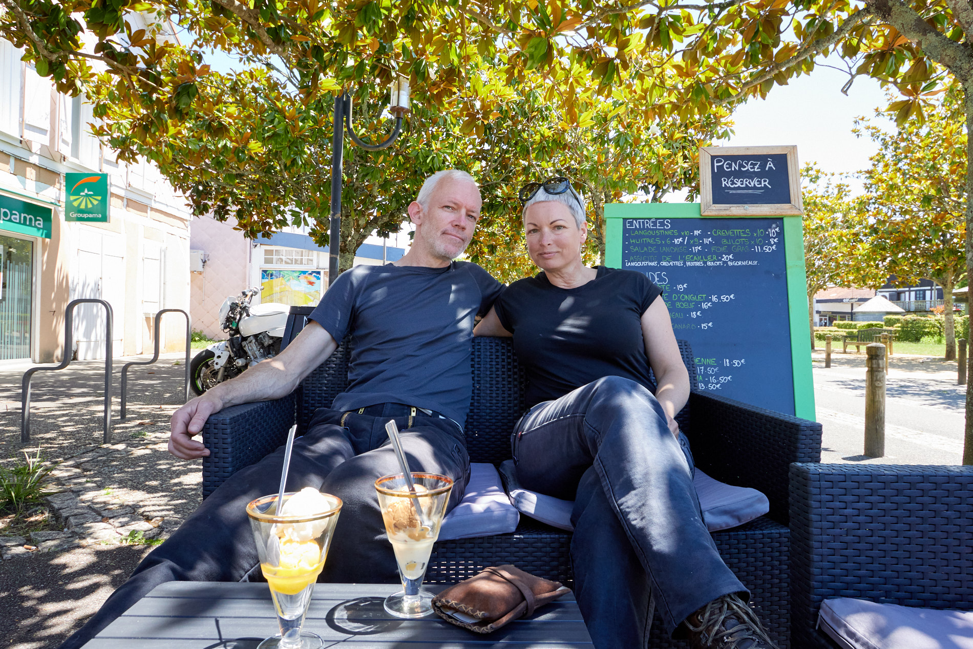 Sommersonnenwende. Um diese am Strand zu huldigen begeben wir uns heute ca. 70km weiter südlich nach Cap de L’Homy. Unspektakuläre Straßen, gezogen wie in einer Linie, dazu plantagenmäßiger Anbau von Kiefernwälder, in Reih und Glied. Der Landschaftsplaner hatte wohl nur Mindestlohn. Dafür haben wir uns kurz vorm Ziel unser erstes Eis in Frankreich gegönnt. Auch wenn es abends noch ziemlich frisch wird, aber tagsüber herrscht erträumtes Urlaubswetter. Wir decken uns mit Salami, Wein und und anderen leckeren Sachen fürs Wochende ein. Im Moment gehen wir davon aus, daß das Ersatzteil nicht vor Montag in Lons ankommt. Es wird also ein sehr gediegener Sonntag am Meer werden. Haben wir uns heute schon gegönnt. So richtig mit Ebbe und Flut und Sonnenuntergang. Und während wir der untergehenden Sonne hinterher schauen, auf halber höher zwischen Dünenkamm und Strand, fällt eine Junikäferarmada über uns und alle anderen Schaulustigen her. Poppen, wenn die Sonne weg ist. Werden sicher ja noch einige von früher kennen. Also die Junikäfer!