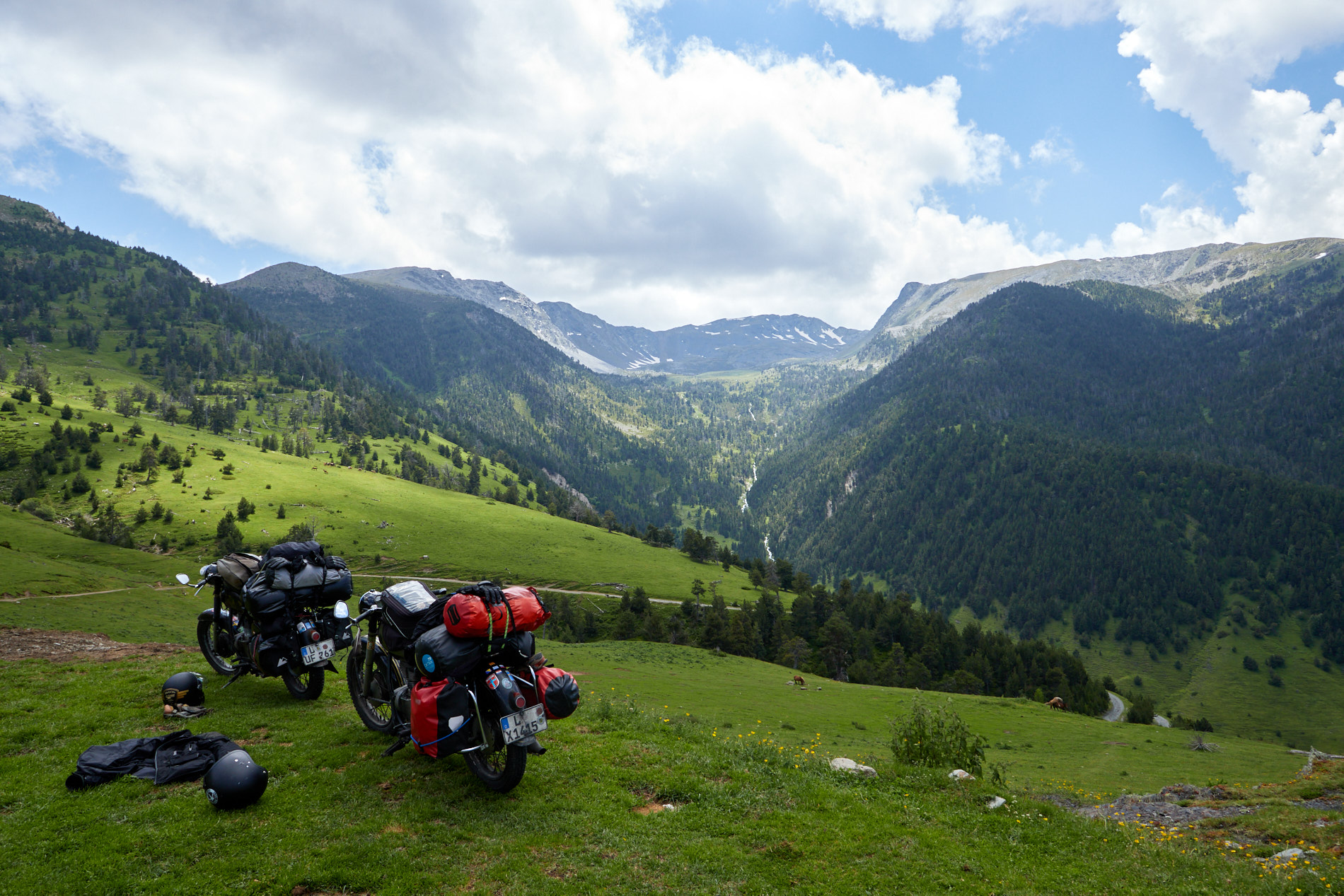 Spanische Tautropfen rinnen von der Zeltwand, als wir erwachen. Die Nässe vom gestrigen Regen weicht nur langsam, da die Sonne sich erst über die Pyrenäen schieben muß, und dicke Morgenwolken ihre Arbeit erschweren. Hier, in einem Tal eingerahmt zwischen Zweitausender auf der spanischen Seite der Grenzregion, hätten wir uns kaum 15 Stunden zuvor nicht wiederzufinden geglaubt. Wir danken im Stillen noch mal der Überredungskunst des franzsösischen Bikers vom Vorabend, der bei uns aber auch leichtes Spiel hatte und wir Spanien kurzerhand in unsere kleine Rundreise mit aufnahmen.