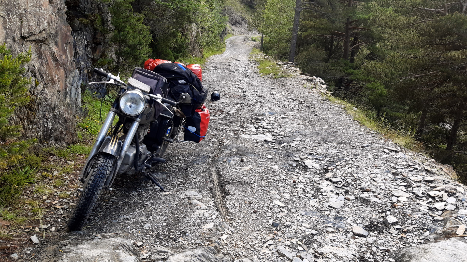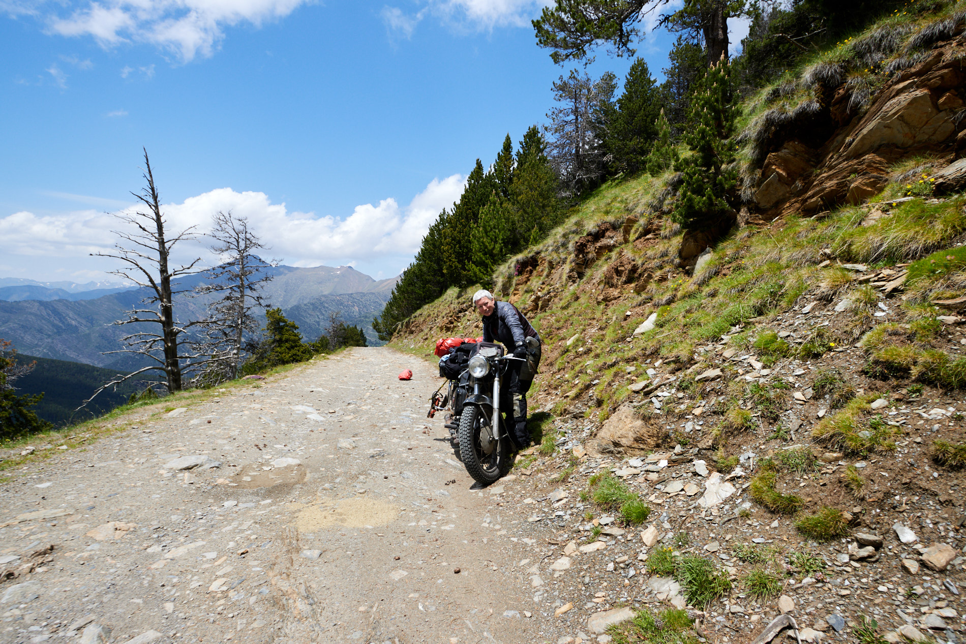 Am Ziel Andorra hat sich indes nichts geändert. Das Navi sagt uns heute Morgen ein paar Kilometer weniger als gestern Abend an. Aber ok, wird schon stimmen. Wir werden später erfahren, was es damit auf sich hat. Mein Motor macht in den Bergen leistungsmäßig Probleme, und die ersten Kilometer nutze ich noch, um die ein oder andere Hauptdüse zu wechseln. Irgendwas zwischen „geht so halbwegs“ und „geht noch beschissener“ kommt raus. Um im Zeitplan zu bleiben, belasse ich es bei kleineren Spielereien und wir biegen von der großen Hauptstraße ab in ein Nebental. Schau an, das Navi kennt wirklich einen kürzeren Weg als die große Hauptstraße nach Andorra. Nach einigen Kilometern biegen wir wieder ab. Neues Nebental, noch kleinere Straße. Aber hübsch. Direkt an einem rauschenden Gebirgsbach schrauben wir uns die Berge hoch. An einer Art letzter Rastplatz wandelt sich die Straße zu einem steinigen Waldweg. Sofort glauben wir ein Déjà-vu zu haben: die Panoramastraße in Albanien 2018. Die Erfahrung von damals lässt uns zunächst unbeirrt weiter fahren. Der Schwierigkeitsgrad ist nun aber locker im gelb-orangenen Bereich. Und was wird noch kommen an Steigung und Zustand des Weges? Zunächst einmal kommt wie aus dem Nichts eine kleine Ansiedlung mit Herberge und Bewirtung. Ein paar alte Steinhäuser, wie sie typisch sind für die Gegend, schmiegen sich in eine etwas breitere Stelle des Tals. Zusammen mit dem Gebirgsbach ein sehr romantisches Bild. Wir nutzen die Gelegenheit zu einem Kaffeestop und erkundigen uns bei der englisch sprechenden Wirtin, ob unsere Idee, mit solch alten Vehikeln den Pass nach Andorra zu erklimmen, nicht an debiler Geistesschwäche grenzt. Sie sagt ungefähr: „sure, slowly, not a problem“. Sicher, hoch rasen wollten wir sicher nicht, aber ein bißchen frage ich mich schon, ob sie die Geländegängigkeit unserer Maschinen und den Zustand des Gebirgsweges richtig in Bezug setzen kann. Trotzdem tanken wir aus ihrem Optimismus neuen Mut und setzen unsere Fahrt fort. 7 Kilometer steinige Piste. Bis zum Pass. Und keiner weiß, wie sich der Weg in Andorra gestaltet. Mit jedem weiteren Höhenmeter steigt der Level. Ich stoße mit der ohnehin mickrigen Leistung immer öfter an die Leistungsgrenze, da ich drehzahlmäßig nicht richtig auf Touren komme und selbst der 1. Gang große Mühe hat, das Muli am Laufen zu halten. Und dann passiert es. Die Nässe und losen Geröllsteine zwingen uns steil bergauf zum Halt. Schnell den Seitenständer raus, Gang rein, und AWO abgestellt. Ich renne vor zu Anke, die die ganze Zeit Führungsarbeit leistet und helfe ihr beim abstützen. Ohne Aufsitzen, mit Gas und Kupplung, ich am Lenker und Anke schiebend, bringen wir beide Maschinen unter großer Mühe ein paar Meter höher, wo ein Fahren wieder möglich ist. Oft dürfen solche Passagen nicht mehr kommen, denn ausgelaugt kommt man auch bergab solche Pisten kaum heil runter. Es sollte aber die einzige Situation bleiben, in der es echt haarig wurde. Lediglich bei der Überquerung eines Gebirgsbaches überlässt Anke mir ihre Maschine, weil längere Beine im rutschigen Bach vielleicht doch eher Halt finden. Den Großteil der Strecke haben wir hinter uns, als sich plötzlich eine große Almwiese mit Pferden auftut und den Blick auf schneebedeckte Gipfel der umliegenden Berge frei gibt. Der Weg bis zum Pass gestaltet sich im Vergleich zu den vorigen Kilometern schon fast spielerisch. Und doch, im Rückspiegel ist Anke plötzlich nur noch ganz klein. Ich stelle meine AWO ab und eile zu Fuß den Weg hinunter. Gepäck verloren, aber umgehend gemerkt. Keine Abfahrt nötig, und der Pass ist bereits in Sichtweite. Und dann ist es soweit, wir befahren Andorra. Und wie ein Geschenk Gottes, wandelt sich dieser steinige Gebirgspfad in eine asphaltierte und leitbeplankte Bergstraße. Aalglatt! Wir schauen uns kurz an und denken kurz darüber nach, umzukehren. Jetzt, wo man oben steht, hat das ein Haufen Gaudi gemacht, und nun soll man so eine langweilige Asphaltpiste befahren? Ja, denn wir wollen Andorra kennen lernen. Bevor es ins Tal geht, geniessen wir den herrlichen Ausblick auf ein großes, grünes Tal, daß schon fast etwas märchenhaftes hat inmitten der rauhen Berge. Von der andorrischen Zivilisation ist hier oben jedoch nicht viel zu sehen. Und an dieser Stelle müßen wir auch anmerken: wir haben, sollten wir nicht jemals steuerhinterzieherische Ambitionen hegen, niemals wieder vor, Andorra einen Besuch abzustatten. Ganz Andorra scheint durchzogen von Schickimicki-Läden und Restaurants, viel zu breiten Straßen in Gemeinden mit unsäglicher Tourismus- und Finanzarchitektur. Man weiß sofort, wer hier Urlaub macht und „lautere“ Finanzgeschäfte tätigt. Als wir am Pas de la Casa wieder franzsösischen Asphalt befahren, schauen wir noch mal kurz zurück und schwören, dieses kleine „arme“ Land so schnell nicht wieder zu besuchen. Die rauen Berge der Pyrenäen wandeln sich nun wieder zur Landschaft mit mittelgebirglichem Charakter. Wir steuern Carcassonne an, um eine der größten und besterhaltenen Festung Europas in Augenschein zu nehmen. Aber zunächst schlagen wir 30km zuvor unser Zeltlager an einem Campingplatz auf, den wir unter normalen Umständen sicher gemieden hätten. Großer Pool mit terrassenförmigen Liegemöglichkeiten und „hochwertigem“ Unterhaltungsprogramm. Der richtige Platz für Camper, also die mit den fetten Wohnwagen, die auch sonst zu doof sind, sich mit Natur zu beschäftigen. Die Kinder dürfen bis Mitternacht grölen, und als diese wohl aus eigener Erschöpfung endlich zu Bett gehen, dröhnt vom Restaurant Discomusik herüber. Wir sind nach dem anstrengendem Tag genervt, und geraten selber noch aneinander. Der Tag hat sehr schön, aber auch kräftezehrend begonnen. Dem müssen wir am Ende des Tages Tribut zollen und gehen ohne Gutenachtkuss zu Bett.