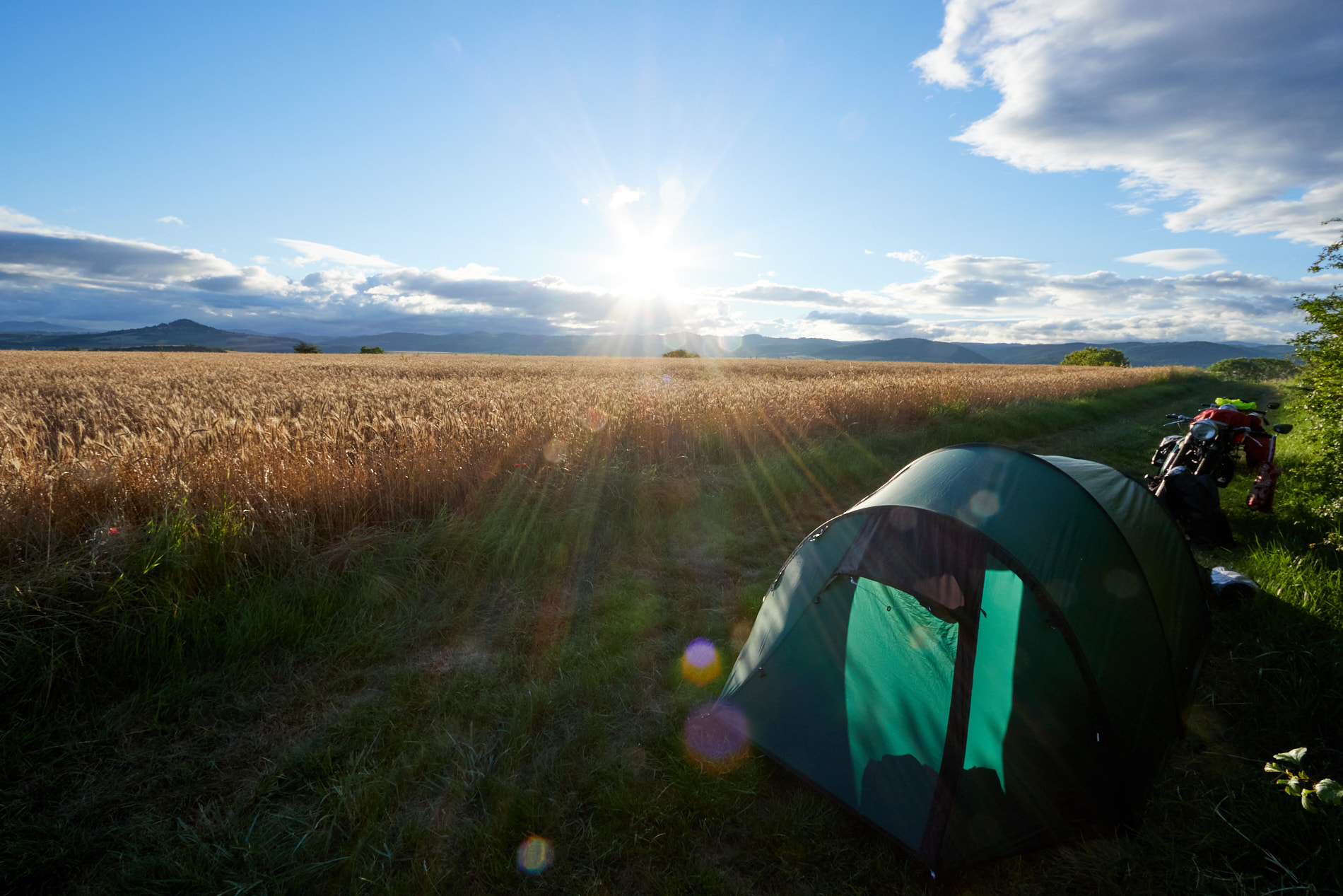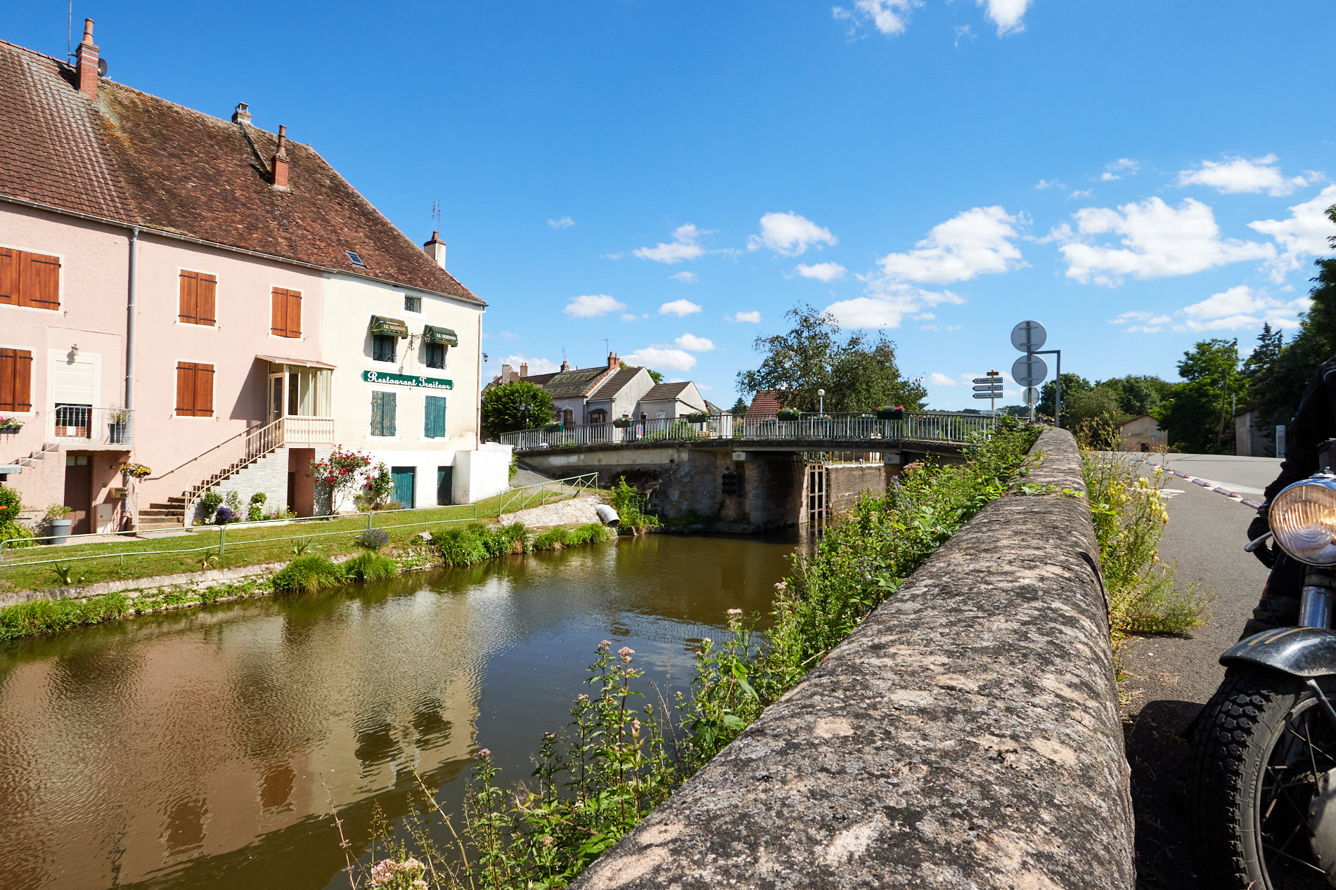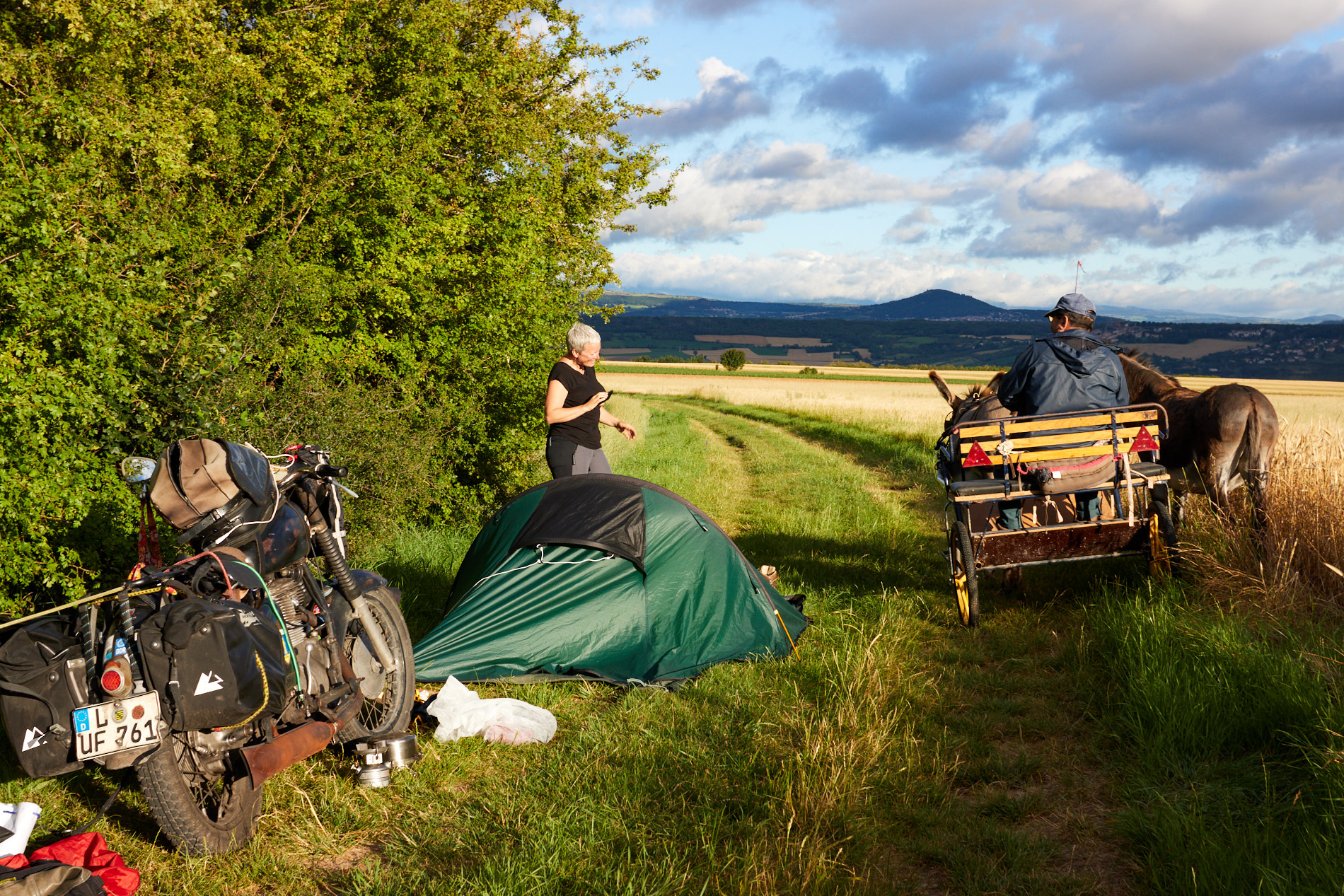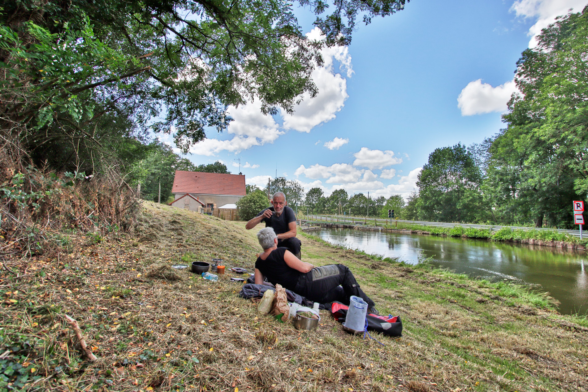 Bonjour! Das war mit Abstand die beste Penne des Urlaubs. (Irgendwie habe ich gerade die Guten-Morgen-Melodie vom Bergsee Ratscher im Ohr (Aufsteh’n ist schön von Johanna von Koczian). Aber hier und heute nur ein paar Naturgeräusche. Leiser Wind und Vogelgezwitscher. HERRLICH!!!! Und die nächste Straße ist auch ein Stück entfernt. So prima wie heute Nacht haben wir beide lange nicht geschlafen. Marcel ist vor mir draußen und ich höre, wie er ziemlich entrüstet und laut „Das glaub ich jetzt nicht!“ von sich gibt. Neugierig bin ich auch gleich neben ihm und starre in dieselbe Richtung. Da begehrt ein Eselkarren Durchlass. Na da müssen wir mal kurz zusammen rutschen, wir haben den Weg ziemlich verstellt. Lachend zieht der Kutscher durch und wir fotografieren ihn. Später sehen wir ihn nochmal kurz auf der Straße, das war wohl seine Trainingsrunde. Wir packen nach dem Frühstück alles zusammen und versuchen den Platz so zu verlassen, als wären wir nie hier gewesen. Weiter gehts durch das französische Thüringen. Auf den Weiden stehen wunderschöne Rinderherden mit jeweils ihrem Bullen. Sowas Schönes hab ich noch nie gesehen. Sind die riesig und muskulös. 220 Kilometer später erreichen wir Montceau-les-Mines, nachdem ich mein Navi alias Handy wegen Anwenderfehlers am liebsten aus dem nichtvorhandenen Fenster geworfen hätte. Die Bäckersfrau der ansässigen Boulangerie verkauft nicht nur Baguette, Steppe sucht sich die allerschönsten Törtchen aus, dann fragen wir sie noch, ob sie unseren Wassersack befüllen würde, macht sie natürlich. So gut ausgerüstet verabschieden wir uns von ihr und Marcel ist ein bisschen verliebt in sie oder die tollen Backwaren, wird fast nicht fertig mit Komplimenten, die Bäckersfrau freuts. Zurecht. Wir suchen uns einen schönen lauschigen Platz am Canal du Centre und kochen uns Käffchen und schauen den Libellen beim Liebesspiel zu. Gut ausgeruht gehts weiter, denn mein Monsieur sagte gestern schon, dass wir mehr Kilometer machen müssen. Aye Sir. Ein Stück begleitet uns noch der Canal du Centre, dann trennen sich unsere Wege. Marcel hält mal wieder an einem Chateau an und würde am liebsten dort das Zelt aufschlagen, aber es zeigt sich niemand, den man hätte fragen können. Also befragen wir unsere schlauen Handys, ob es in der Nähe einen Tipp zum wild campen gibt. Gibts als App. Südöstlich von Dijon wird eine ausgewiesen „Swan Lake“. Nur noch 20 Kilometer. Na den krallen wir uns. Wirklich schön ruhig gelegen, kein Verkehr, kaum Besucher, ein Schwanenpaar auf dem See und eine Million Frösche. Uns egal. Wir kühlen uns im warmen See ab, die Hängematte baumelt, mit der Dämmerung bauen wir unser Zelt auf und lauschen dem Konzert der Quaker. Bonne Nuit!