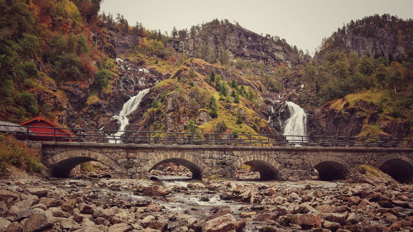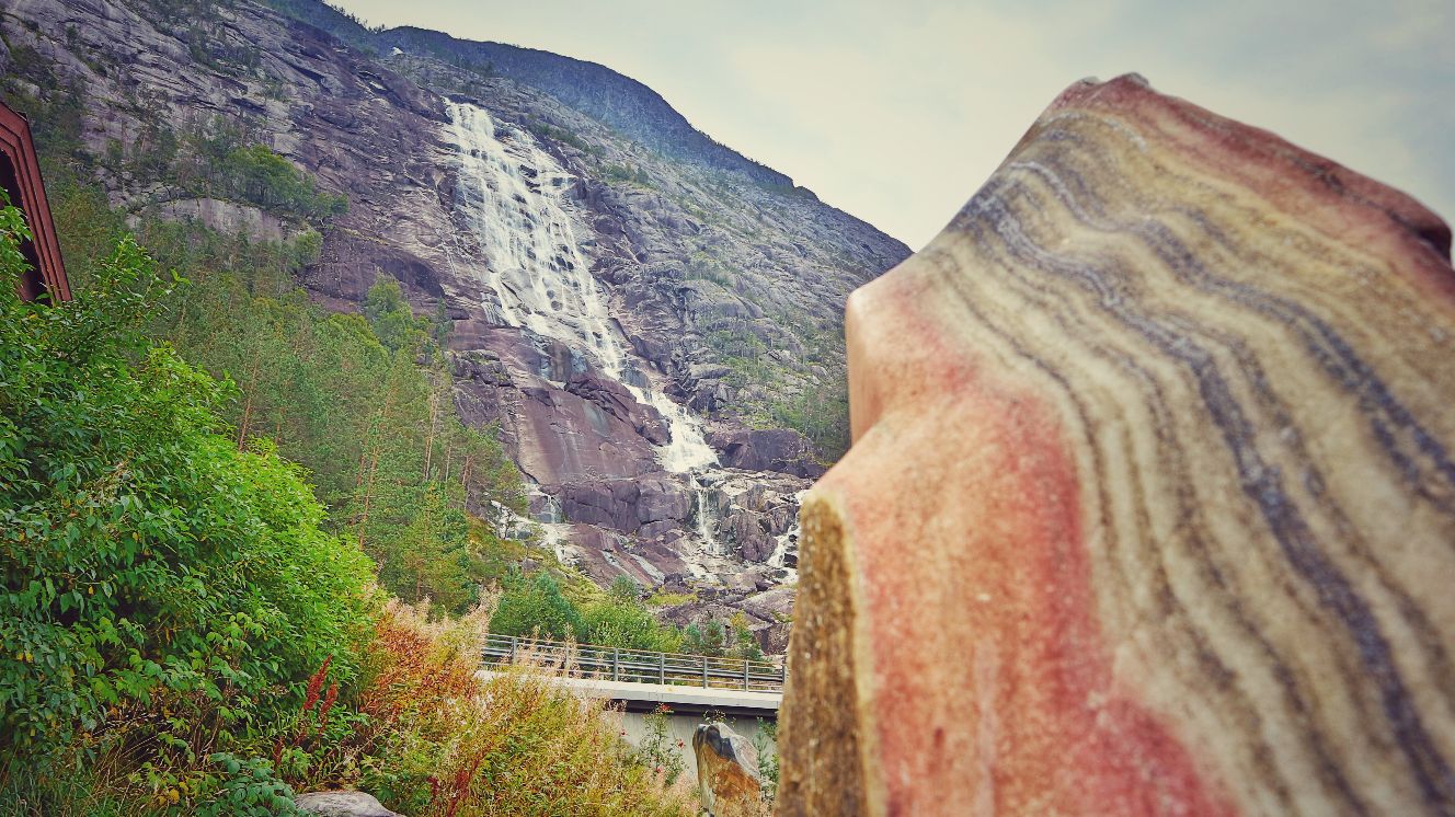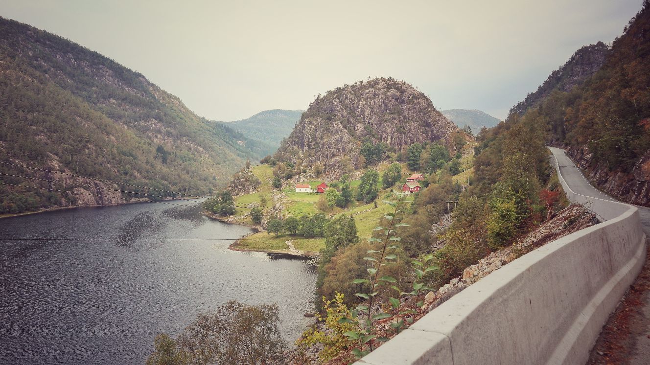 Der Plan sieht vor, auf nach Odda Camping, mit dem Shuttle zum Parkplatz an der Talsperre (da bei Tyssedal den Berg nuff), und dann den 11km langen Weg hoch zur Trolltunga bewältigen. Alles an einem Tag! Geht also damit los, eine schöne Strecke auszusuchen, was ja in Norwegen bekanntlich kein Problem ist, und die knapp 300km durch die Fjorde zu genießen. Kurz noch ins Vikedal abgebogen und abseits jeglicher Touristen mein Picknick gemacht. Absolute Stille, nur der See, die Berge, und ich. Und der Typ 100m weiter, der seinen Traktor mit dem Vorschlaghammer bearbeitet hat. Thats life. Am Langfossen halt gemacht, der mit seiner 612 Metern Fallhöhe zu den höchsten Wasserfällen der Erde gehört. Heute ein eher gemächlicher Wasserfall, aber wer mal bei youtube schaut, wenn da richtig das Wasser runter kracht – uiuiui. Kurz vor Odda noch am Låtefossen Halt gemacht. Jupp, auch ein Wasserfall. Ein Zwillingswasserfall. Eher was touristisches, obwohl, ein weltgeschichtsträchtiger Punkt ist es dann doch. Hier ist Gustav von Hahnke mit seinem Fahrrad in den Bach gefallen und ertrank. Gustav war Leutnant zur See und schipperte zusammen mit Kaiser Willhelm auf der Hohenzollern nach Odda zur Sommerfrische. Das nur am Rande.