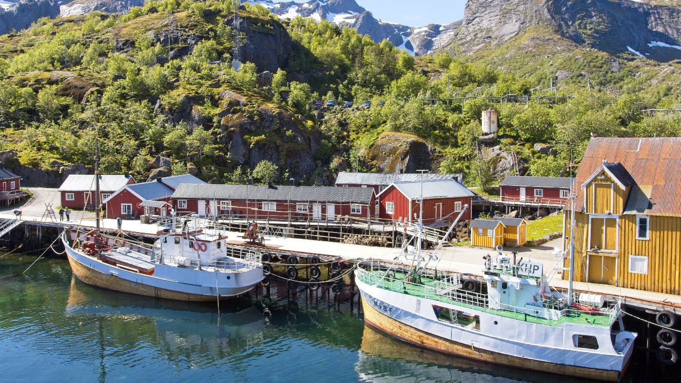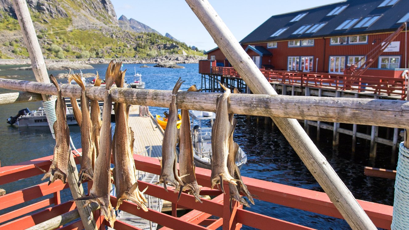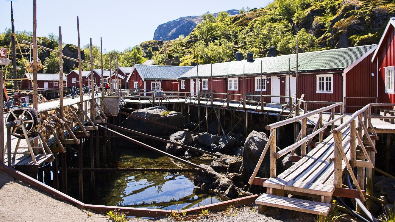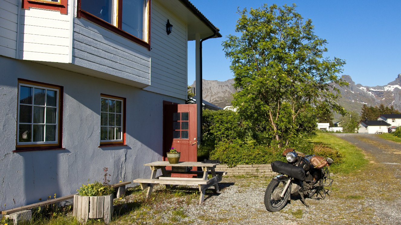 Bernde hat mir zwischenzeitlich mit Nachdruck durch eine kleine Transaktion die Brygge in Å empfohlen. Da der Tag vom Wetter her heute einer der besseren ist, beschließe ich, den Süden der Lofoten im Downtempo durchzumeandern. Å, Reine oder auch Nusfjord sind dafür beste Anlaufpunkte. Leider schließt die bekannte Bäckerei in Nusfjord 20 Minuten vor offiziellem Ladenschluß, und ich steh zum zweiten Male vor verschlossener Tür. Ja, gestern auch schon, aber da war es auch schon nach 18 Uhr. Macht nichts, in der staatlich-norwegischen Museumsbäckerei schräg gegenüber wird auch gut gebacken. Überraschenderweise wird mir im sächsischen Dialekt Ware feil geboten. Alle Angestellten sind Deutsche im Auftrag des norwegischen Staates. Mir solls Recht sein, denn der Kuchen schmeckt vorzüglich. Und tut der Hals noch so weh, Kuchen geht immer. Nachdem ich fototechnisch auch den südlichen Landstrich der Lofoten zerknippst habe, mache ich mich wieder auf die Suche nach einem Zimmer oder Hütte. Und nun wird ja der Hund in der Pfanne verrückt. Ausgerechnet heute im angeschlagenem Zustand bekomme ich in Fredvang ein Zimmer. Kvalvika-Bay ist quasi um die Ecke rum. Ich ringe mit mir, lasse es dann aber doch dabei bewenden. Die Bucht kommt dran, wenn ich mal wieder gesund hier oben auftauche. Brauch ja noch ein Ziel fürs nächste Mal. Immer dringender und kaum noch aufschieben lässt sich ein anstehender Wechsel meiner kompletten Bereifung. Das Hinterrad wandelt sich immer schneller vom Klassikprofil zum garnicht so Klasse Slickprofil mit bereits kleinen Rissen in der Decke. Sehr ungut! Der Vorderreifen hat noch Profil, eiert aber merklich ungelenk durch die Kurven. Es ist Freitag Nachmittag, noch etwas Zeit zu schauen, obs nicht auf den Lofoten doch wundersamerweise eine 18-Zoll-Bereifung gibt. Völlig egal was, Hauptsache es hat Profil und passt zwischen die Schwinge. Doch wo gucken? Hab doch gestern die Amischlitten gesehen und pelze dort noch mal hin. Die machen sogar mit Gummis, aber nichts in meiner Größe. Aber Norweger sind hilfsbereit und wimmeln nicht gleich ab. Ein kurzer Anruf, und, ja, einmal Hang abwärts, erstes Haus mal melden. Flux runter gerollt, und da steht der Meister auch schon mit einer Pelle in der Hand. Sieht mein Motorrad an, und verzieht das Gedicht. Ich auch. 4 Reifen hat er da, aber nix passendes. Aber wie eine Station vorher schon, man ist hilfsbereit und schmeißt die Körner nicht gleich vor die Flinte. Und der Meister zieht aber mal richtig Kreise. Anstatt mir eine Telefonnummer zu geben, wo ich mal fragen könnte, macht er das gleich selber. Denn er hat selbst sofort gemerkt, norwegisch hab ich geschwänzt, und englisch immer beim Falschen abgeguckt. Er fängt also mal ganz lokal an mit den Kontakten von Freunden und Bekannten. Ist anschließend in Bodø af dem Festland, bei Händlern und MC’s, und landet schließlich in Trondheim. Das ist weit, ca. 700km, aber ein ziemlich sicherer Hafen für neue Reifen. Wow, ich danke ihm für die ganzen Telefonate. Aber das war noch nicht alles. Er bemerkt, daß ich die falsche Fährkarte gekauft habe für den nächsten Tag. Ich würde Inselhopping über 6 Stunden machen. Er ruft wieder an. Ich soll 11 Uhr am Hafen stehen und die Direktverbindung nach Bodø nehmen. War der Käpt’n am anderen Ende. Ich solle mich in die erste Reihe stellen, und wenn einer fragt, den Namen vom Käpt’n nennen. Mir bleibt ein bißchen die Kinnlade hängen und ich verabschiede mich mit einer kleinen Dankesorgie Richtung Fredvang. Ich nutze die Abendsonne und windstille Abgeschiedenheit meiner Herberge und gönne mir noch etwas Wärme auf mein Antlitz.