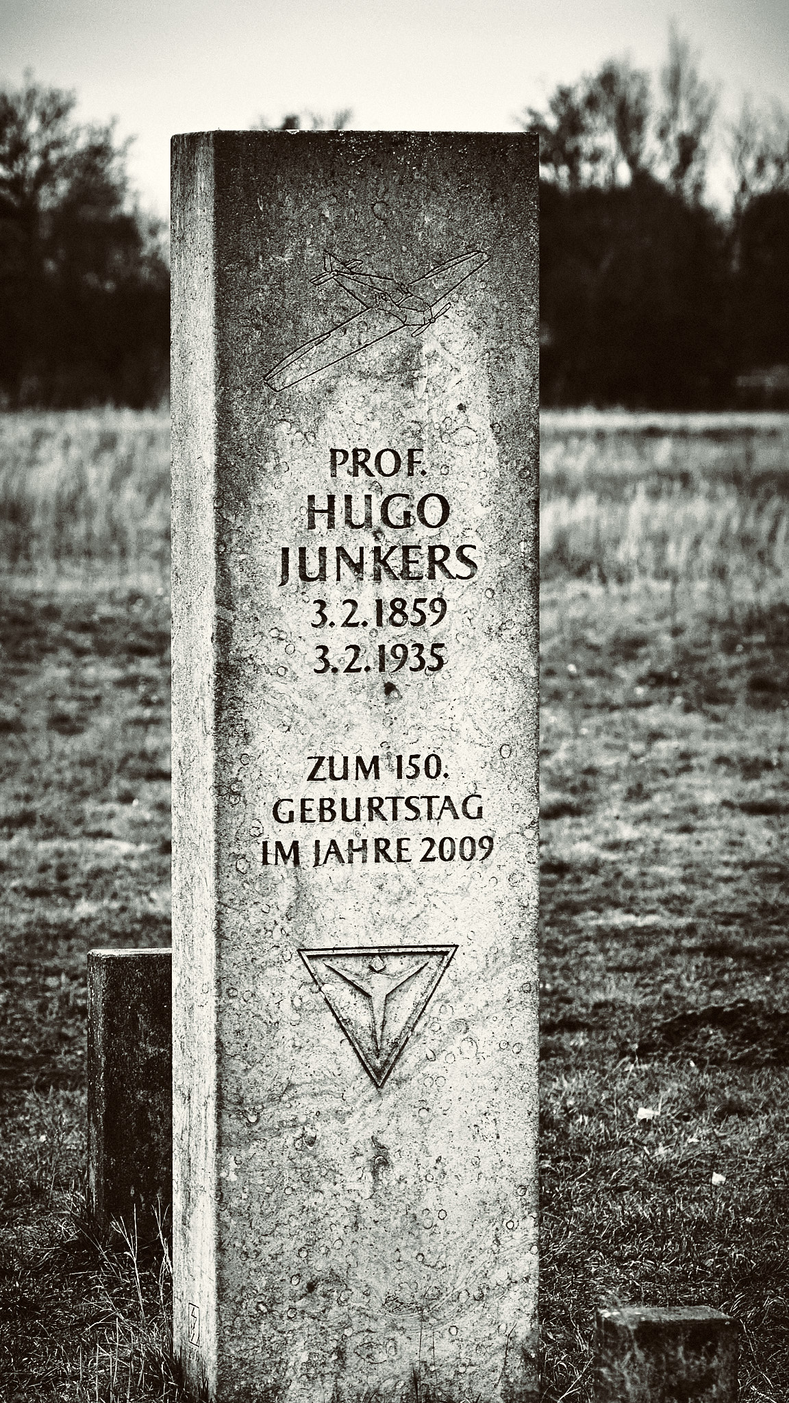 Das ein Gedenkstein an Hugo Junkers hinterm Gebüsch hinter einem Teich verloren am Stadtrand steht, erschließt sich ebenso wenig. Sei es drum, Dessau halt.