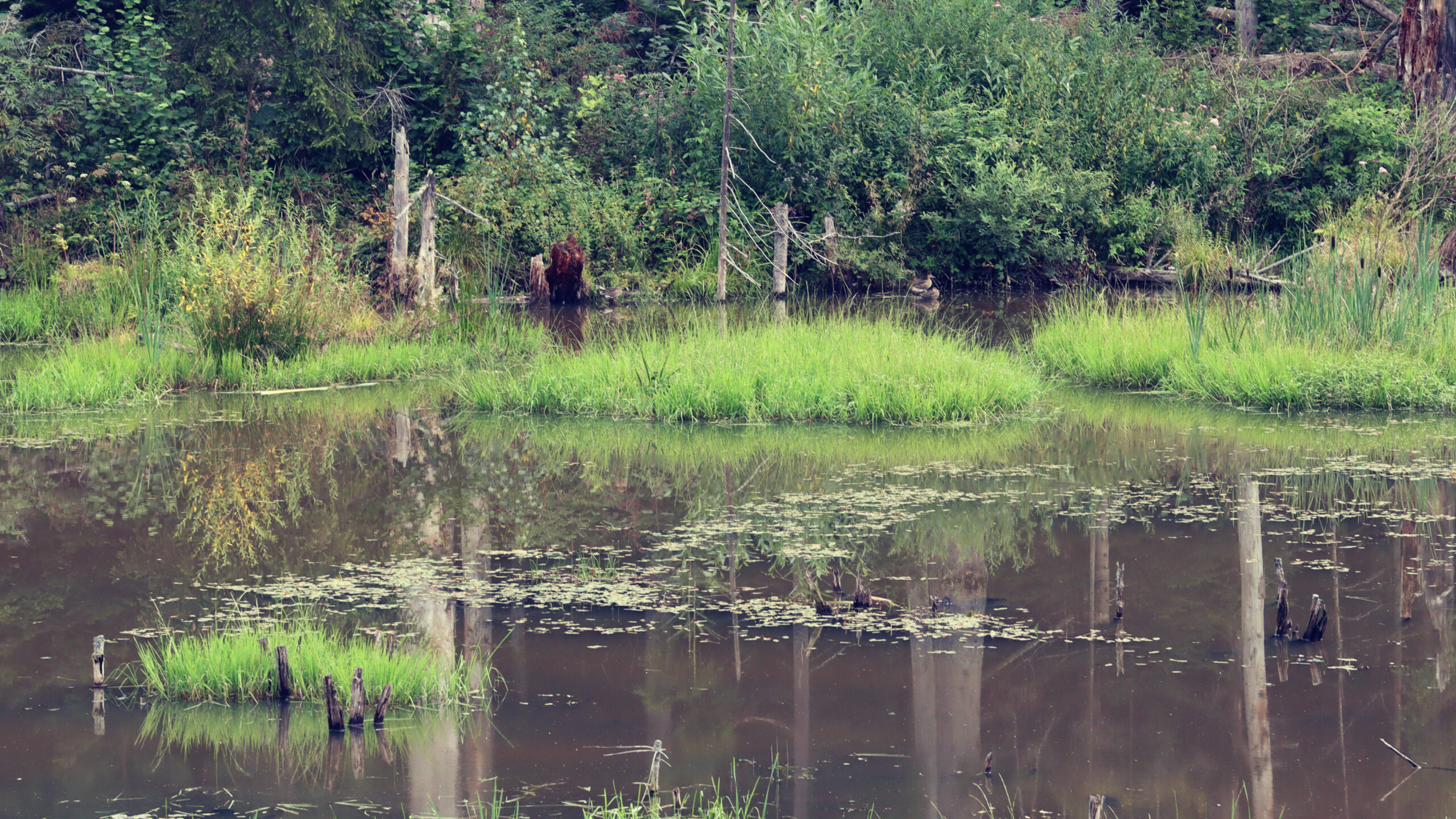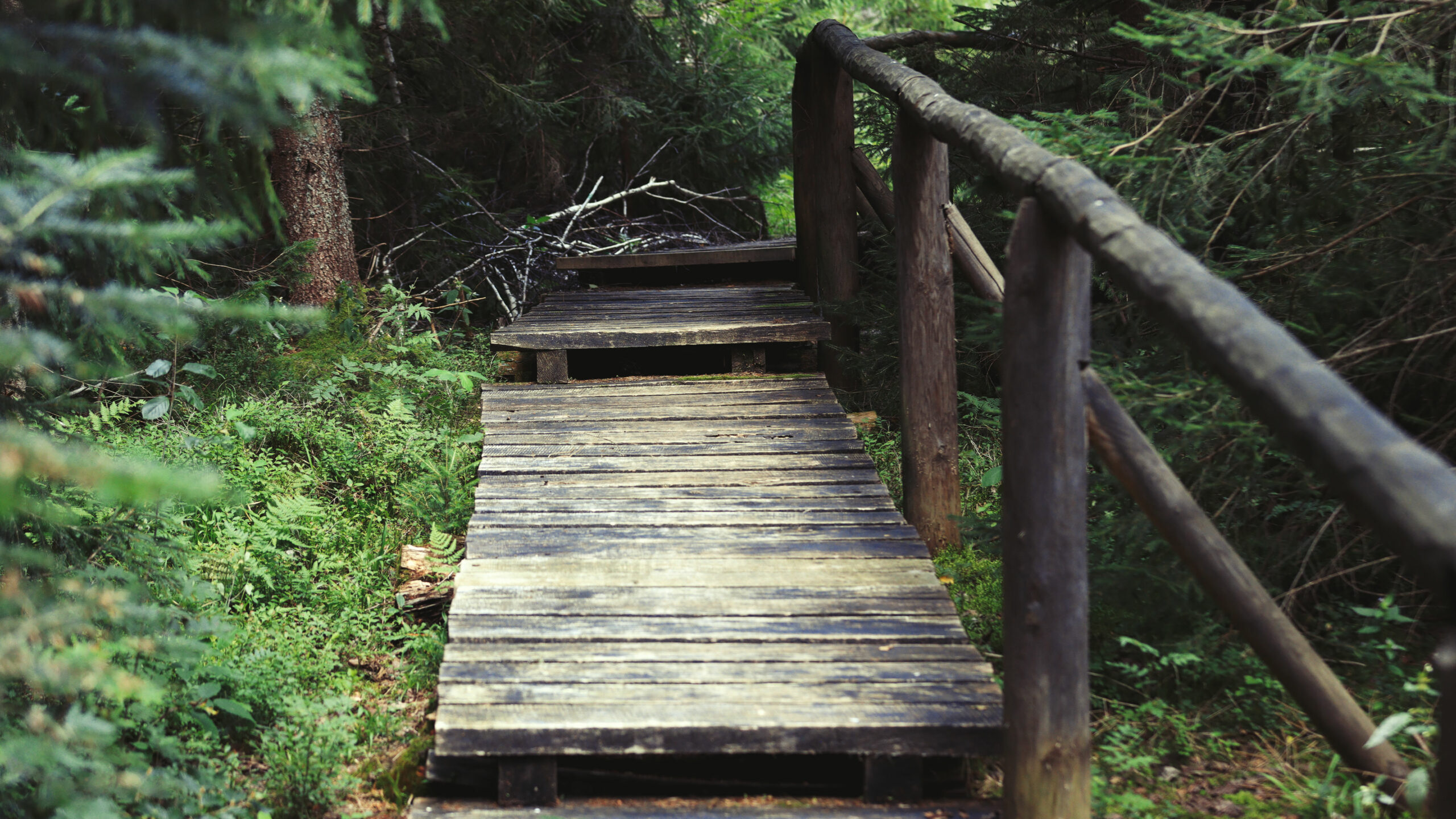 Weiter gehts durch dichten Wald und beim Weg muß man schon genau hinschauen. Ich lese Spuren und spitz die Ohren. Ich hab Muffensausen! Warum? Es ist ein Naturreservat, und – die Fotos im Aufenthaltsraum beweisen es – es gibt hier Bären. Mich Durchschnittszivilisten mit zunehmend grauen Ohren und tauben Augen ist die Sache einfach nicht geheuer und bei jedem Knacken aus dem Dickicht guckt der Kupferbolzen. Nur nicht wegrennen, denke ich. Nach wenigen Kilometern lockert sich die Vegetation und die Anspannung in mir. Ich komme auf einen typisch für Grenzregionen idyllischen Plattenweg, der das Laufen aber nicht angenehmer macht.