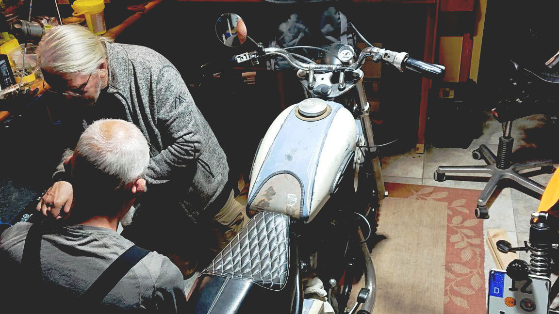Nach einem gemütlichem Frühstück sammelt Volker uns ein für eine kleine Werkstattrunde bei ihm. Auf dem Weg dahin lade ich mein Vorderrad zum Pellenwechsel beim Pellenwechselservice zur Runderneuerung ab, da ich mir den letztjährigen Wechselspass auf Strecke diesmal ersparen möchte. Volkers Mopete wird von vorn bis hinten gecheckt. Hier und da was festziehen, Ölwechsel, so halt das übliche. Zum Mittag gehts noch mal zum Bistro, lecker Currywurst fassen und dann zurück zum Eckotel. Die Aufregung steigt nun langsam. Es wird nun reichlich getestet, wie und wo welche Taschen an den vorgesehenen Haltevorrichtungen die geringste Chance haben, während des Tournament Norwegen sich aus dem Staub zu machen. Am Abend steige ich noch mal kurz auf Andres „Königin“, seiner 350er Sport, um einen letzten Check zu machen, ob soweit alles läuft. Nach nicht mal 1000m wandelt sich meine Vorfreude auf Norwegen in ein „kann noch ein interessanter Abend werden“ um. Die Maschine hat so viel Bumms, wie ein ausgelutschtes Lutschbonbon, mit der schon im dänischen Hochland Probleme kriegen würde. Was nun folgt, kenne ich aus eigener Erfahrung zu Genüge. Ich hab auch schon ein Tag vor der Angst Motoren, Getriebe, Schwingen getauscht. Es wurden immer lange Abende in der Werkstatt und man kam erst nach Mitternacht ins Bett. Eigentlich wollte man doch nur in Ruhe packen. Nun, es lief auch an diesem Abend nicht anders. Obwohl, doch, es lief immer bescheidener. Denn je näher Mitternacht rückte, um so mehr festigte sich die Gewissheit, die „Königin“ ist in dem Zustand nicht für Norwegen zu verwenden. Während ich bei meinen eigenen Basteleien Licht am Ende des Tunnels sah, wußte ich um Mitternacht nicht, wie ich Andre mitteilen sollte, daß ich eine ganz schlechte Nachricht für ihn hatte. Stand Mitternacht ist die Maschine nicht fahrbar und Norwegen würde somit für ihn ins Wasser fallen. Dabei war es sein Geburtstagsgeschenk, betreutes Fahren durch norwegische Traumlandschaft. Bernd, Andre und ich, nach all den Arbeiten am Vergaser und Testfahrten mächtig nach Benzin stinkend, guckten uns ratlos an, und hatten doch alle die letzte mögliche Rettung praktisch auf den Lippen: „Lasst uns die Ratte vorholen!“ Andres Eigenbau war überhaupt nicht vorbereitet, sondern lediglich für den Tüv zusammen gebaut. Auch hier stimmte der Vergaser nicht. Nach Mitternacht Einstellfahrten zum Teil im Wohngebieten zu machen, entbehrt schon gewisser Vernunft, aber selbige steht bei solchen Vorhaben eh nur im Weg. Gegen halb zwei am Morgen haben wir eine fahrende Luftpumpe auf die Räder gestellt, auf dieser Andre es wenigstens probieren sollte, das Abenteuer Norwegen anzugehen. Frustriert mach ich um zwei das Licht aus.