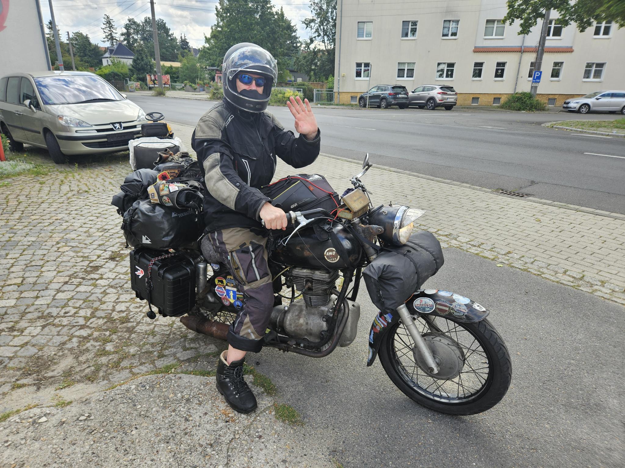 Bis 9 drücke ich noch beide Augen zu und begebe mich nach Müsli, Stiefel fetten, und Offjerechtsein zum rituellen Abschiedskaffee zu Meister Lutz in die Werkstatt. Meister Raik kommt als Winkelement ebenfalls vorbei. Für meine Verhältnisse komme ich unheimlich früh in die Puschen und verabschiede mich kurz nach high noon gen Leegebruch. Erst mal zum Warmfahren gute 200km. Oder sagen wir heißfahren. Wenn man so will, der Hochsommer steht in voller Blühte und spätestens beim Helmaufsetzen bekommt man den ersten kleinen Schweißausbruch.