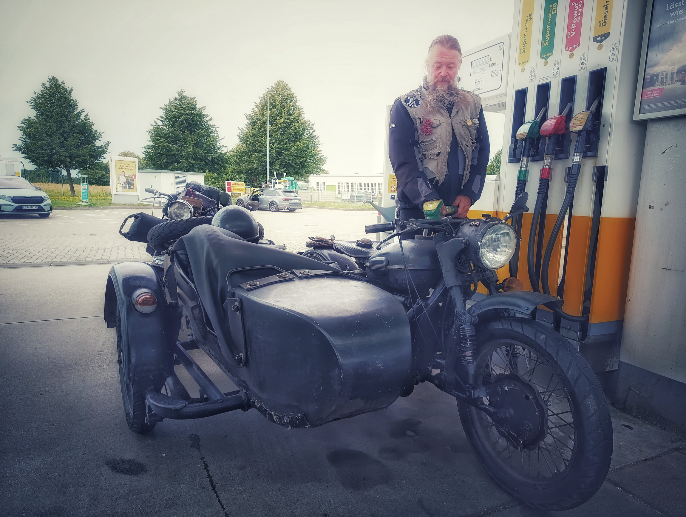 Nach nicht mal 24 Stunden – viel zu kurz für diesen Fleck – verabschiede ich mich wieder aus Laase und nehme Eckernförde ins Visier. Meine AWO treibt noch ein Weilchen Ullas Ural vor sich her, bis auch unsere Wege sich auf der A20 trennen. Der Rest ist eher Transit, also schnell vorwärts kommen. Lediglich in Lübeck möchte ich die Fähre Richtung Travemünde und Timmendorfer Strand nehmen. Ich verpeile jedoch trotz Navi die Fähre und stehe stattdessen vorm Mauttunnel. Also Kehrtwende übern Radweg und durch die Stadt gezwängt. Leider sieht man da nichts sehenswertes und ich bin froh, hinten wieder raus zu sein. Der Rest wird nicht besser, einige Baustellen und in Kiel ist meine Richtung voll gesperrt. Ich irre ein kurzen Moment herum und bin froh, aus Kiel raus wieder die richtige Straße gefunden zu haben. Ich mag Kiel (heute) nicht. Endlich in Eck angekommen, gibts erst mal nen Kaffee und ich schnacke mit Volker, bis Sani und Andre zum Grillen eintrudeln. Der Abend klingt gemütlich mit Rum aus und ich sacke mausetot vor Mitternacht ins Bett. So tot, daß ich gegen 3 nicht mal die Sirene und Hubschrauber mit Suchscheinwerfer übern Haus mitbekomme. Weiß nicht recht, ob ich das Volker überhaupt glauben soll, kenne ja seine Medikamente nicht …