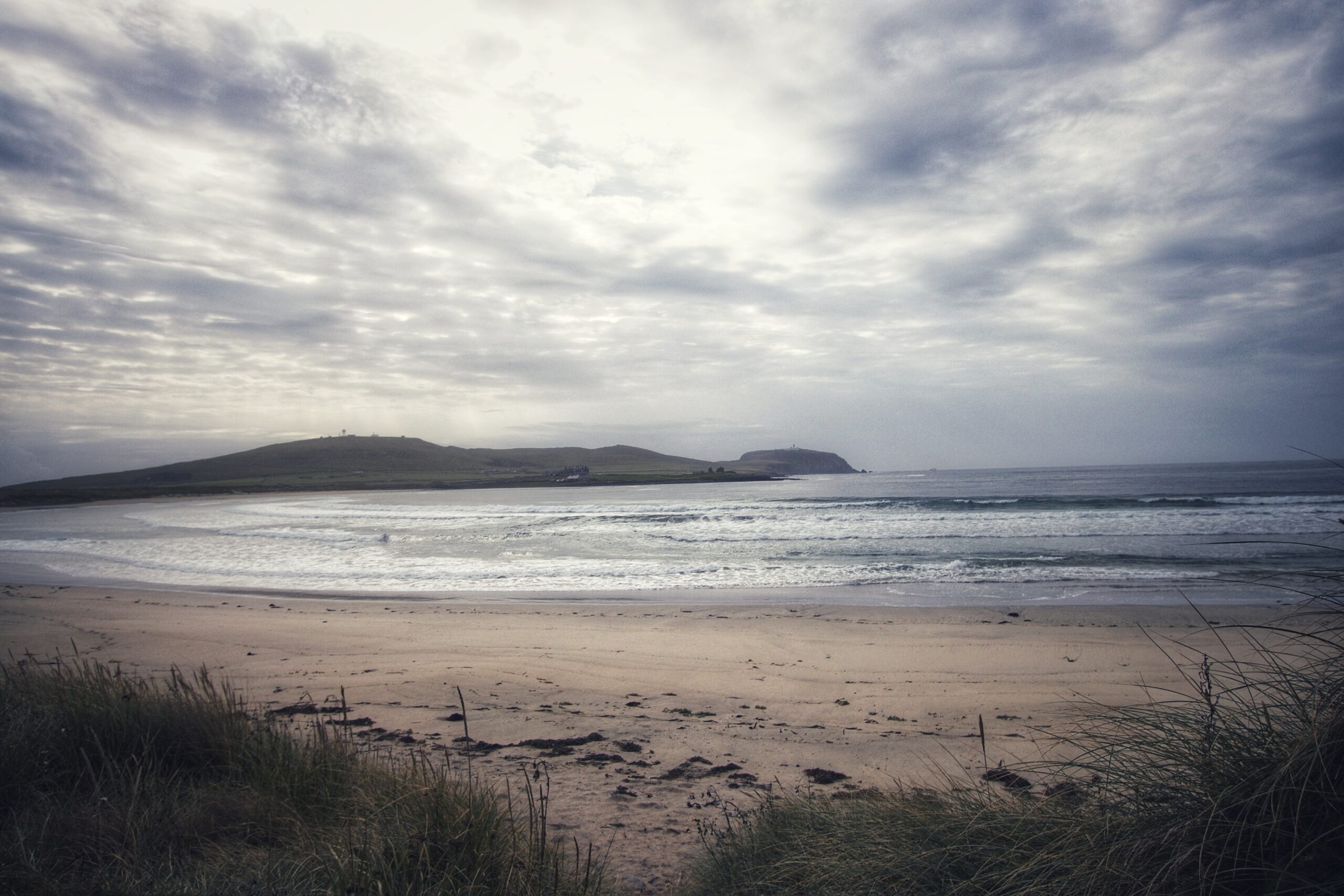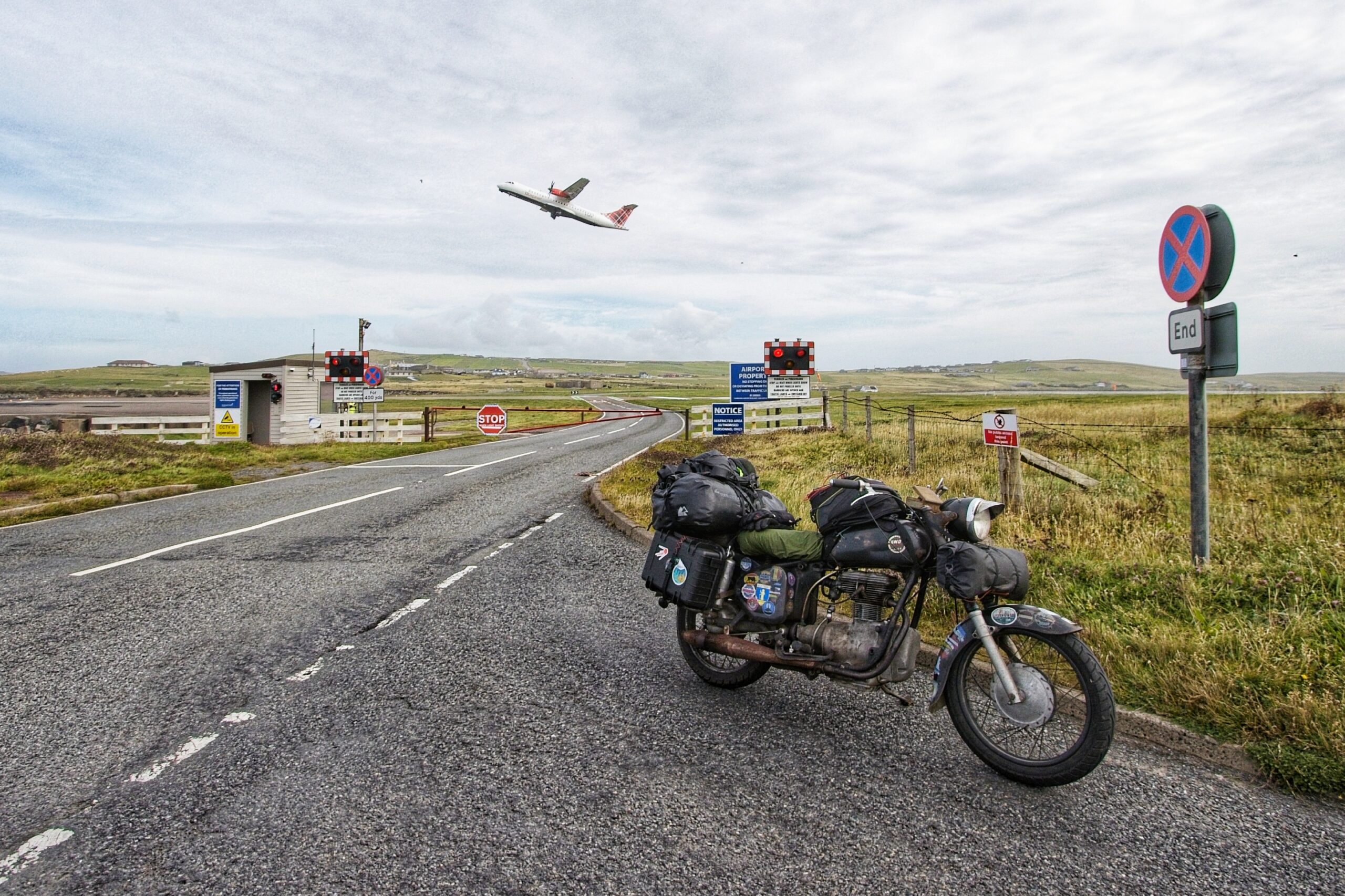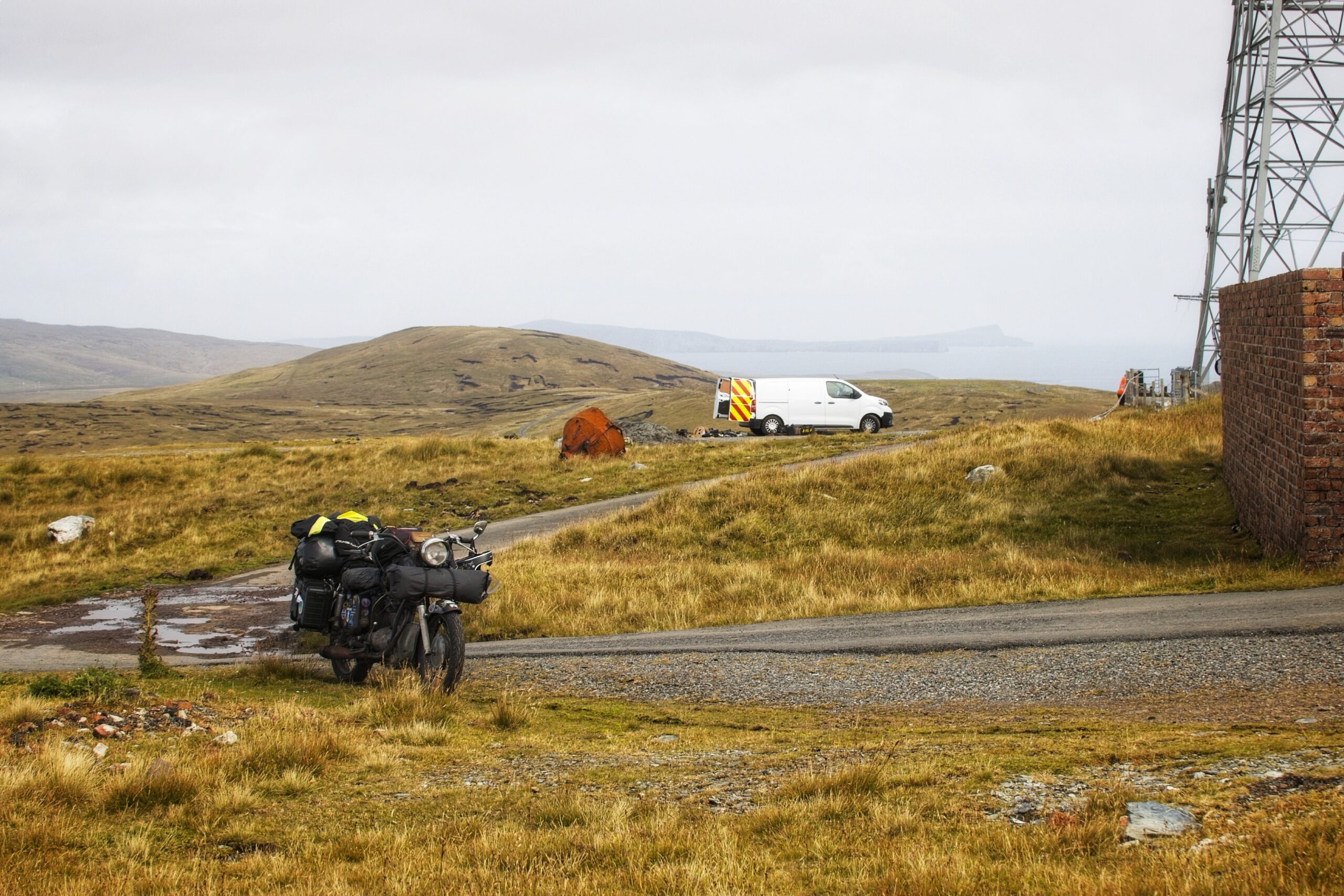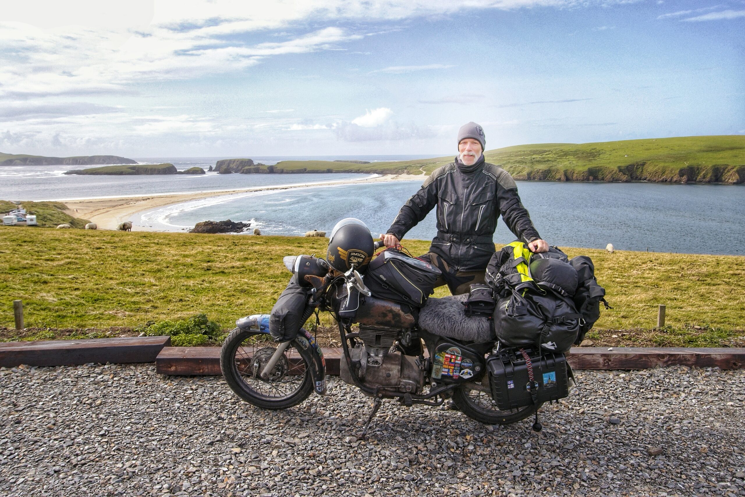 Bei St. Ninians Isle suche ich mir eine gute Stelle, um die Insel und die schmale verbindende Sandbank gut ins Objektiv zu bekommen und mißachte dabei das Privatgrundstück. Just in dem Moment hält ein Auto und der Fahrer steigt aus. Oh oh, jetzt gibts Ärger. Aber er fragt nur, ob er mich fotografieren soll. Und das für mein Befinden relativ aggresiv. Ich bin verdutzt und denke, wenn ich ihm die Kamera gebe, ist sie weg. Er lässt aber nicht locker, und so possiere ich am Motorrad und im Hintergrund die Insel. Ich bekomme meine Kamera wieder und bedanke mich höflich. Schroffes Land, schroffe Leute, aber hilfsbereit. Fein fein.