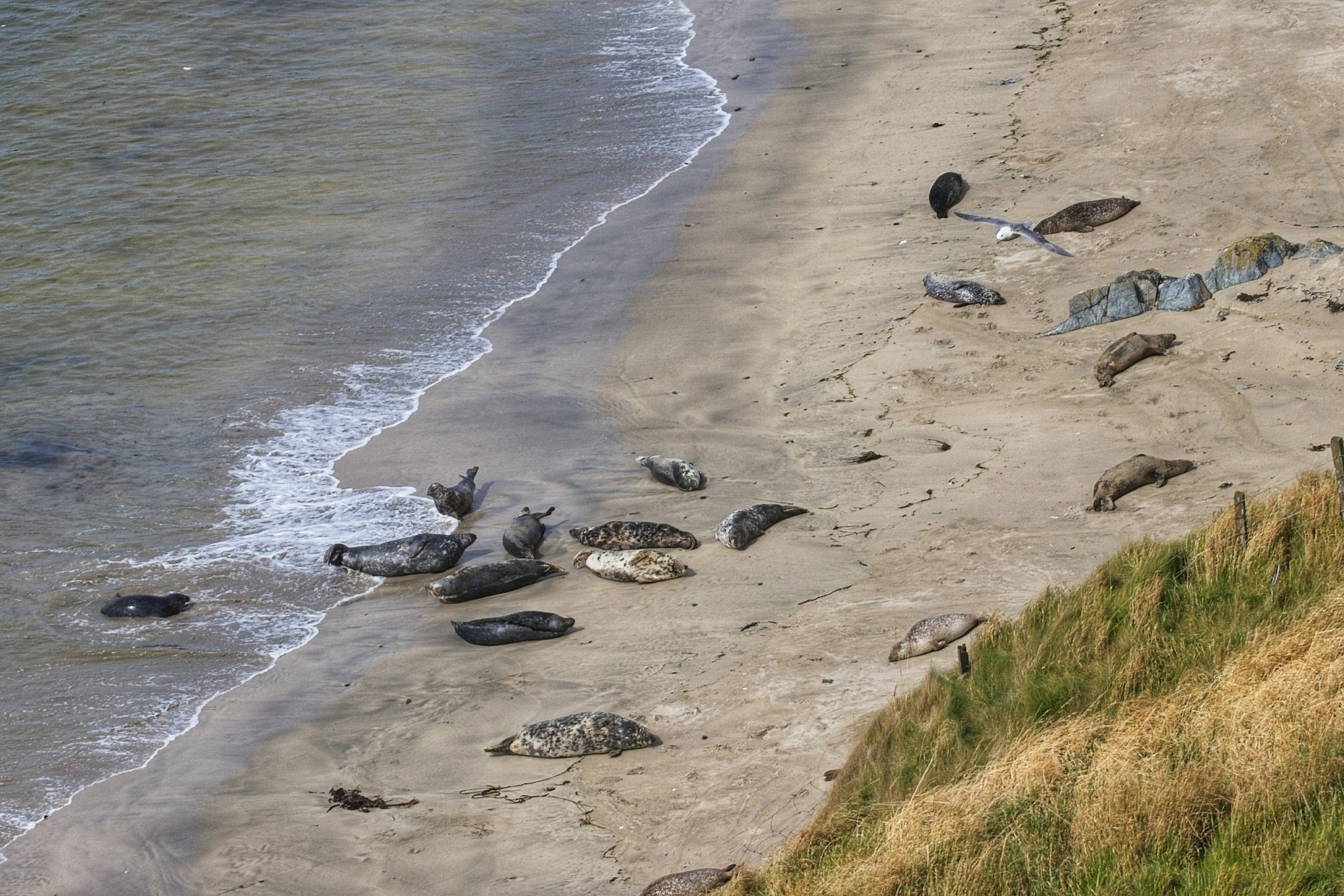 Auf gehts zum Sumburgh Head Lighthouse, also zum südlichsten Punkt Shetlands. Am Leuchtturm angekommen, kommen sofort Erinnerungen vom letzten Jahr am Leuchtfeuer von Lindesnes auf. Ähnliches Ambiente. Zusammen mit den sonnendurchfluteten landschaftlichen Reizen werde ich etwas sentimental. Mit Bernde¹ konversatiere ich darüber kurz miteinander. Nach einem kleinen Technikmuseum gibts noch Kaffee und Kuchen, und dann baldowere ich im Zickzack über die Insel gen Norden. Ich genieße die Aussicht vom Ward of Scousburgh mit seinen 263m, erspähe Seelöwen und erfreue mich an der Küstenformation und dem Blick übers Meer.