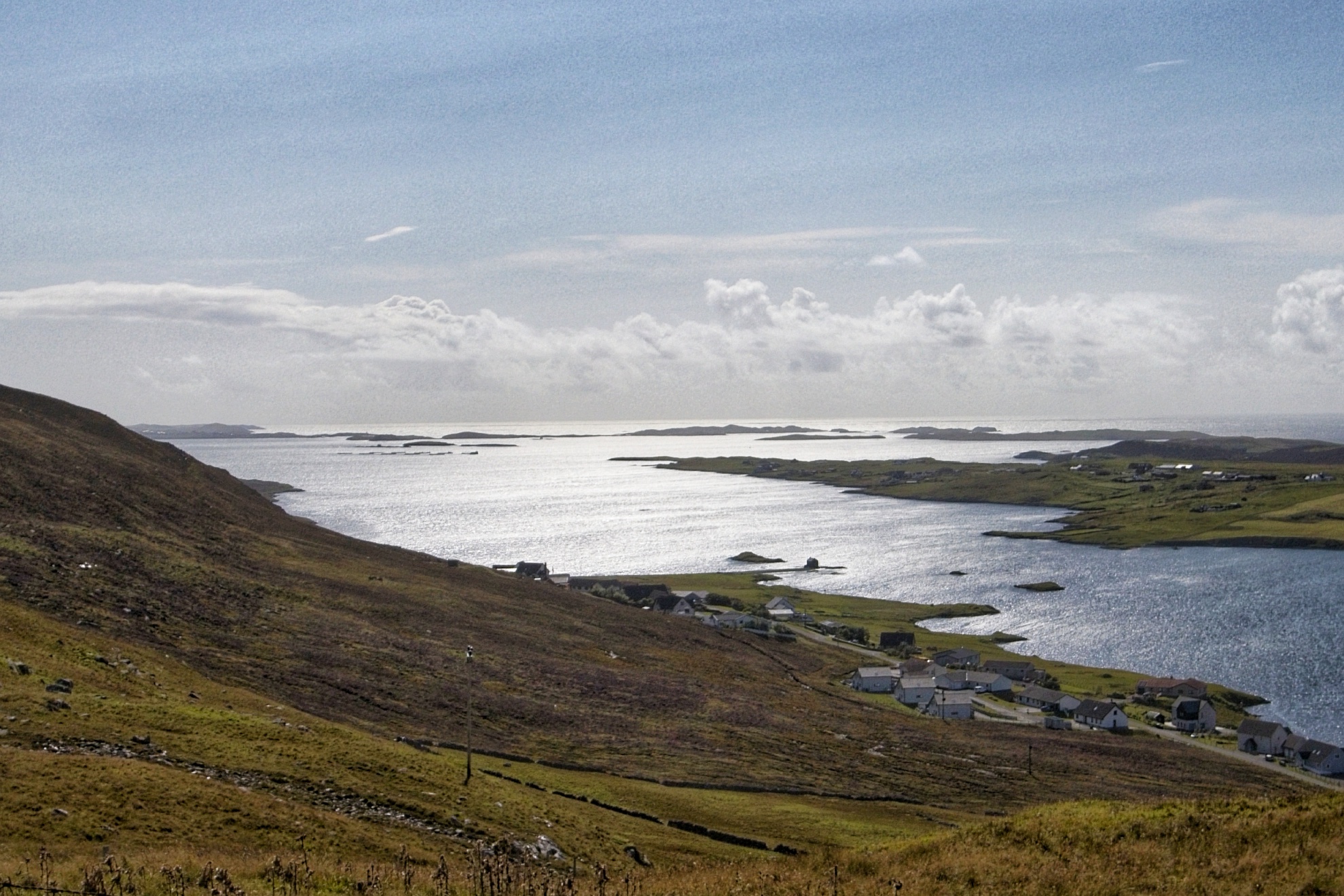 In der Ferne entdecke ich die Insel Foula, die noch zu den Shetlands gehört. Last, but not least, das Castle Scalloway entdeckt. Der Nachmittag schreitet voran und es zieht mich zu meiner Herberge, dem Brae Hotel. Warum nicht Camping bei dem Wetter? Ich fühle mich angeschlagen und angesichts des Wetters habe ich gestern bereits nach festen und bezahlbaren Unterkünften Ausschau gehalten. Das mit bezahlbar ist ein ganz schwieriges Thema, selbst unter der Prämisse, daß Spaß bekanntlich kostet. In dem Fall 134 Öcken. Als jedoch das Wort Badewanne im Angebot auftauchte, begann mein Finger zuckend auf Buchen zu klicken. Nun stehe ich also vor der Herberge und komm nicht rein, weil da gerade ein schweizer Endurist am Absatteln ist und wir sofort ins Gespräch kommen. Wir sind uns heute morgen schon flüchtig am Leuchtturm begegnet. Überhaupt ist das Motorradaufkommen auf der Insel mehr als überschaubar. Ziehe ich die Einheimischen ab, bleibt mir eine Hand, um alle zu zählen. Das hätte ich nicht erwartet. Auch wenn ich jetzt vielleicht übertreibe, aber der andere Biker außer mir auf der Insel ist der Schweizer, der im selben Hotel eincheckt. Auch keine Kunst, da es das günstigste auf der Insel ist. Nun denn, mein Schweizer begibt sich auf sein Zimmer, und ich denke auch, Zeit zum einchecken. Aber ich komme wieder nicht rein. Abermals biegt ein Schweizer um die Ecke und bekundet sein Wohlgefallen an der AWO. Auch er Biker, aber per pedes. So irgendwie mal von Gibraltar zum Nordkap, und nun auf die Shetlands. Da legts dich nieder. Im dritten Anlauf schaffe ich es endlich auf mein Zimmer, und auf direktem Weg, ohne über Los zu gehen, gehts direkt in die Badewanne. Anschließend Abendbrot im Hotel, und dann doch noch mal kurz aufs Bike gesetzt und einen Platz zum Sonne untergehen gucken. Doch erst erklimme ich den falschen Hügel und unterschätze die Weitläufigkeit im Gelände, und im zweiten Anlauf sehe ich zwar das Geschehen am Horizont, aber eine Wolkenformation vermasselt mir das Bild. Die Sonne war auf gutem Wege zwischen Horizont und einer dicken Regenwolke, was wirklich ein schönes Schauspiel geworden wäre, aber dann ging leider das Licht aus. Naturschauspiel gibts halt nicht auf Knöpfchendruck. Wieder im Hotel entdecke ich den schweizer Pedalisten an der Bar und wir schnacken bei einem, na gut, zwei Glas schottischem Whisky über das Reisen und die Menschen. Gegen halb 12 verschwinde ich im Bett mit der Gewissheit, daß dies ein verdammt genialer Tag war.