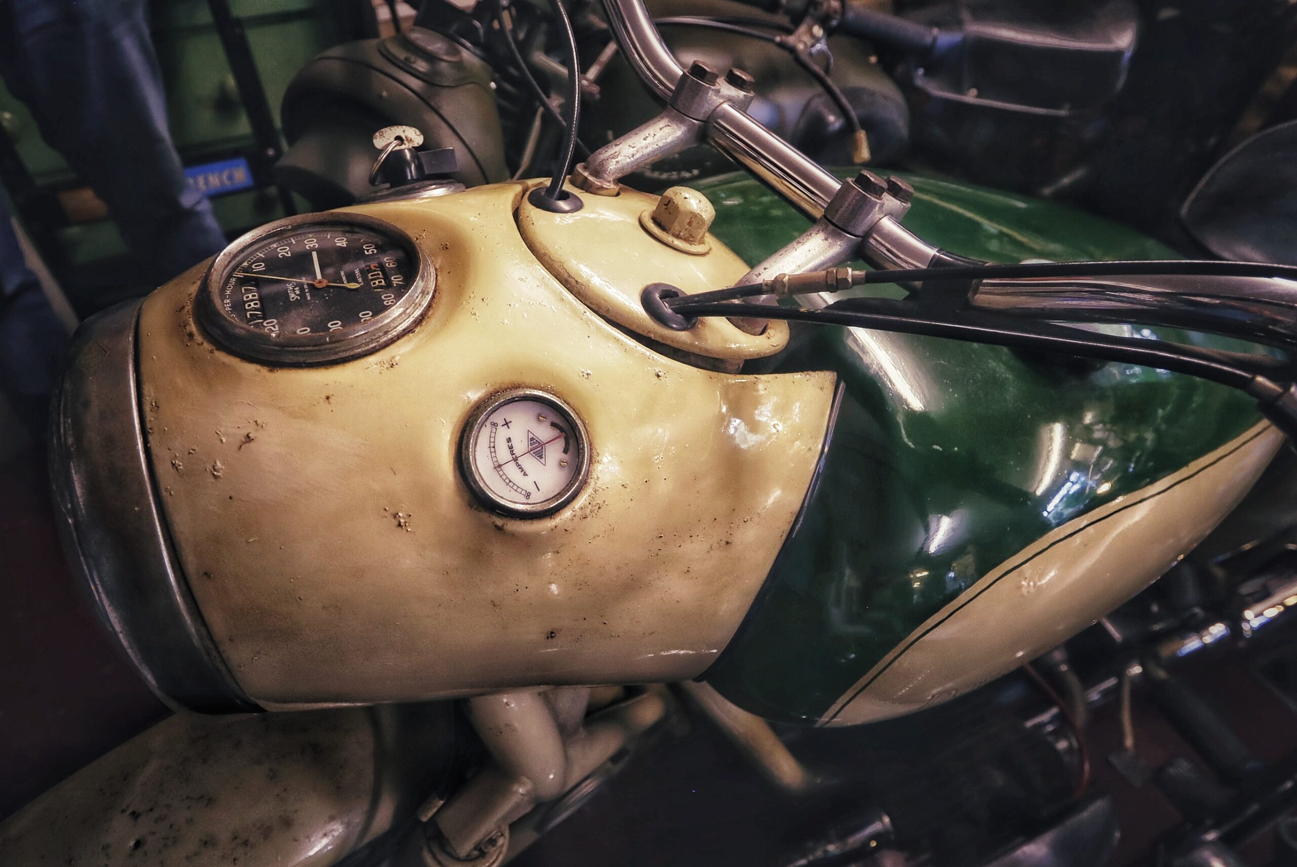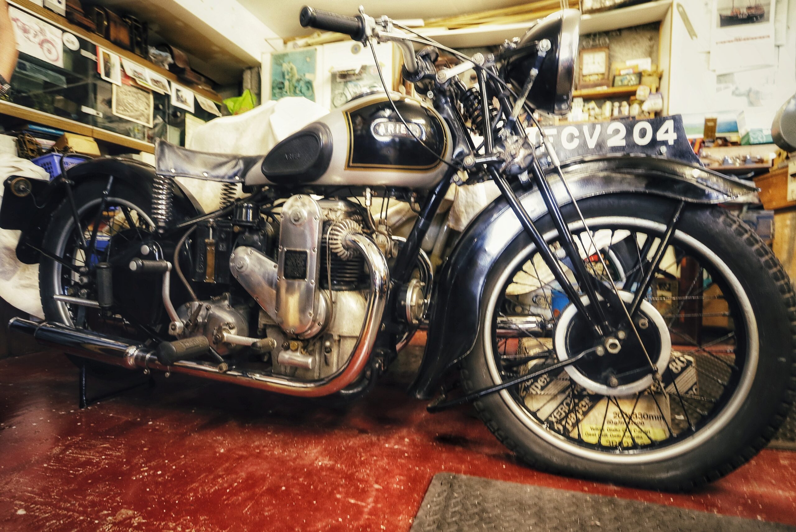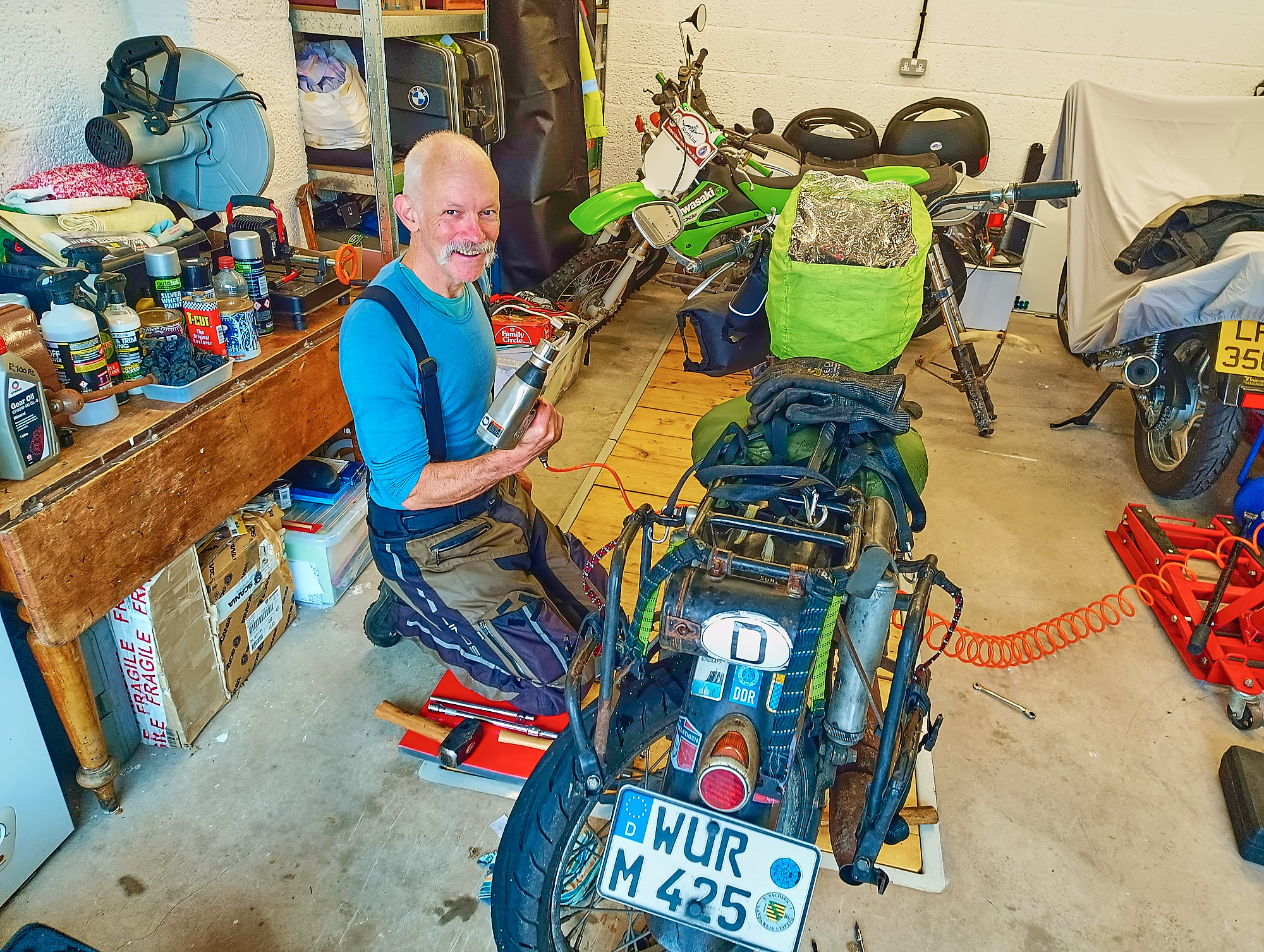 Ein Wecker im Urlaub ist eigentlich das letzte, was ich da sehen und hören will. Aber Colin und ich wollen schließlich noch einen neuen Dichtring auftreiben und natürlich auch verbauen. Lerwick ist hierfür genau die richtige Adresse, da es hierfür Auto, Werkzeuge, und vor allem Schiffsbau alles gibt, was in dieser Richtung benötigt wird. Beim zweiten Laden halte ich meinen ersehnten Dichtring in der Hand, bzw. zwei, man weiß ja nie. Es geht nun auf kürzestem Weg zu Colins Garage, sehr aufgeräumt das ganze und es ist wirklich alles Werkzeug da, was man braucht. Colin wohnt auf einem Hügel und hat einen wunderschönen Blick über Lerwick bis zum Meer hinaus. Nachdem ich den Ausblick genießen durfte, gehts nun ans Werk. In nicht mal 20 Minuten hab ich mich zur Kupplung durchgekämpft. Ich improvisiere mir einen Hebel zurecht, um Druck von der Kupplungsscheibe zu nehmen und die Muttern lösen zu können. Kurz danach muß Colin kurz seine Zweitgarage wegen zweier Schrauben aufsuchen, und die Schwungscheibe abdrücken zu können. Macht man eigentlich mit Spezialwerkzeug, aber was willste machen unterwegs. Als der Blick frei wird auf den Kurbelwellenstumpf wird das Malheur sofort erkannt. Der WeDi hat die Segel gestrichen. Noch nicht gravierend, aber doch so, das es die nächsten 1000km zu einem “So gehts nicht weiter!” gekommen wäre. Und wenn das Öl erst mal bis zum Kupplungsbelag vordringt, dann flutscht die Sache zwar, nur in dem Fall würde ich es als alles andere als freudig zur Kenntnis nehmen. Also lieber man, als man hätte. Gegen Mittag kurz vorm fertig werden kommt noch ein Nachbar von Colin herein geschneit. Ein lustiger Kauz, auch schon über 80. Colin meint, bei dem schauen wir nachher noch mal in die Garage, er hat da noch einige sehenswerte Schätze zu stehen, da mich doch so alte Sachen interessieren. Zuerst gehts aber runter nach Lerwick. Colin macht mit mir einen kleinen Stadtrundgang und wir essen noch eine Kleinigkeit in seinem Lieblingsimbiss. Es gibt eine Art Burger, aber mit richtigem Fleisch von der Insel und nicht so ein McDoof-Kram. Dazu eine Tasse Tee und ein Stück Sahnetorte. Interessante Zusammenstellung, aber ich hab ja gesagt ‘Colin bestell du, ich zahle’. Aber geschmeckt hat beides richtig gut. So, nun noch die Schätzchen seines Nachbarn bestaunen. Wir fahren wieder up on the hill und betreten Joes heilige Hallen. Joe ist nicht nur begeisterter Sammler alter englischer Motorräder sondern begnadeter Uhrmacher, was er sich aber selber als Hobby angeeignet hat. Er hat also die Garage, nein Doppelgarage, voll mit Zeug, was Männerherzen höher schlagen lässt. Sicher auch einige Frauenherzen. Man möchte in jeder stöbern, um noch die letzten Schätze zu entdecken. Leider habe ich aufgrund der Enge und der nicht optimalen Ausleuchtung nicht die Möglichkeit, vielleicht neues Bildmaterial für meinen Kalender zu erhaschen. Ich versuche aber doch einige Details einzufangen, um sie zu Hause in Motorradkreisen mal einer näheren Betrachtung zu unterziehen. Nicht wahr, Torsten, Raik? Ich mußte als bis zum letzten Moment warten, bis ich die ersehnten Rudges, Nortons und Ariels bewundern durfte. Der Check in zur Fähre lässt sich nicht weiter verschieben, und so ist es nun leider an der Zeit, mich von Joe und Colin zu verabschieden. Es fällt mir schwer, meinen Dank an Colin für all die Unterstützung in richtige Worte zu fassen. In solchen Momenten schmerzt es schon ein wenig, daß ich da in broken english ziemlich was zusammen stammle. Ich werde mich jedenfalls noch auf andere Art und Weise bei Colin bei Colin bedanken.