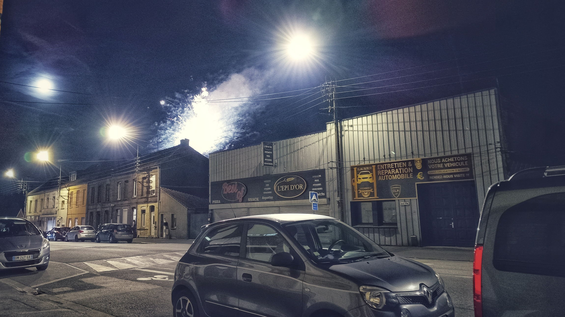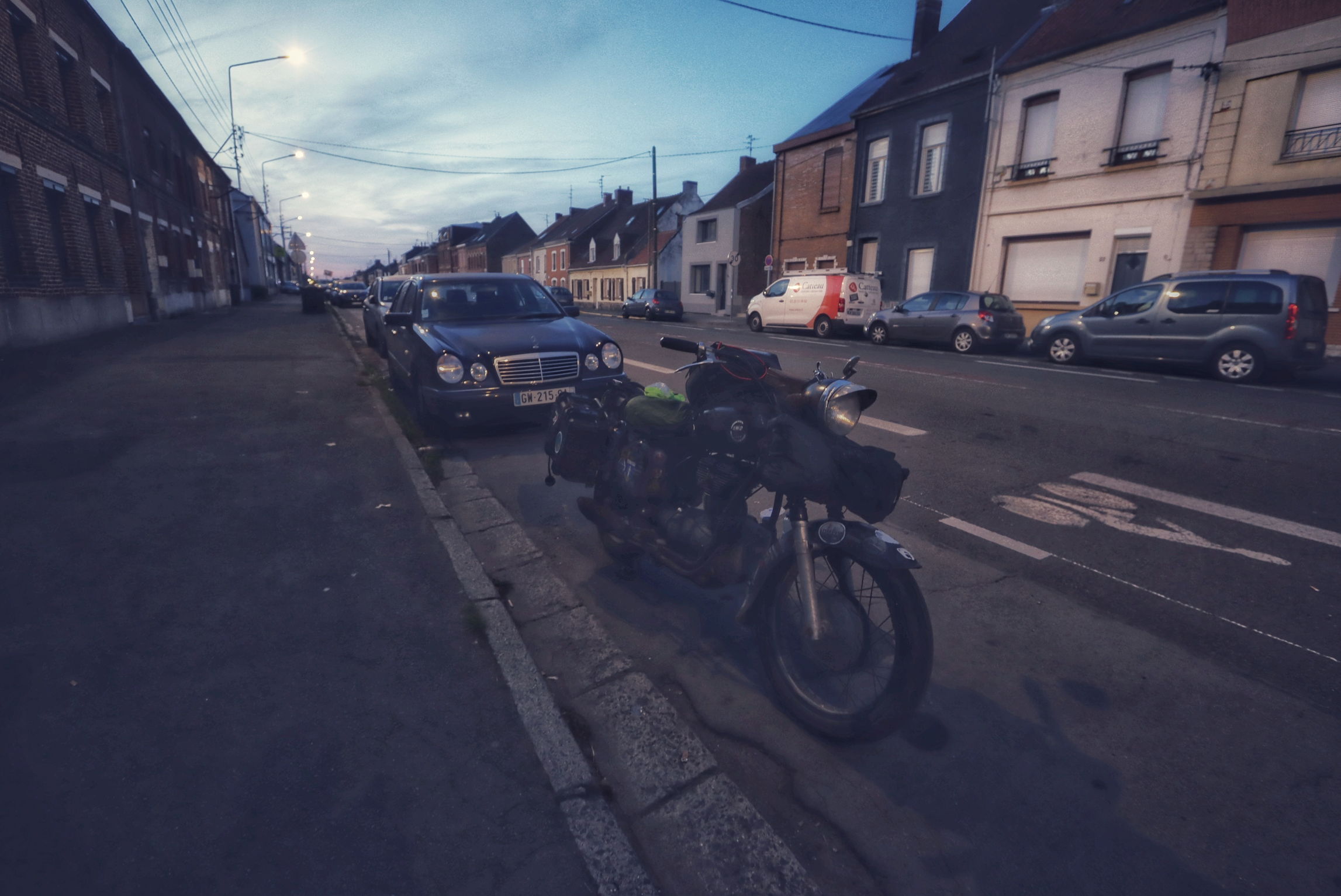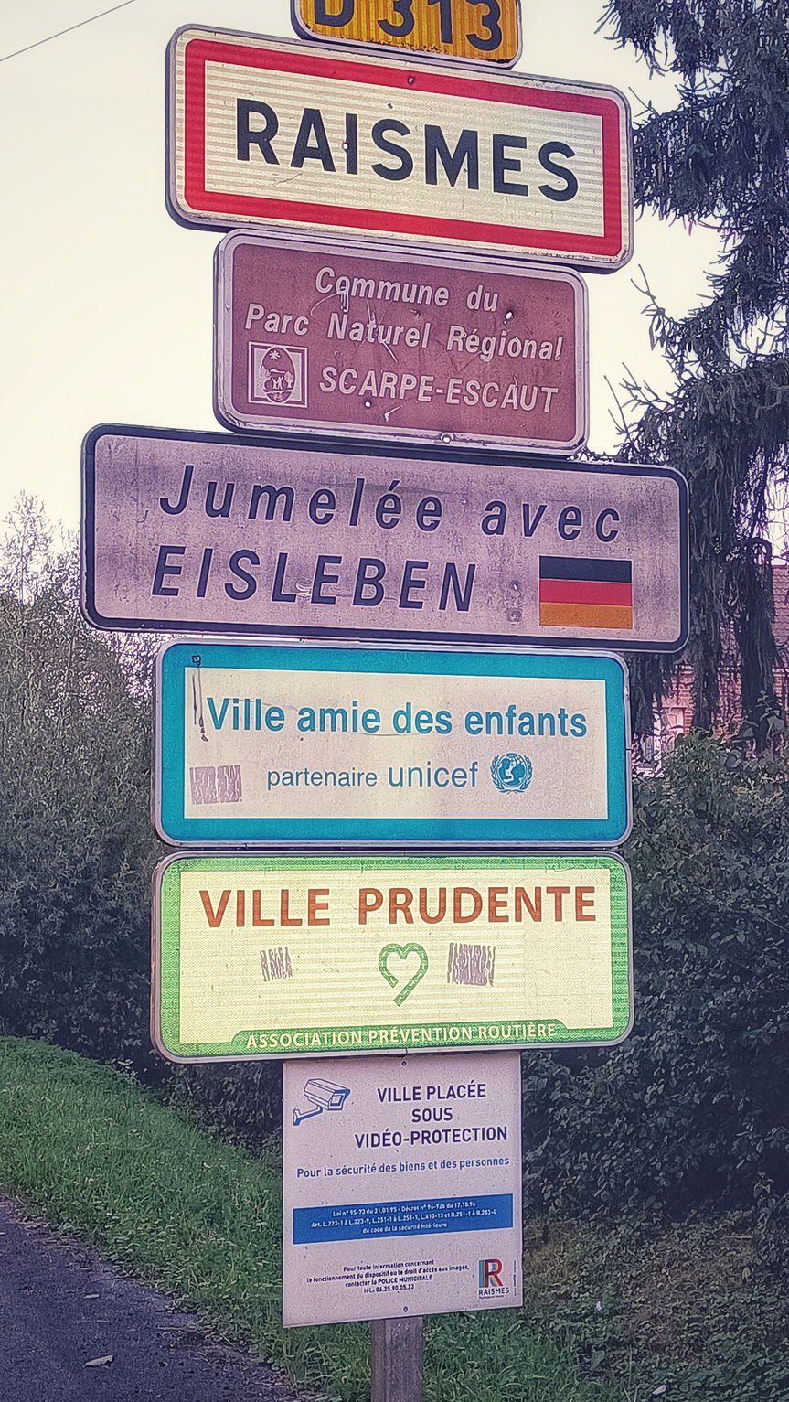 Kurz vor 6 erblicke ich wieder Tageslicht und schaue mir die Karte zwecks weiterer machbarer Ziele an. Eigentlich eine Zeit, um das nächste Nachtlager anzusteuern, aber darauf lasse ich mich nun nicht mehr ein. Trotz Panne will ich Strecke machen und hab für die nächsten Tage einen ungefähren Plan zurecht gelegt, wann ich heimatliche Gefilde erreichen will. Nur, die Ardennen schaffe ich heute nicht mehr. 250km abends 18 Uhr ist mir dann doch zu fett. Aber es ist noch 2 Stunden hell, und somit auch halbwegs warm, das soll genutzt werden. Im möglich Zielgebiet, versuche ich was ausfindig zu machen. Wieder was mit Dusche, die könnte ich nach der Bastelei heute wirklich gebrauchen. In Raismes werde ich fündig und bin am Ortseingangsschild etwas überrascht: Partnerstadt von Eisleben, wohin ich familiäre Bindung hatte und oft in den Ferien war. Raismes selbst hat auch irgendwie was von Eisleben. Ich finde, die beiden passen gut zusammen. Ein graues Nest, und die Jugend heizt hier die Dorfstraße hoch und runter, bis der Empfang im Fernsehen weggeht. Kann eine interessante Nacht werden. Dafür gabs auch schon ein kleines Feuerwerk.