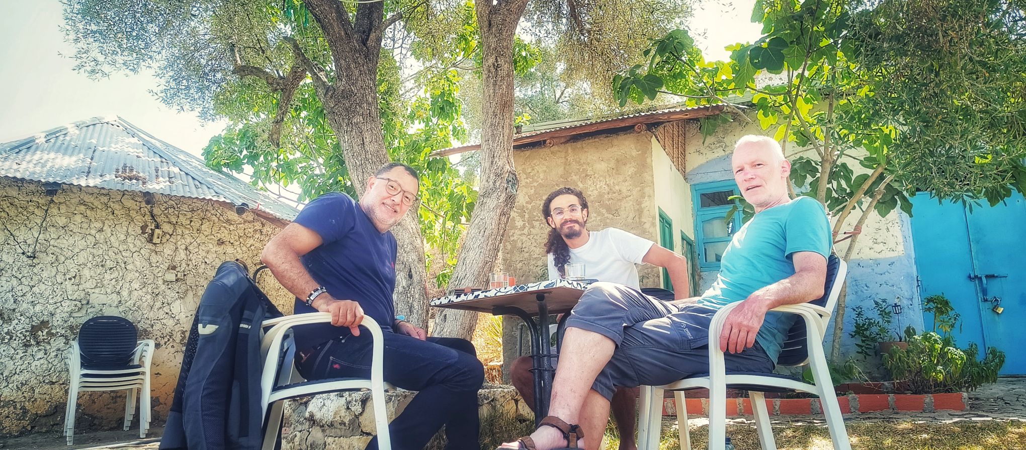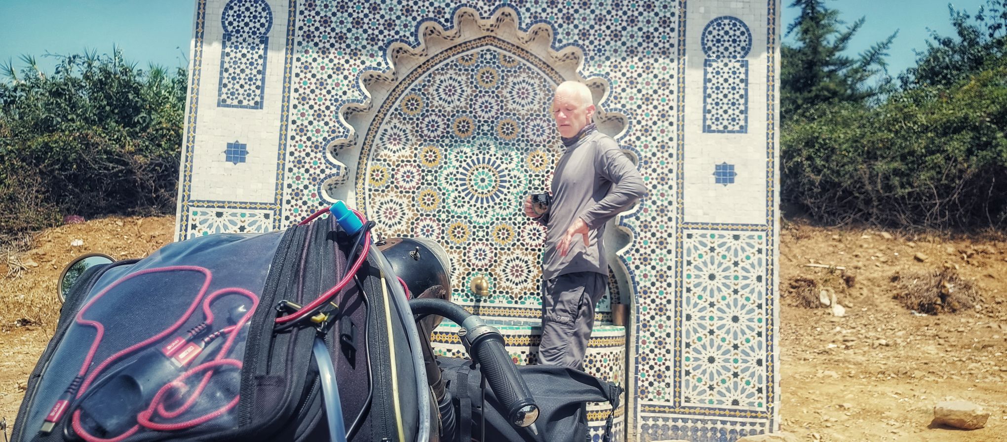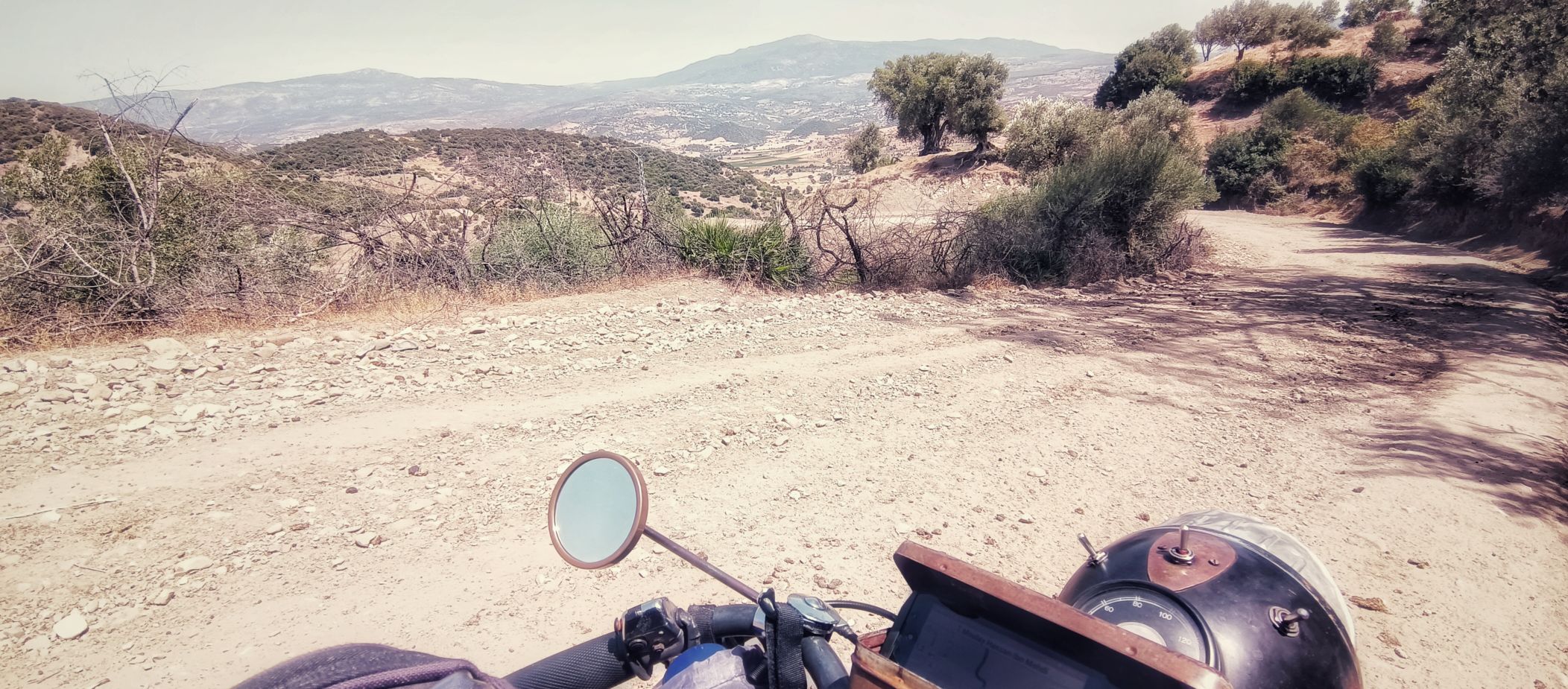 Die kleine Straße, die mich nach Westen führt, ist mit ihren Kurven und auf und ab eigentlich prädestiniert für Motorradfahren, doch die Schlaglochdichte ist nichts halbes und nichts ganzes. Nicht zu kurz, dsß man nur Schlängellauf fahren müßte, aber auch nicht zu lang, daß man entspannt fahren könnte. Und da bei der sengenden Hitze die Konzentration schwer fällt, donnere ich doch das ein oder andere mal gewaltig durch die Krater. Auf halber Strecke wird dann die Strecke als gesperrt gekennzeichnet und eine Umleitung ausgezeichnet. Ich ahne aber schon bei dem Gelände, in das die Straße führt, daß das nicht gut ausgeht. Und genauso kommt es. Auf einem Anstieg stehen 3 Häuser und die betonierte 3 Meter breite Piste endet schlagartig. Früher wurden dann hier bestimmt die irregeführten Reisenden ausgenommen und sind auf nimmer Wiedersehen verschwunden. Mit der AWO wird mir das aber nicht passieren. Ich kehre um und folge der korrigierten Strecke im Navi. Und lande auf einer Schotterpiste. Nun denn, ich wollte ja eh ein bißchen offroad fahren in Marokko. Der Spass währt aber nur kurz und ich bin bald wieder auf der alten Route. 15km vor meinem Ziel kommt das Problem im Doppelpack. Die kleine Straße, auf die ich abbiegen soll entpuppt sich als bösartige Schlaglochpiste und ich kehre nach 300m wieder um. Selbst eine 2000 Jahre alte Römerstraße ist im besseren Zustand. Mich darüber aufzuregen gelingt mir aber garnicht erst. Noch ein zweimal stottern und dann ist Stille. Ich guck etwas irritiert suf meine Instrumententafel und lass mich bergab zur Einmündung hinunter rollen, wo ein kleines Wartehäuschen etwas Schatten spendet. Da ist sie also die Situation, vor der ich ein wenig Angst hatte. Motorrad kaputt, Sonne brennt von oben, am nächsten Tag wird man mich ausgelaugt und vetrocknet finden. Oder auch nicht. Ich seh mich schon wie im Film“Der Flug der Phoenix“. Noch ein bißchen rumirren und -docktern, und dann aus den Latschen kippen. Aber was nun eigentlich los? Alle Lampen aus, also ein Elektrikproblem. Für jemanden wie mich, der bereits mit 12 Jahren den Versuch unternahm, in den Schwarz-Weiß-Fernseher im Kinderzimmer etwas Farbe zu bringen, also mit hinreichend Elektronikerfahrung, mußte ich nicht lange überlegen. Und so kam ich nach 5 Minuten drauf: der Strom ist weg! Batteriekasten auf und Sicherung reingedrückt. Puff, wieder raus. Also Sicherung kaputt! Na nee, jetzt mal halblang. In die Lampe geschaut, nix zu sehen. Ebenfalls nicht unterm Lichtmaschinendeckel. Also Sitz runter und im Liftfiltergehäuse die Verteilung gecheckt. Ein Wackelkontakt, wohl verursacht von Mondkratern der marokkanischen Nebenstraßen. Als alles wieder läuft, atme ich durch und durchaus relaxt. Nix mit Abflug Phoenix. Ich such mir eine alternative Route und bin 30 Minuten später am Ziel in Asilah. An der gebuchten Unterkunft darf ich mein Motorrad auf den Hinterhof stellen. Es ist der hinterste Hinterhof, den ich kenne. Ein Haufen Schutt, ein paar Hühner, aber auch ein paar Autos. Da bin ich mal gespannt, wenn ich morgen hier wieder rein gucke, was dann noch alles seht. Oder nicht steht.