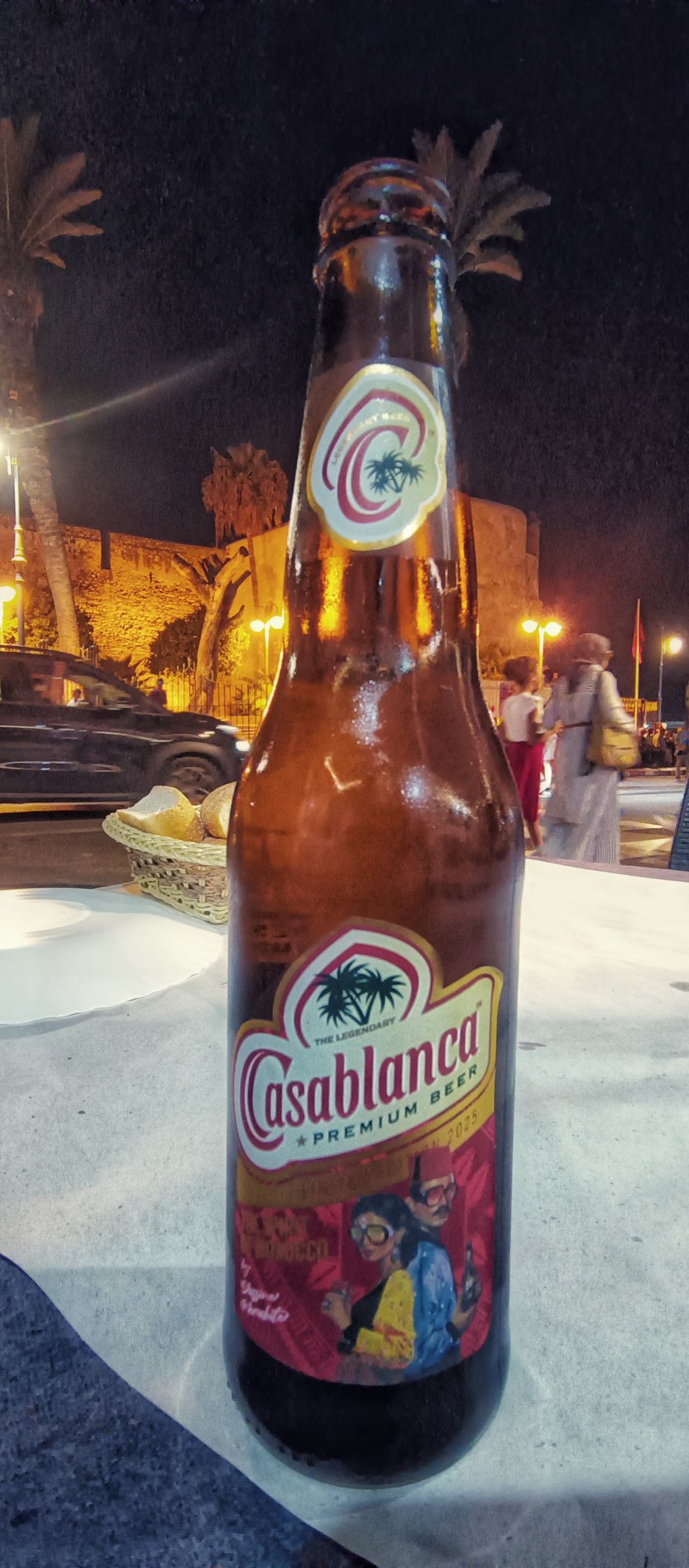 Über das Zimmer verliere ich keine Worte, soll doch um was schönes gehen. Nach dem Duschen gehts in die Medina. Auf Empfehlung von Ali gehts in ein Fischrestaurant und anschließend durch die Altstadt. Erwähnte ich schon, daß die Marokkaner ein „kleines“ Problem mit ihrem Verhältnis zum Müll haben? Sehr schade, ist doch das Ambiente und das pulsierende Leben auf der Straße sehr reizend. Eine Sache mußte ich schnell lernen: frag nicht innerhalb der Medina nach Bier! Wenn sie es denn endlich begriffen haben, was man wünscht, und ein freudiges Gesicht erwartet, wird man entweder mit sofortiger Mißachtung oder einem Blick bestraft, der keine weitere Erklärung bedarf. Zurück im Hotel wage ich noch einmal den Versuch und frage den Concergie, ob es die Möglichkeit eines Hopfenblütentees gibt. „No problem“ sagt er und verschwindet. Für eine Stunde! Als ich auf dem Zimmer bald weggeratzt bin, klopft es an der Tür und bekomme zwei Casablanca Pils gereicht. Eins gönne ich mir noch und dann ist Schicht.