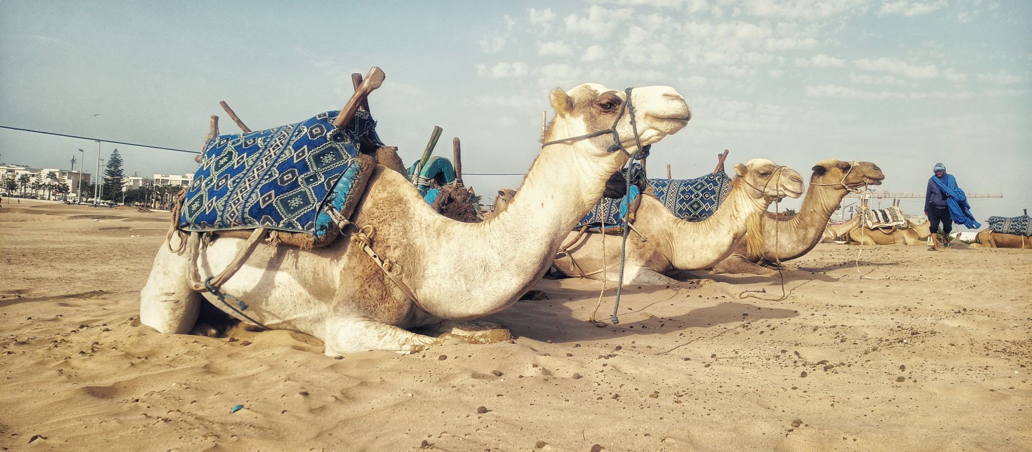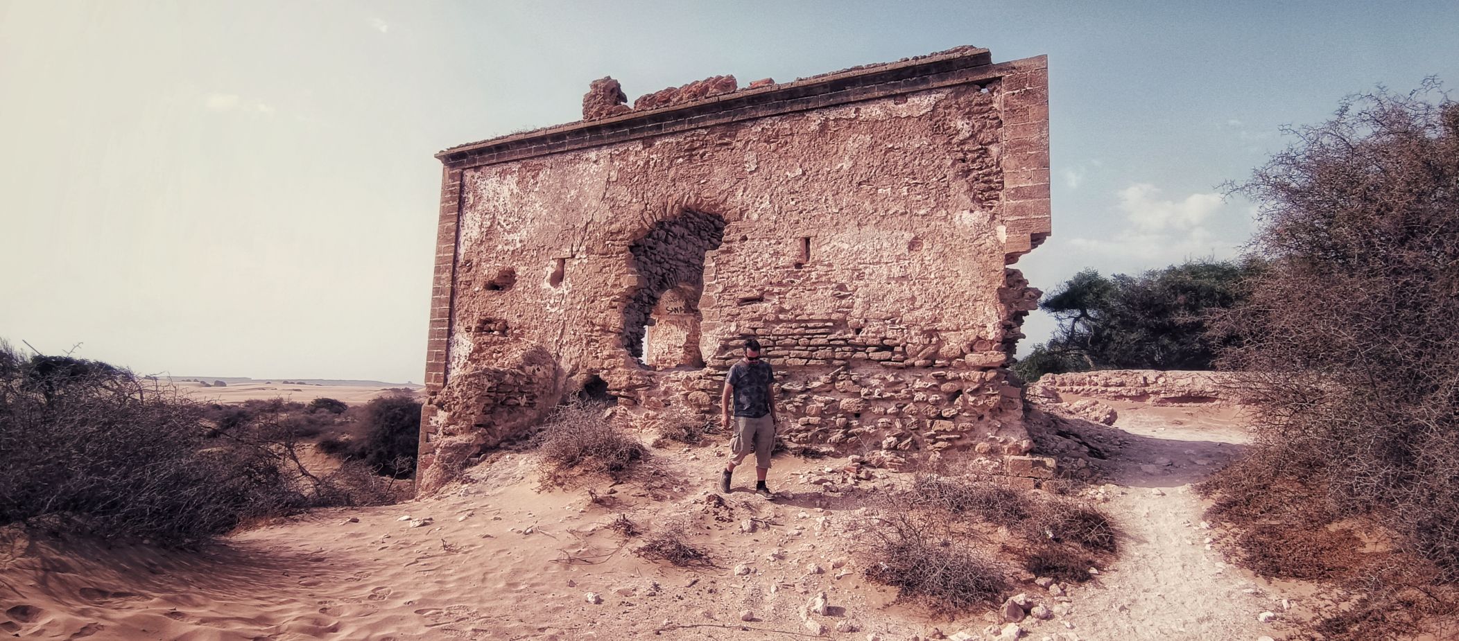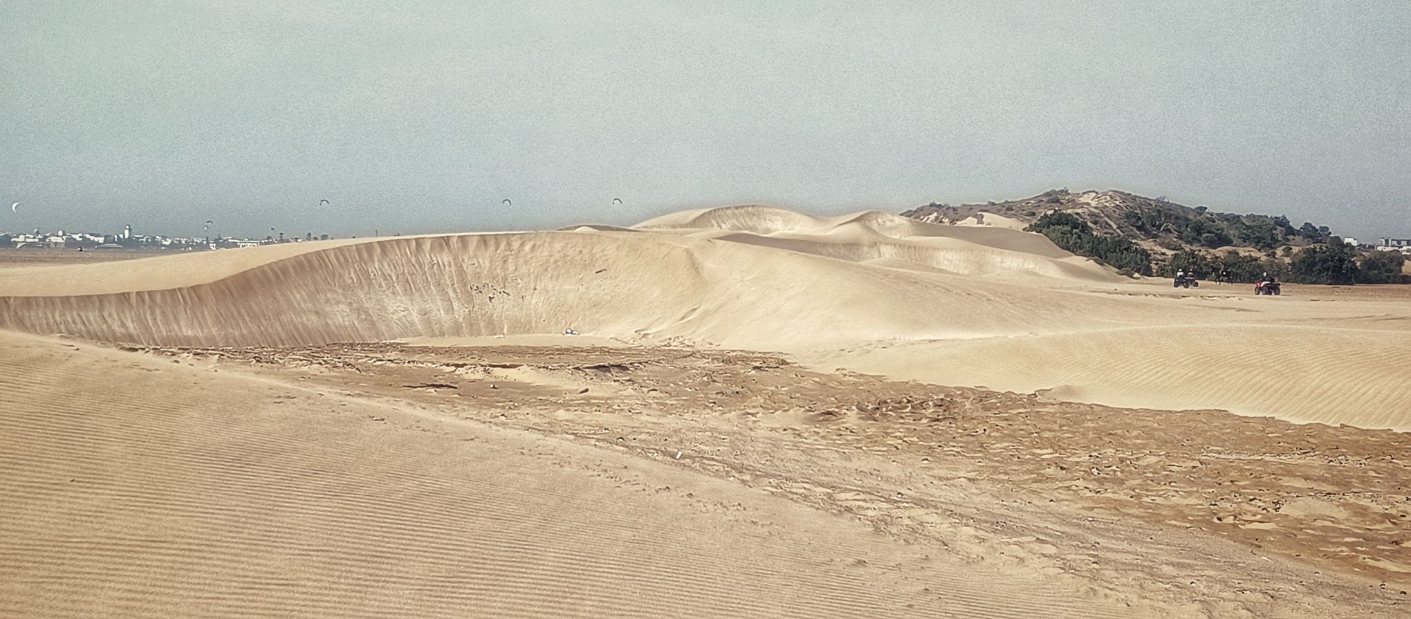 Da das gestrige Café einen sehr gediegenen Eindruck machte, brauchten wir nicht lange überlegen, wo wir zum Frühstück abchillen wollten. Wir wußten auch, was wir nicht wollten: noch mal ins Herz von Essaouira. Etwas südlich gab es 3 Dinge als Anlaufpunkte, welche die Basis für unseren heutigen Ausflug bildeten. Beginnen wir mit Nummer eins: das Jimi Hendrix Café. Angeblich soll es den best guitar player of the world 1969 hier her verschlagen haben. In Essaouira war er wohl, und vielleicht erwähnte der Muezzin ihn beim Abendgebet. Und das hat man dann vielleicht 4km vor der Ortschaft noch gehört. Sei es drum. Ebenfalls ‚angeblich‘ inspirierte die nahegelegene Ruine des Dar Sultan Palace den Maestro zum Song ‘Castles Made Of Sand’. Gut möglich, aber nur, wenn er 2 Jahre zuvor die Reise bereits geplant hätte und auf einer Landkarte die Ruine zur Kenntnis genommen hätte. Wobei wir hier schon bei Punkt zwei unseres Ausflugs wären, der eben erwähnten Ruine und einstiger Sitz von Moulay Abderrahmane Khalifa, dem Herrscher (1822-1858) von Essaouira. Erbaut von holländischen Fachleuten nach europäischem Stil mit richtigen Glasfenstern, ist vom damaligen Glanz nicht mehr viel zu sehen. Aus dem Sand schauen hier und da noch ein paar Mauer- und Gebäudereste und regen die Fantasie an. Weiter gehts zum dritten Punkt durch ein ausgetrocknetes Flussbett und über Dünensand, aber nun wirklich nicht mehr vorhandenem ehemaligen portugiesischem Fort am Strand. Ein paar Felsen, ein Fort? Naja, zumindest liegt/steht da was im Wasser. Am Strand gehts wieder nordwärts, welcher von Reitern auf Pferden und Dromedaren gesäumt ist. Ebenso wie von Reitern auf dem Wind im Meer, die bei heftigem Wind optimale Bedingungen fürs Kitesurfen haben. Damit ist dann auch unser Tagessoll erfüllt und wir schlendern wieder Richtung Unterkunft, wo noch eine kulinarische Überraschung auf uns wartet. Unser Herbergsvater hat nämlich für uns gekocht. Marokkanische Küche: Couscous mit Gemüse und Fleisch. Und nach dem wir es uns haben munden lassen, legen wir die Beine hoch, und sabbern fröhlich vor uns hin. Oder so ähnlich. Bis das Licht ausgeht, draußen die Kinderparty ihr Ende findet, und wir die Augen schließen.