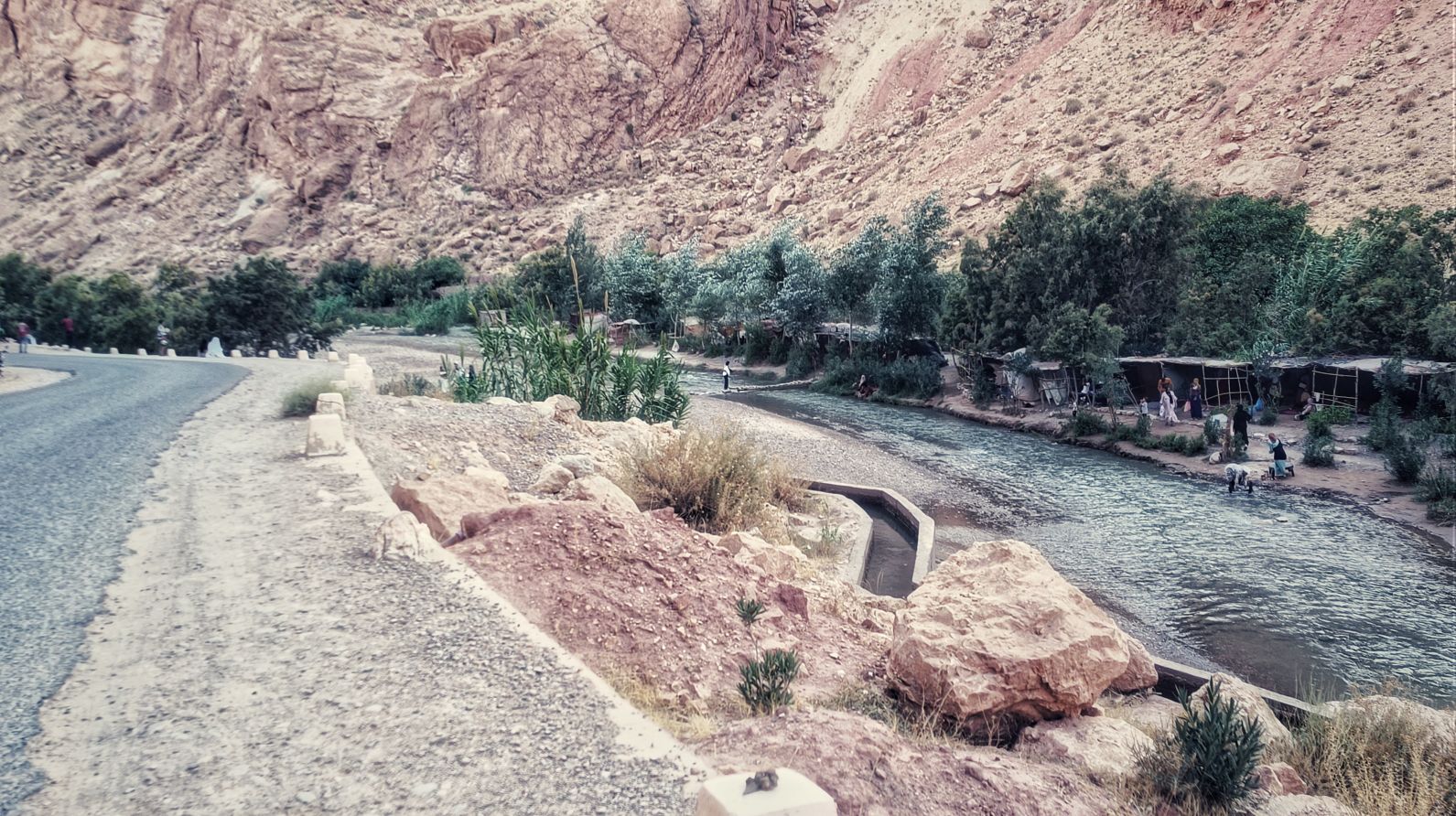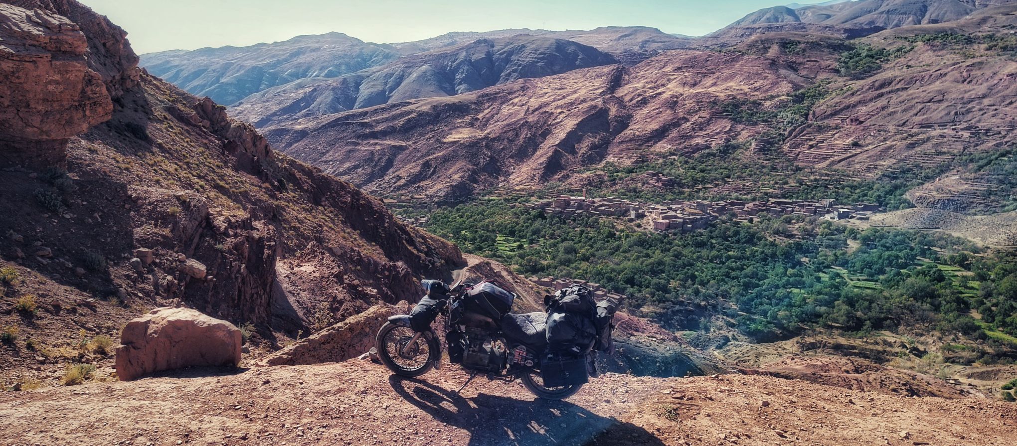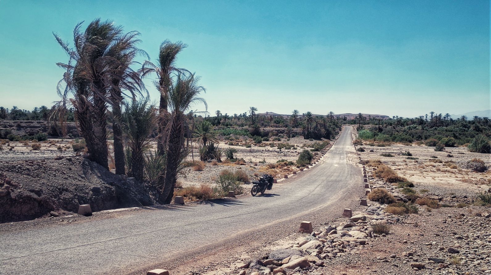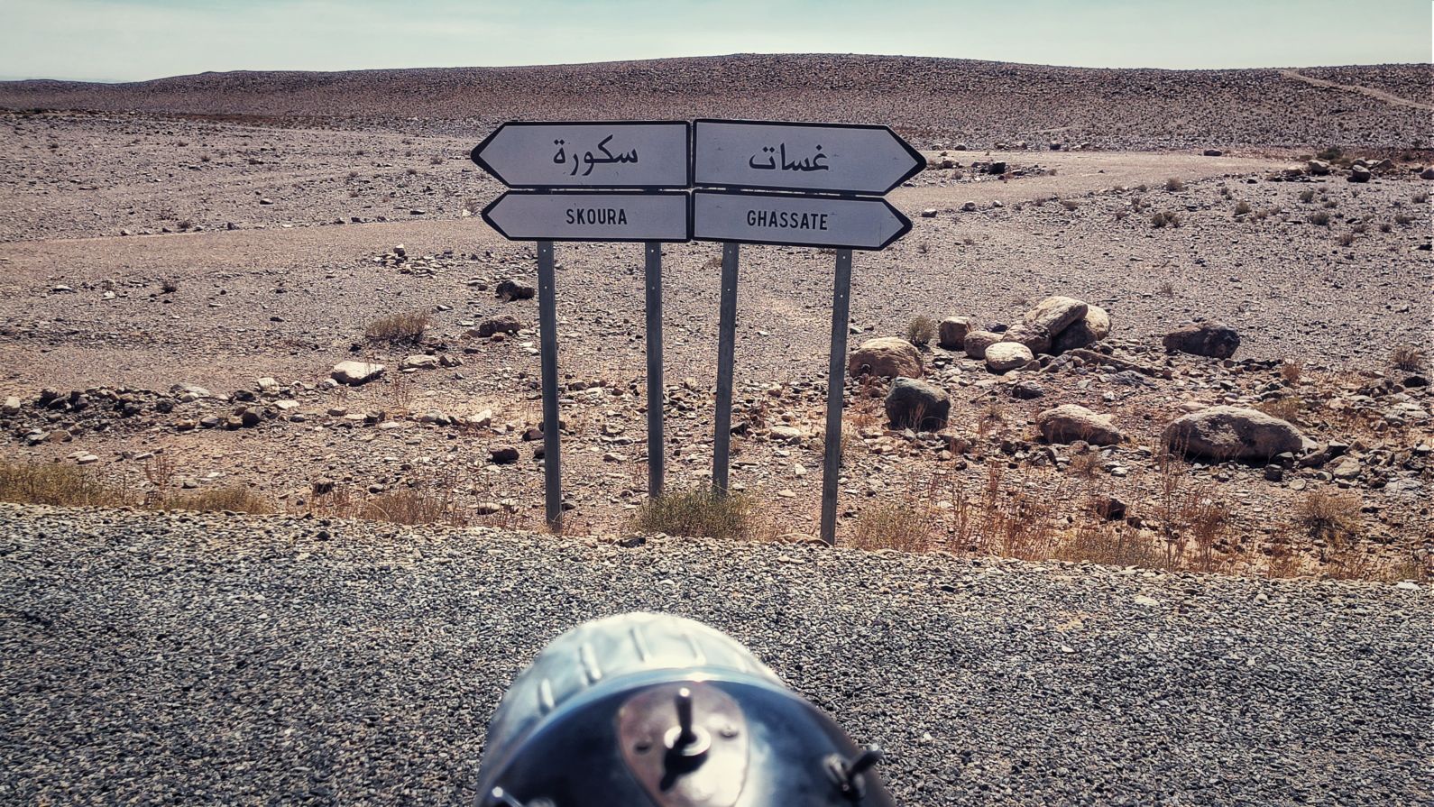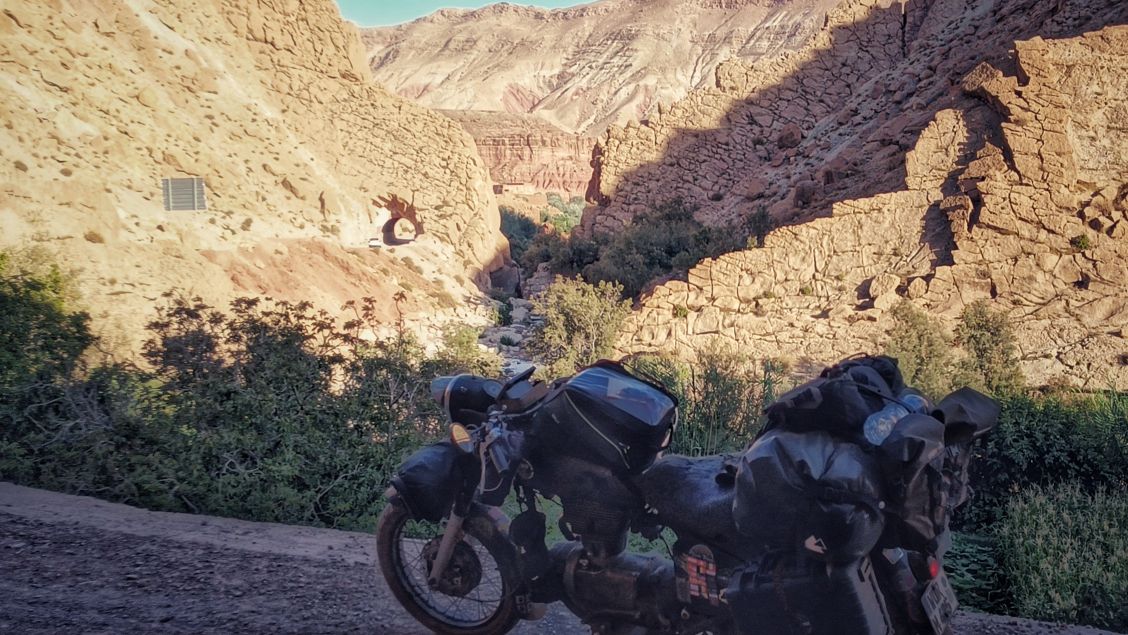 Ein Frühstück, ein paar Feigen, und ein paar Wanzen oder Flöhe gibts zum Abschied. Doch bevor es los geht, ist auch gleich wieder Schluß. Das ganze Fahrzeug ist völlig instabil. Ich vermute Luftverlust in den Reifen. Und der Sohnemann vom Herbergsvater lotst mich zum Dorfkonsum mit angeschlossenem Werkstattservice. Das Flair entspricht den beiden Werktätigen in diesem Ambiente: historisch wertvoll. Doch die Luft im Reifen, die noch reichlich vorhanden ist, ist es nicht. Ich muß den helfenden Mitarbeiter höflich bitten, daß mit den 5 Bar doch mal bitte zu unterlassen. Statt dessen entdecke ich zwei gebrochen Speichen im Hinterrad. Und die Inspektion der restlichen Speichen offenbart eine mittlere Katastrophe. Alle Speichen locker! Wie konnte ich es gestern Abend überhaupt noch bis hierher schaffen? Und vor allem zeigt es, wie sensibel ich am Ende einer Tagestour auf „kleine“ Ungereimtheiten am Fahrzeug reagiere. Ich leihe mir ein Maulschlüssel, packe alles Gepäck ab, und mache mich an eine notdürftige Reparatur. Zwar ziehe ich möglichst gleichmäßig alles wieder an, kann aber nicht auf genaue Zentrierung dabei achten. Innerlich fluchend setzt aber auch der Lerneffekt ein: nie wieder Edelstahlspeichen! Auch nicht, wenn sie 4,5mm dick sind. Im Konsum gibts noch einen Saft kostenlos nach getaner Arbeit, und dann mach ich mich in den Staub. Ja, richtig, in den Staub, nicht aus dem Staub. Jetzt gibts Wüstenfeeling, auch wenn ich mich nicht unmittelbar in der Sahara befinde. Aber zwischen Atlas und Sahara ist der Übergang fließend. Und so ziehe ich meine Kreise durch kleine Canyons und Linien durch wüstenähnliche und endlosen Ebenen. Aufregend, mal durch so eine Landschaft mit der AWO zu „cruisen“. Der Gedanke, jetzt eine Panne zu haben, wird soweit weggeschoben, wie noch nie. Ich sehe das weiße Skellet – also meins – neben einer vom Wind und Sand zerfressenem Fragment, was mal eine Maschine oder Automat gewesen sein muß. Und marokkanische Archeologen werden vielleicht in 100 Jahren versuchen, daß Rätsel dieser exotischen Maschine und des daneben liegenden armen Irren zu lösen versuchen. Ein aus Russland zu Hilfe gerufenes Archeologenteam wird dann ziemlich schnell feststellen: Автовело! Zunächst muß ich mich aber wegen einer Tankfüllung wieder Richtung große Hauptstraße begeben. Und anschließend gehts sofort wieder zurück, durch die Wüste, ab in die Berge. Erwähnte ich schon die atemberaubende Schönheit des Atlas-Gebirges? Leider ist der Tag zu kurz, um alles vollends genießen zu können. Und den krönenden Abschluß, offroad auf über 3000m zu kommen, muß ich aus sicherheitsrelevanten Gründen wegen Anbruch der Dämmerung leider canceln. Ein letzter Funken an Restvernunft hat doch noch obsiegt. Ein fürs Ego persönlicher Rekord mit der AWO geht mir flöten, aber die Rauheit und Schönheit, dieses Impossarium der Berge, Schluchten und Hochebenen ist auch ohne 3000m der Gipfel der Genüsse! Über die Gefährlichkeit so mancher schwieriger Abschnitte schweige ich mich an dieser Stelle aus, meiner Mama wegen. Sie muß nicht wissen, daß es Stellen der Unumkehrbarkeit gab, daß manches Stück Schotterpiste auch immer etwas Glück braucht, daß ein Bruchteil einer Sekunde Unaufmerksamkeit eine gewisse Fallzeit ins Tal beinhaltet, noch mal über den eben gemachten Fehler nachzudenken. Die letzte Stunde bis Tinghir gehts auf langweiliger Straße in die Dunkelheit hinein. Und die Ortschaft, und nicht nur diese, macht Abends kein Spass. Denn ist die Sonne untergegangen, beginnt für den Marokkaner das Leben. Man begibt sich zum Einkaufen oder trifft sich einfach. Wenns sein muß, auch mitten auf der Straße. Ein Highlight hab ich mir dann aber doch noch aufgehoben. Ich komme zwar völlig erschöpft kurz hinter Tinghir an mein Ziel, aber hey, Leute, nach so einen Tag darfs auch ein bißchen Pool zum Abschluß sein!
