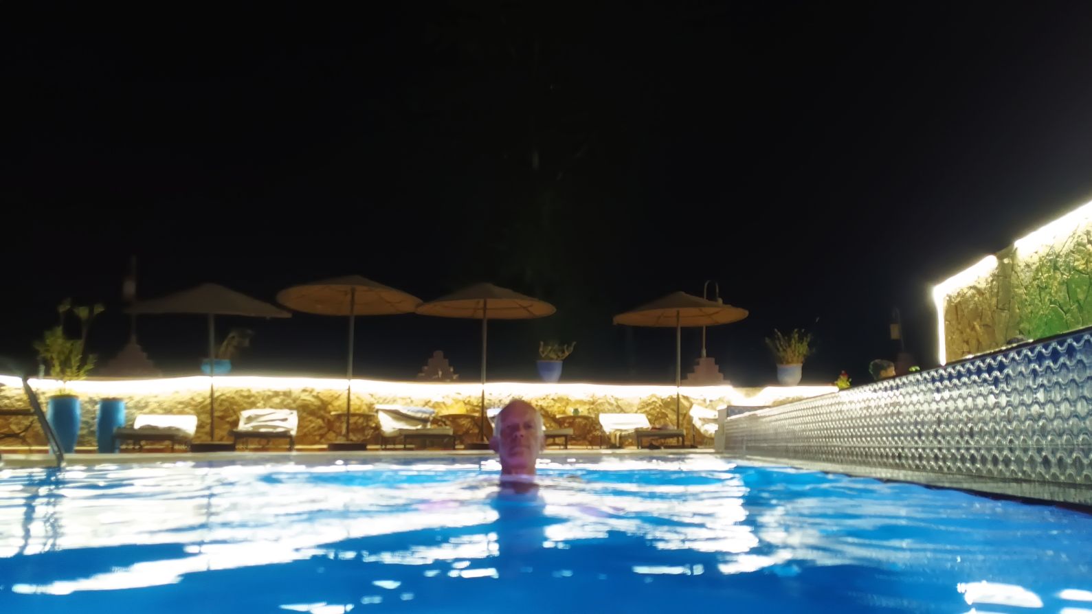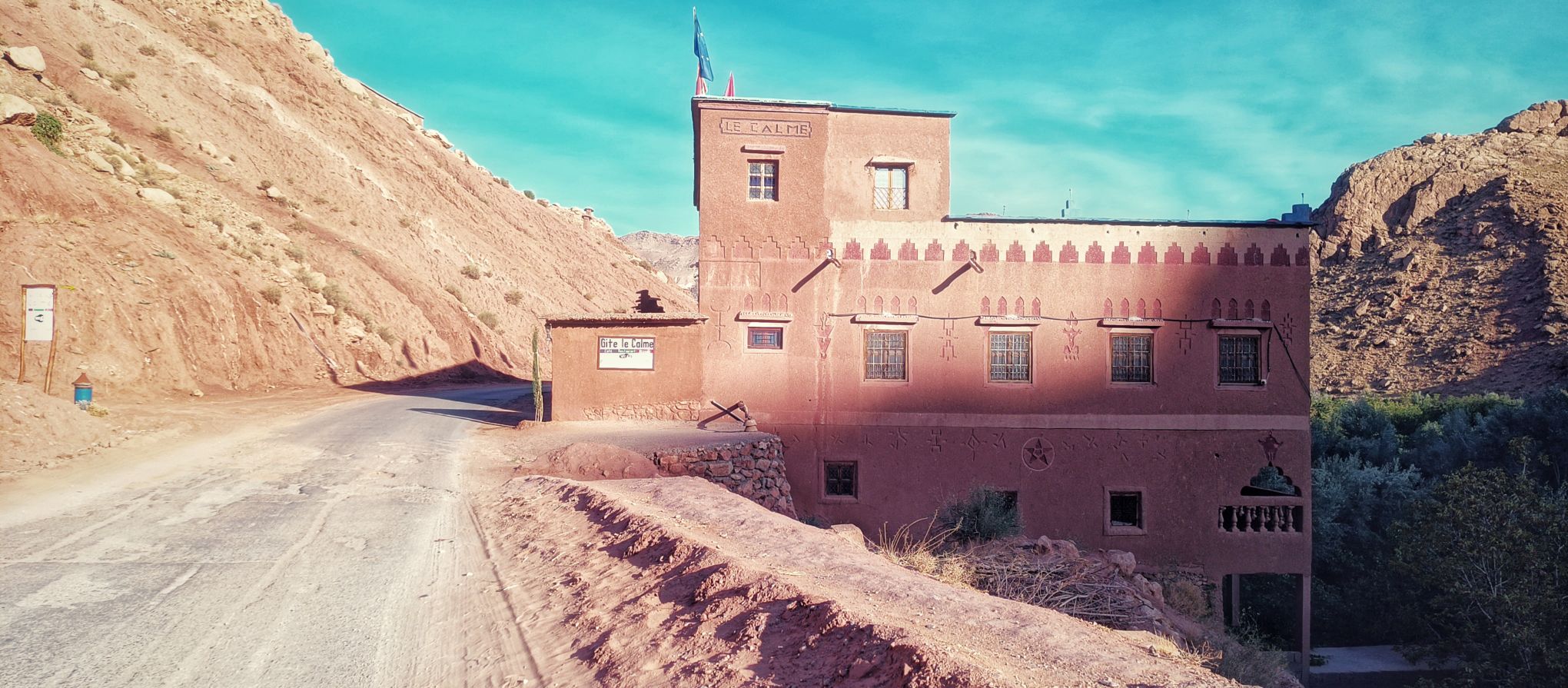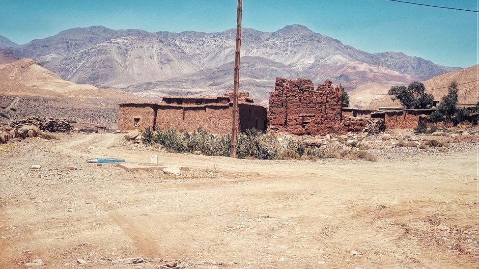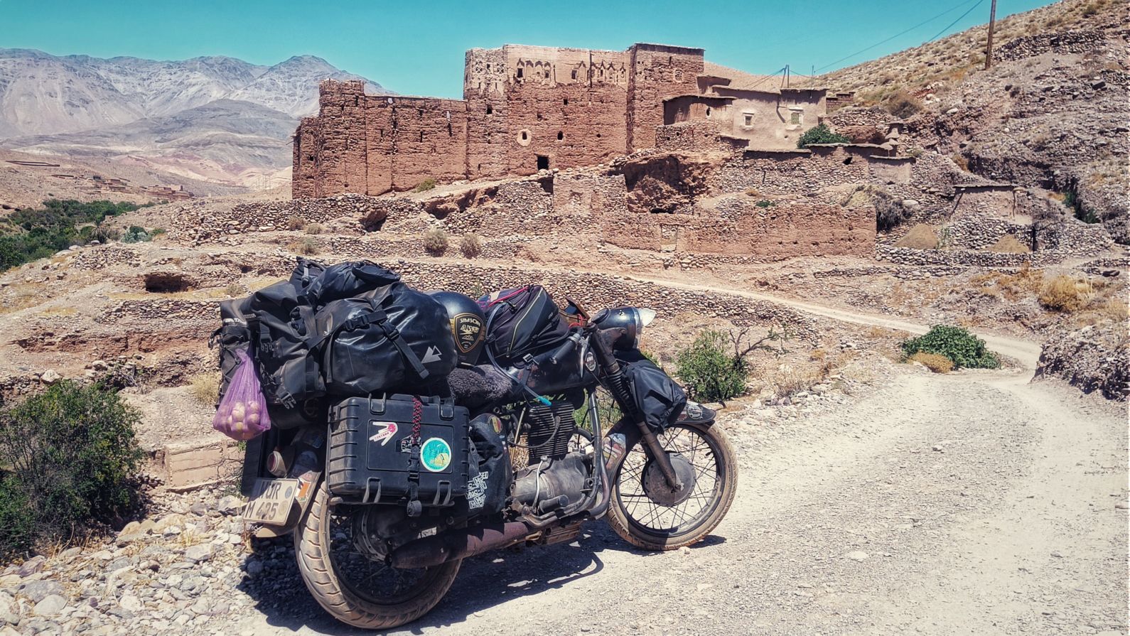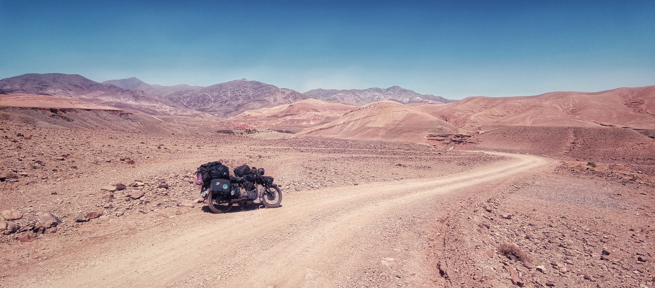 Ein Frühstück, ein paar Feigen, und ein paar Wanzen oder Flöhe gibts zum Abschied. Doch bevor es los geht, ist auch gleich wieder Schluß. Das ganze Fahrzeug ist völlig instabil. Ich vermute Luftverlust in den Reifen. Und der Sohnemann vom Herbergsvater lotst mich zum Dorfkonsum mit angeschlossenem Werkstattservice. Das Flair entspricht den beiden Werktätigen in diesem Ambiente: historisch wertvoll. Doch die Luft im Reifen, die noch reichlich vorhanden ist, ist es nicht. Ich muß den helfenden Mitarbeiter höflich bitten, daß mit den 5 Bar doch mal bitte zu unterlassen. Statt dessen entdecke ich zwei gebrochen Speichen im Hinterrad. Und die Inspektion der restlichen Speichen offenbart eine mittlere Katastrophe. Alle Speichen locker! Wie konnte ich es gestern Abend überhaupt noch bis hierher schaffen? Und vor allem zeigt es, wie sensibel ich am Ende einer Tagestour auf „kleine“ Ungereimtheiten am Fahrzeug reagiere. Ich leihe mir ein Maulschlüssel, packe alles Gepäck ab, und mache mich an eine notdürftige Reparatur. Zwar ziehe ich möglichst gleichmäßig alles wieder an, kann aber nicht auf genaue Zentrierung dabei achten. Innerlich fluchend setzt aber auch der Lerneffekt ein: nie wieder Edelstahlspeichen! Auch nicht, wenn sie 4,5mm dick sind. Im Konsum gibts noch einen Saft kostenlos nach getaner Arbeit, und dann mach ich mich in den Staub. Ja, richtig, in den Staub, nicht aus dem Staub. Jetzt gibts Wüstenfeeling, auch wenn ich mich nicht unmittelbar in der Sahara befinde. Aber zwischen Atlas und Sahara ist der Übergang fließend. Und so ziehe ich meine Kreise durch kleine Canyons und Linien durch wüstenähnliche und endlosen Ebenen. Aufregend, mal durch so eine Landschaft mit der AWO zu „cruisen“. Der Gedanke, jetzt eine Panne zu haben, wird soweit weggeschoben, wie noch nie. Ich sehe das weiße Skellet – also meins – neben einer vom Wind und Sand zerfressenem Fragment, was mal eine Maschine oder Automat gewesen sein muß. Und marokkanische Archeologen werden vielleicht in 100 Jahren versuchen, daß Rätsel dieser exotischen Maschine und des daneben liegenden armen Irren zu lösen versuchen. Ein aus Russland zu Hilfe gerufenes Archeologenteam wird dann ziemlich schnell feststellen: Автовело! Zunächst muß ich mich aber wegen einer Tankfüllung wieder Richtung große Hauptstraße begeben. Und anschließend gehts sofort wieder zurück, durch die Wüste, ab in die Berge. Erwähnte ich schon die atemberaubende Schönheit des Atlas-Gebirges? Leider ist der Tag zu kurz, um alles vollends genießen zu können. Und den krönenden Abschluß, offroad auf über 3000m zu kommen, muß ich aus sicherheitsrelevanten Gründen wegen Anbruch der Dämmerung leider canceln. Ein letzter Funken an Restvernunft hat doch noch obsiegt. Ein fürs Ego persönlicher Rekord mit der AWO geht mir flöten, aber die Rauheit und Schönheit, dieses Impossarium der Berge, Schluchten und Hochebenen ist auch ohne 3000m der Gipfel der Genüsse! Über die Gefährlichkeit so mancher schwieriger Abschnitte schweige ich mich an dieser Stelle aus, meiner Mama wegen. Sie muß nicht wissen, daß es Stellen der Unumkehrbarkeit gab, daß manches Stück Schotterpiste auch immer etwas Glück braucht, daß ein Bruchteil einer Sekunde Unaufmerksamkeit eine gewisse Fallzeit ins Tal beinhaltet, noch mal über den eben gemachten Fehler nachzudenken. Die letzte Stunde bis Tinghir gehts auf langweiliger Straße in die Dunkelheit hinein. Und die Ortschaft, und nicht nur diese, macht Abends kein Spass. Denn ist die Sonne untergegangen, beginnt für den Marokkaner das Leben. Man begibt sich zum Einkaufen oder trifft sich einfach. Wenns sein muß, auch mitten auf der Straße. Ein Highlight hab ich mir dann aber doch noch aufgehoben. Ich komme zwar völlig erschöpft kurz hinter Tinghir an mein Ziel, aber hey, Leute, nach so einen Tag darfs auch ein bißchen Pool zum Abschluß sein!