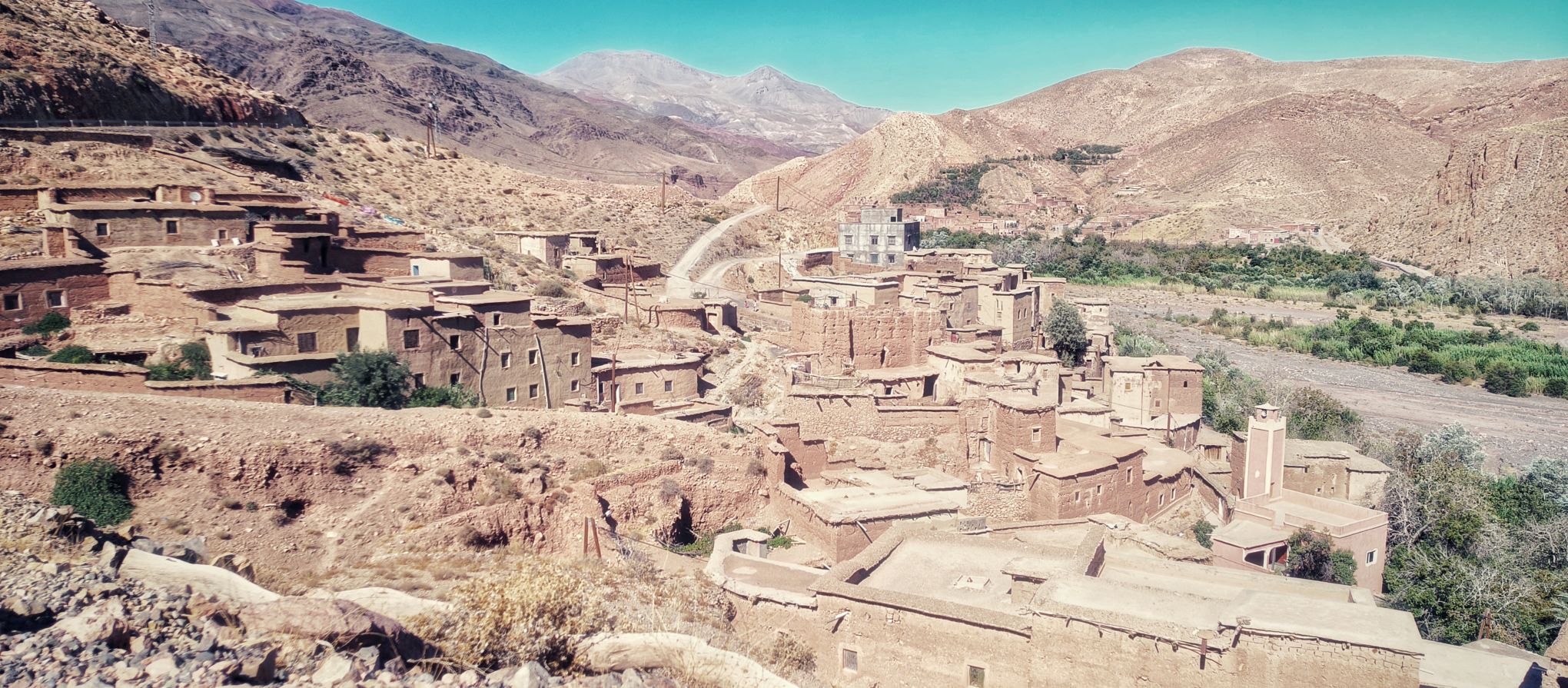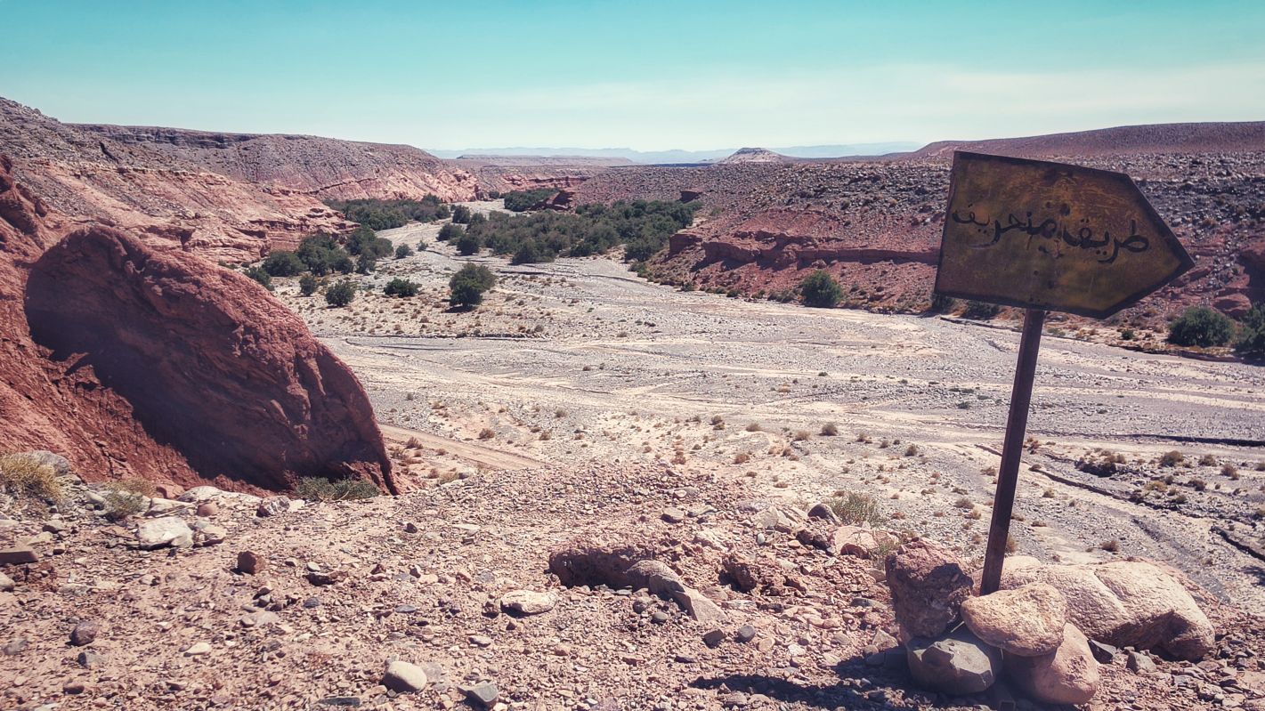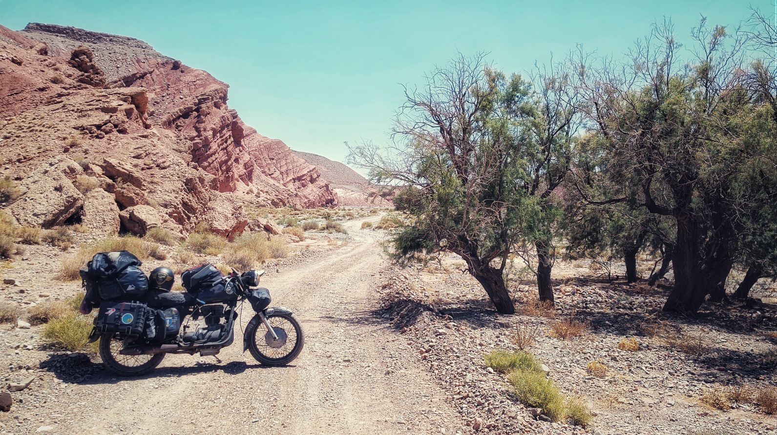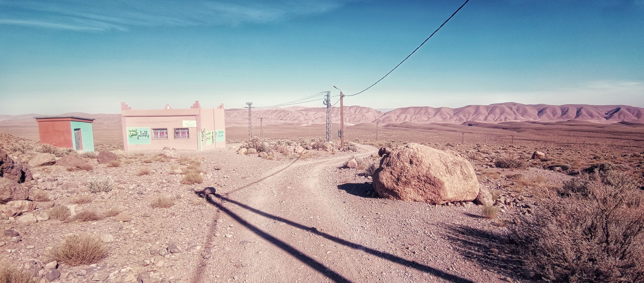 Ein Frühstück, ein paar Feigen, und ein paar Wanzen oder Flöhe gibts zum Abschied. Doch bevor es los geht, ist auch gleich wieder Schluß. Das ganze Fahrzeug ist völlig instabil. Ich vermute Luftverlust in den Reifen. Und der Sohnemann vom Herbergsvater lotst mich zum Dorfkonsum mit angeschlossenem Werkstattservice. Das Flair entspricht den beiden Werktätigen in diesem Ambiente: historisch wertvoll. Doch die Luft im Reifen, die noch reichlich vorhanden ist, ist es nicht. Ich muß den helfenden Mitarbeiter höflich bitten, daß mit den 5 Bar doch mal bitte zu unterlassen. Statt dessen entdecke ich zwei gebrochen Speichen im Hinterrad. Und die Inspektion der restlichen Speichen offenbart eine mittlere Katastrophe. Alle Speichen locker! Wie konnte ich es gestern Abend überhaupt noch bis hierher schaffen? Und vor allem zeigt es, wie sensibel ich am Ende einer Tagestour auf „kleine“ Ungereimtheiten am Fahrzeug reagiere. Ich leihe mir ein Maulschlüssel, packe alles Gepäck ab, und mache mich an eine notdürftige Reparatur. Zwar ziehe ich möglichst gleichmäßig alles wieder an, kann aber nicht auf genaue Zentrierung dabei achten. Innerlich fluchend setzt aber auch der Lerneffekt ein: nie wieder Edelstahlspeichen! Auch nicht, wenn sie 4,5mm dick sind. Im Konsum gibts noch einen Saft kostenlos nach getaner Arbeit, und dann mach ich mich in den Staub. Ja, richtig, in den Staub, nicht aus dem Staub. Jetzt gibts Wüstenfeeling, auch wenn ich mich nicht unmittelbar in der Sahara befinde. Aber zwischen Atlas und Sahara ist der Übergang fließend. Und so ziehe ich meine Kreise durch kleine Canyons und Linien durch wüstenähnliche und endlosen Ebenen. Aufregend, mal durch so eine Landschaft mit der AWO zu „cruisen“. Der Gedanke, jetzt eine Panne zu haben, wird soweit weggeschoben, wie noch nie. Ich sehe das weiße Skellet – also meins – neben einer vom Wind und Sand zerfressenem Fragment, was mal eine Maschine oder Automat gewesen sein muß. Und marokkanische Archeologen werden vielleicht in 100 Jahren versuchen, daß Rätsel dieser exotischen Maschine und des daneben liegenden armen Irren zu lösen versuchen. Ein aus Russland zu Hilfe gerufenes Archeologenteam wird dann ziemlich schnell feststellen: Автовело! Zunächst muß ich mich aber wegen einer Tankfüllung wieder Richtung große Hauptstraße begeben. Und anschließend gehts sofort wieder zurück, durch die Wüste, ab in die Berge. Erwähnte ich schon die atemberaubende Schönheit des Atlas-Gebirges? Leider ist der Tag zu kurz, um alles vollends genießen zu können. Und den krönenden Abschluß, offroad auf über 3000m zu kommen, muß ich aus sicherheitsrelevanten Gründen wegen Anbruch der Dämmerung leider canceln. Ein letzter Funken an Restvernunft hat doch noch obsiegt. Ein fürs Ego persönlicher Rekord mit der AWO geht mir flöten, aber die Rauheit und Schönheit, dieses Impossarium der Berge, Schluchten und Hochebenen ist auch ohne 3000m der Gipfel der Genüsse! Über die Gefährlichkeit so mancher schwieriger Abschnitte schweige ich mich an dieser Stelle aus, meiner Mama wegen. Sie muß nicht wissen, daß es Stellen der Unumkehrbarkeit gab, daß manches Stück Schotterpiste auch immer etwas Glück braucht, daß ein Bruchteil einer Sekunde Unaufmerksamkeit eine gewisse Fallzeit ins Tal beinhaltet, noch mal über den eben gemachten Fehler nachzudenken. Die letzte Stunde bis Tinghir gehts auf langweiliger Straße in die Dunkelheit hinein. Und die Ortschaft, und nicht nur diese, macht Abends kein Spass. Denn ist die Sonne untergegangen, beginnt für den Marokkaner das Leben. Man begibt sich zum Einkaufen oder trifft sich einfach. Wenns sein muß, auch mitten auf der Straße. Ein Highlight hab ich mir dann aber doch noch aufgehoben. Ich komme zwar völlig erschöpft kurz hinter Tinghir an mein Ziel, aber hey, Leute, nach so einen Tag darfs auch ein bißchen Pool zum Abschluß sein!