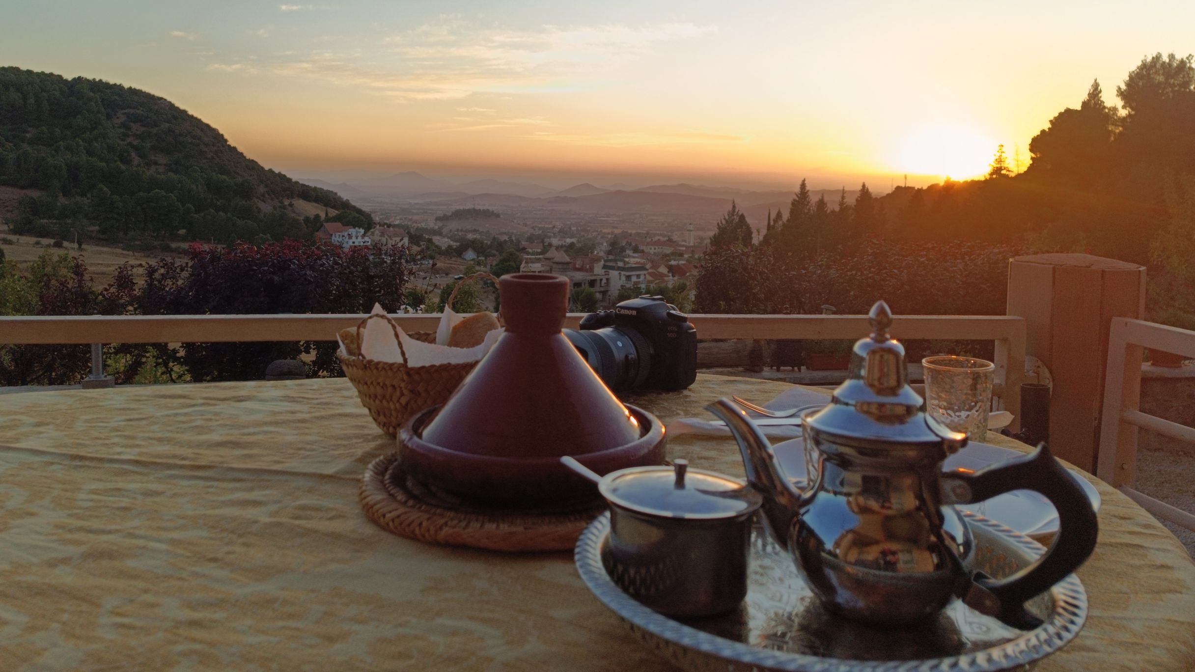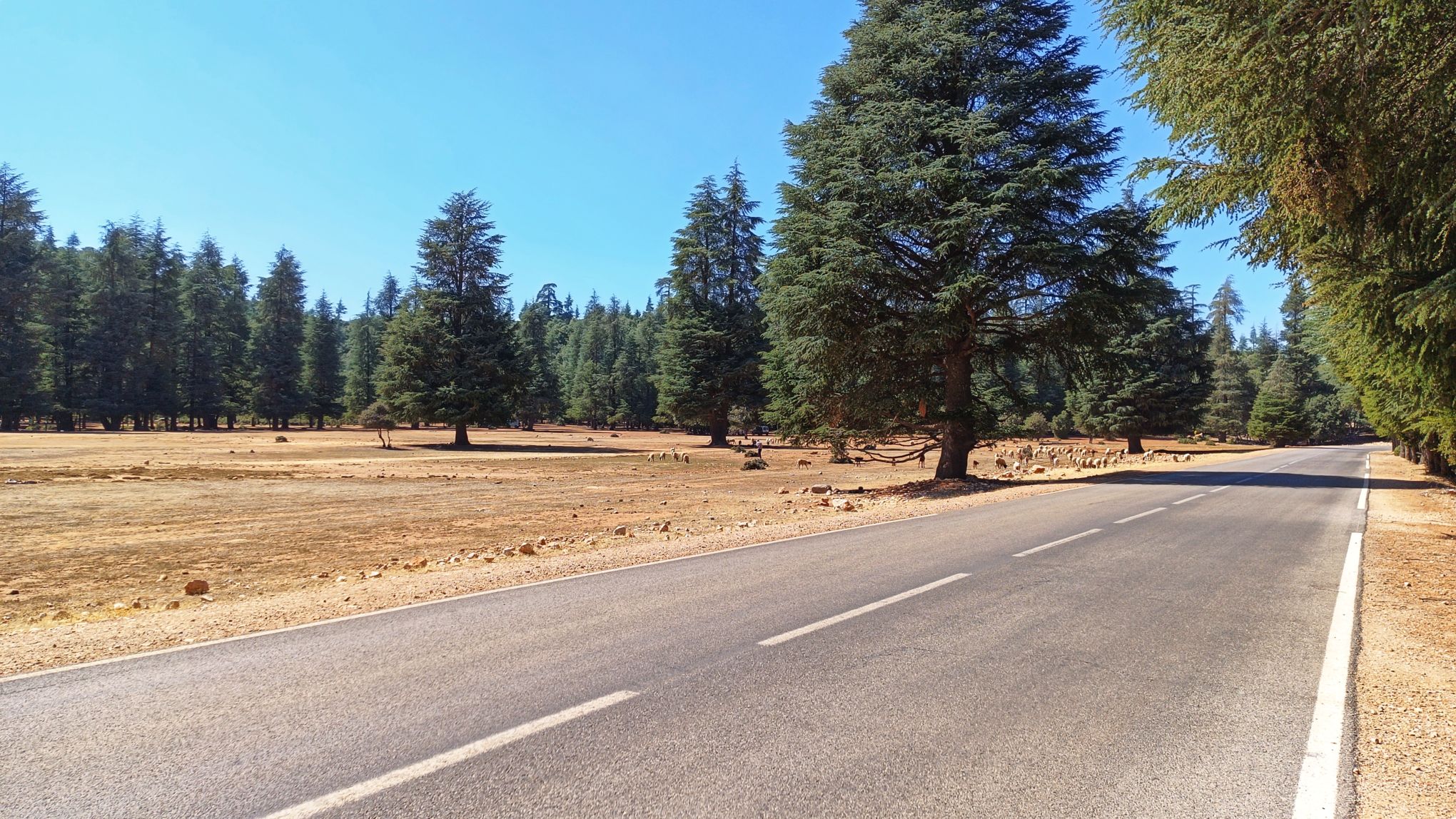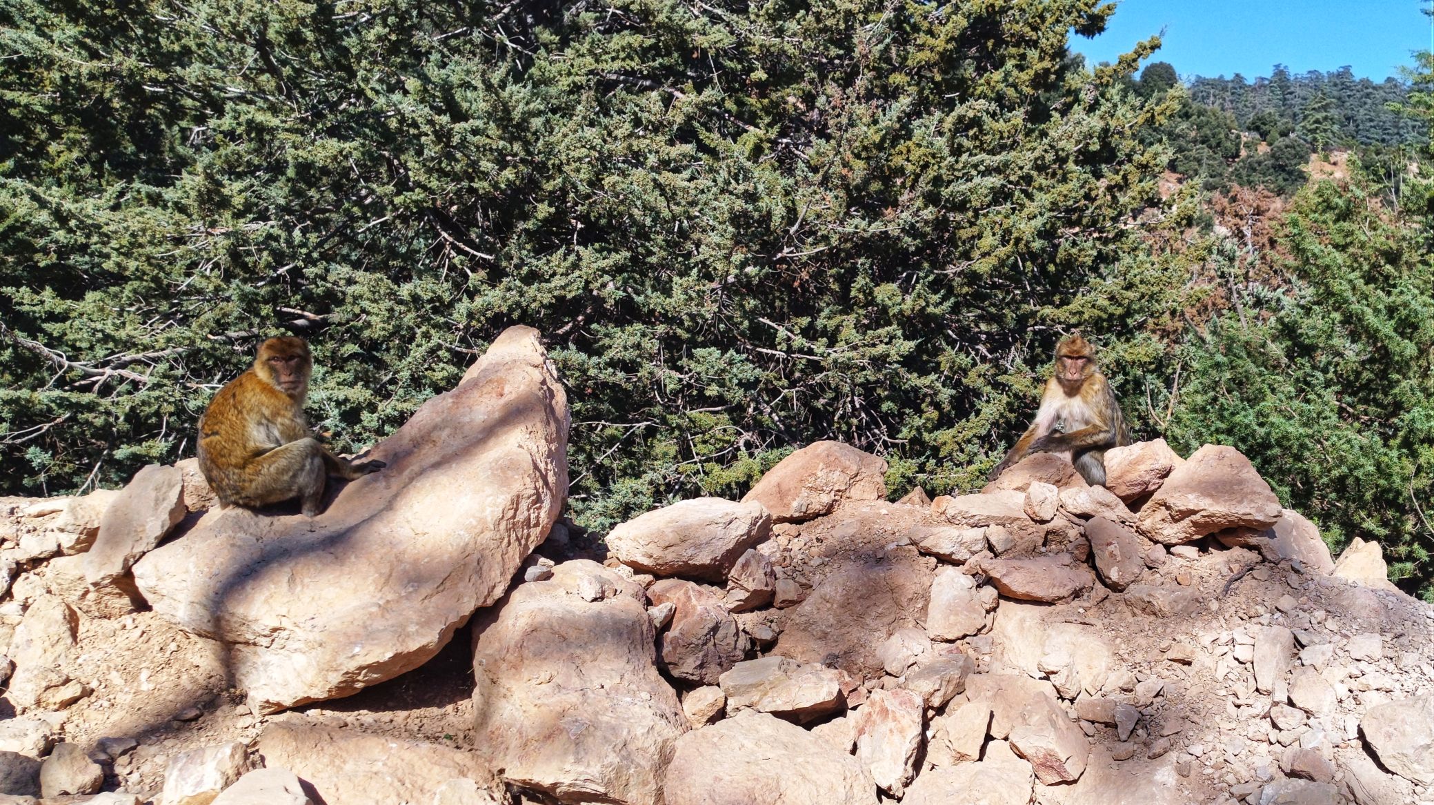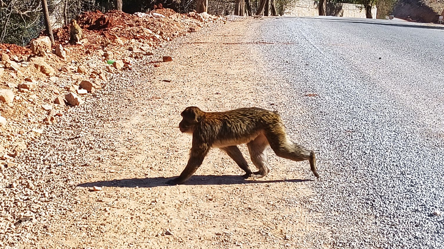 Wenn man dem Spektakulärem langsam den Rücken kehrt und der Kompass in die Richtung weißt, in der der Abstand zur alten Heimat wieder kürzer wird, setzt unwillkürlich die Melankolie des Abschiednehmen ein. Aber so schnell wird in Steppis Fall nicht geschoßen. Der Vorteil des Motorradreisens ist, vorbei ist, wenn ich zu Hause auf dem Balkon liege und mir alles noch mal durch den Kopf gehen lasse. Bis dahin ist REISE, und das ist schließlich das Ziel. Nix 12 Stunden Flieger, Trombosegefahr, und am Checkin am Flughafen ist die Stimmung am Arsch. Die Landschaft ist absolut abwechslungsreich. Hinaus aus der rotbraunen schroffen Gebirgsstruktur des Atlas-Gebirges geht es in eine gelblich-ocker-farbene Berglandschaft, die sich immer mehr verläuft, aber immer noch erstaunlich hoch liegt. In dieser augenscheinlich dünn besiedelten Gegend weist mich ein sehr betagter Tankwart darauf hin, daß er Berber sei. Und wiederholte dies auch noch mal, um es auch ja zu bekräftigen. Es schien ihn sehr wichtig zu sein, mir dies mitzuteilen. Nun kenne ich mich in der marokkanischen Bevölkerungsstruktur überhaupt nicht aus, aber ein späterer Blick ins Internet verrät mir, daß hier wohl die zentrale Gegend der Barbaren ist. Ich hoffe, war! Einen dritten starken Wechsel der Landschaft erlebe ich im Parc National De Khenifra mit seinem Zedernwald. Viele Bäume = ein Wald. Der erste auf meiner Reise durch Marokko. Und als Sahnehäubchen – weil, ist ja Afrika – bekomme ich ohne Glaswand oder Gefängnisstäbe Berberaffen präsentiert, welche hier und da Straßenabschnitte bevölkern und dort ihr Jagdrevier haben. Das sieht dann so aus, daß Affe mit offenem Mund auf der Straße sitzt, und wenn er Glück hat, fliegt das Futter aus den vorbeifahrenden Autos direkt ins Maul. Und so endet ein weiterer abwechslungsreicher Tag bei Dinner und Sonnenuntergang auf einer Terasse mit Blick auf Azrou.