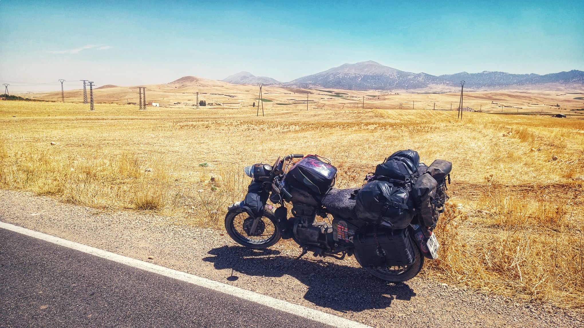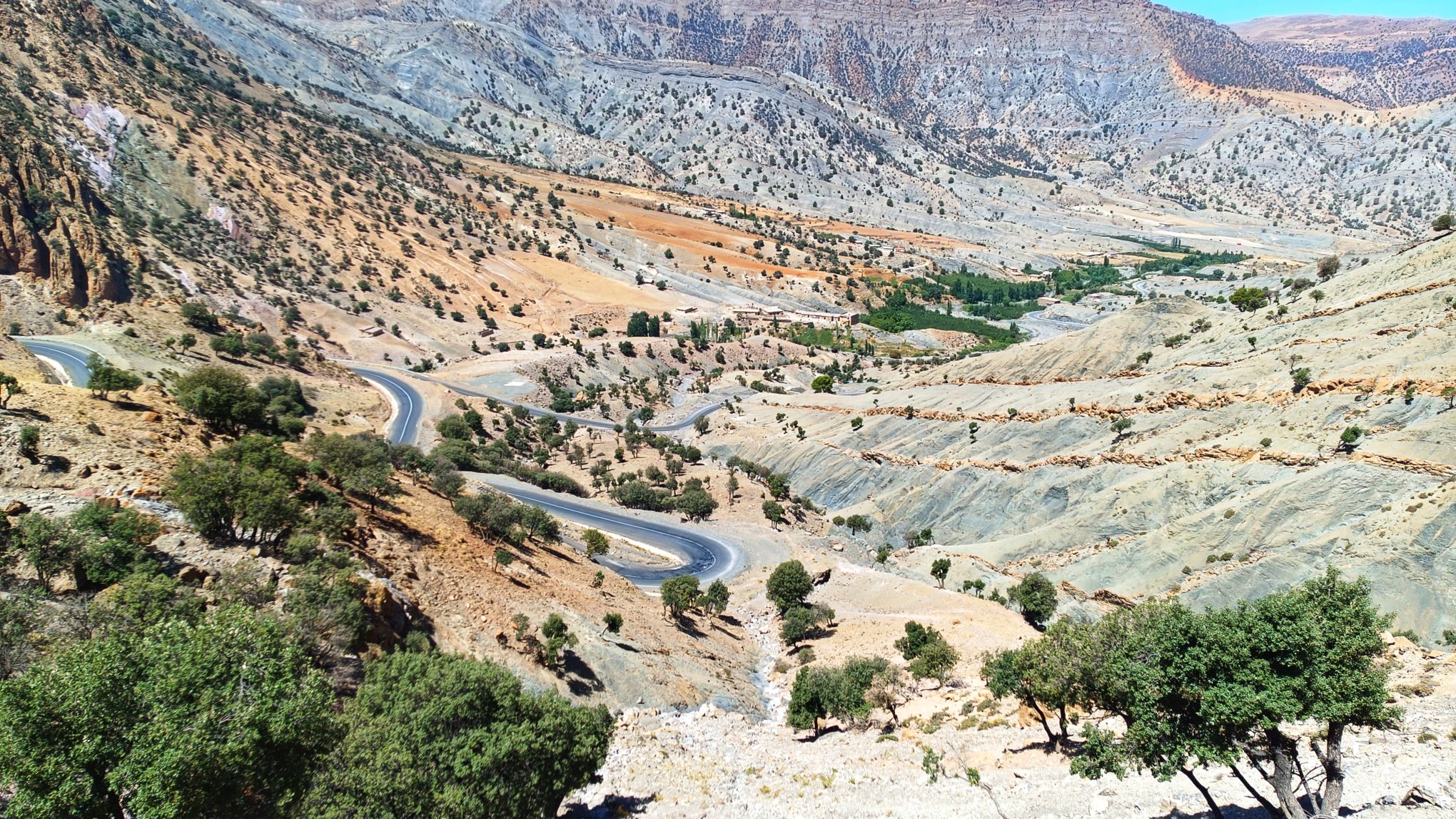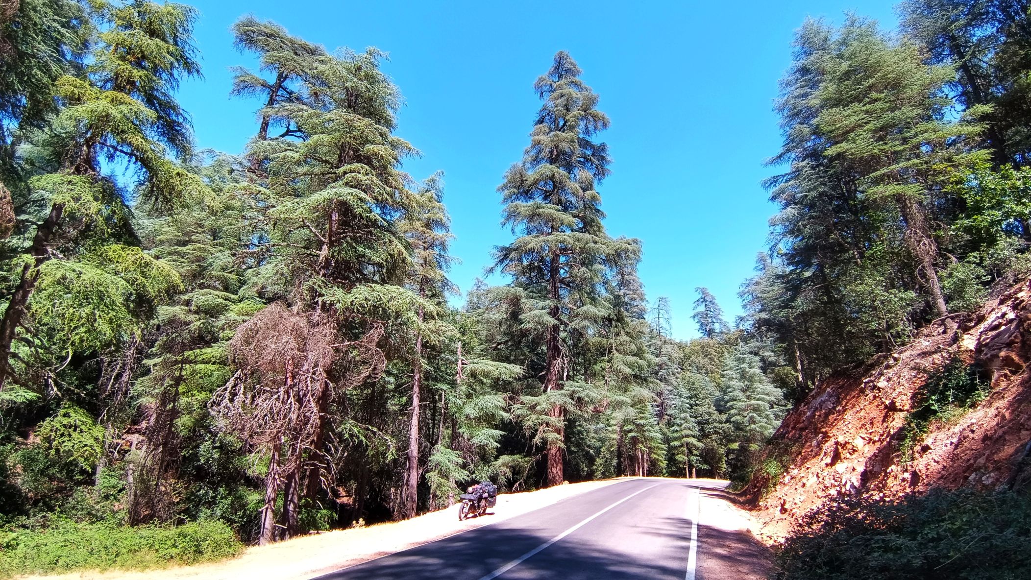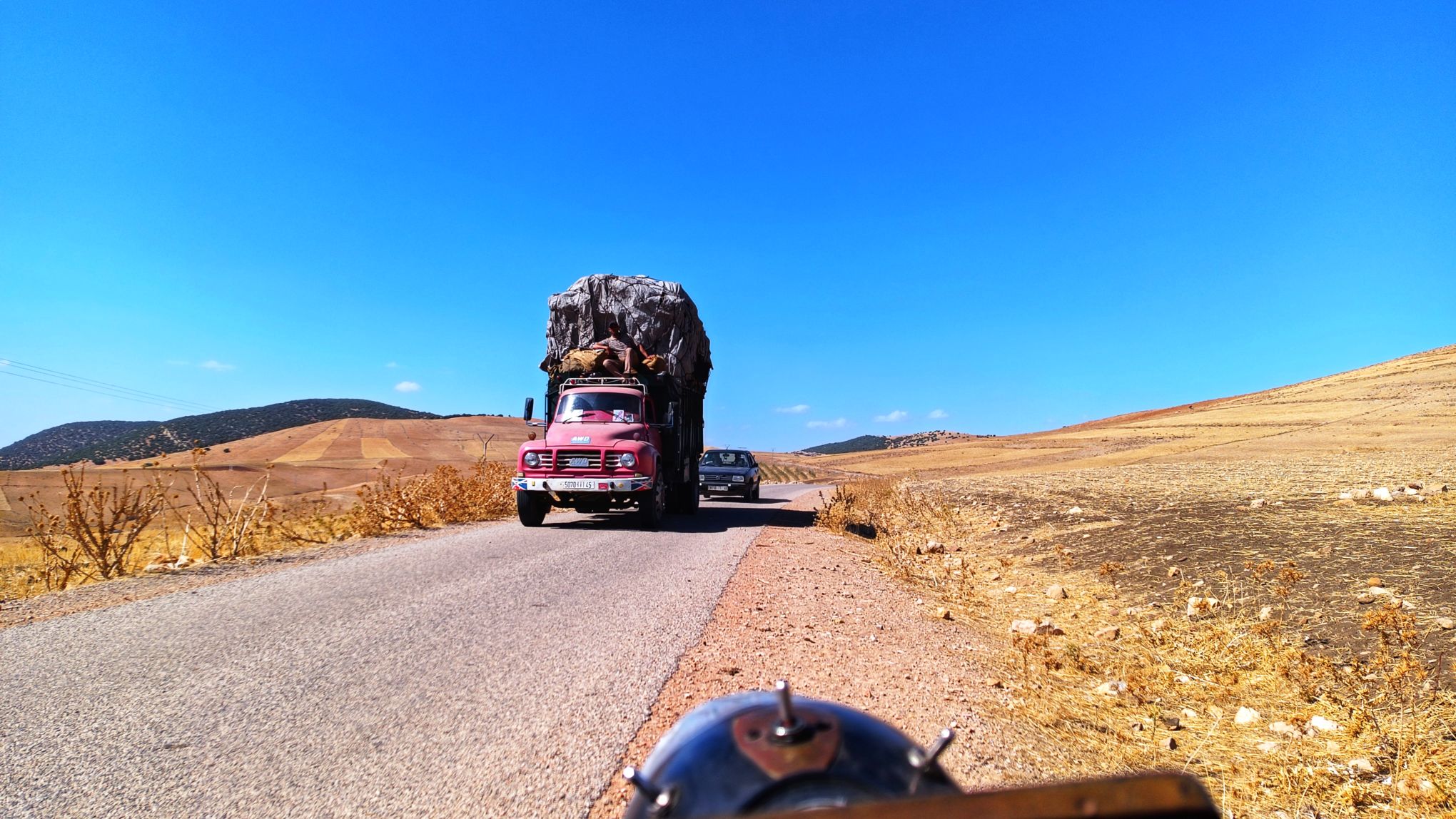 Wenn man dem Spektakulärem langsam den Rücken kehrt und der Kompass in die Richtung weißt, in der der Abstand zur alten Heimat wieder kürzer wird, setzt unwillkürlich die Melankolie des Abschiednehmen ein. Aber so schnell wird in Steppis Fall nicht geschoßen. Der Vorteil des Motorradreisens ist, vorbei ist, wenn ich zu Hause auf dem Balkon liege und mir alles noch mal durch den Kopf gehen lasse. Bis dahin ist REISE, und das ist schließlich das Ziel. Nix 12 Stunden Flieger, Trombosegefahr, und am Checkin am Flughafen ist die Stimmung am Arsch. Die Landschaft ist absolut abwechslungsreich. Hinaus aus der rotbraunen schroffen Gebirgsstruktur des Atlas-Gebirges geht es in eine gelblich-ocker-farbene Berglandschaft, die sich immer mehr verläuft, aber immer noch erstaunlich hoch liegt. In dieser augenscheinlich dünn besiedelten Gegend weist mich ein sehr betagter Tankwart darauf hin, daß er Berber sei. Und wiederholte dies auch noch mal, um es auch ja zu bekräftigen. Es schien ihn sehr wichtig zu sein, mir dies mitzuteilen. Nun kenne ich mich in der marokkanischen Bevölkerungsstruktur überhaupt nicht aus, aber ein späterer Blick ins Internet verrät mir, daß hier wohl die zentrale Gegend der Barbaren ist. Ich hoffe, war! Einen dritten starken Wechsel der Landschaft erlebe ich im Parc National De Khenifra mit seinem Zedernwald. Viele Bäume = ein Wald. Der erste auf meiner Reise durch Marokko. Und als Sahnehäubchen – weil, ist ja Afrika – bekomme ich ohne Glaswand oder Gefängnisstäbe Berberaffen präsentiert, welche hier und da Straßenabschnitte bevölkern und dort ihr Jagdrevier haben. Das sieht dann so aus, daß Affe mit offenem Mund auf der Straße sitzt, und wenn er Glück hat, fliegt das Futter aus den vorbeifahrenden Autos direkt ins Maul. Und so endet ein weiterer abwechslungsreicher Tag bei Dinner und Sonnenuntergang auf einer Terasse mit Blick auf Azrou.