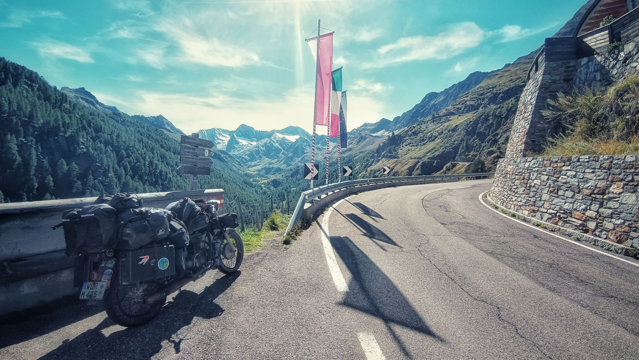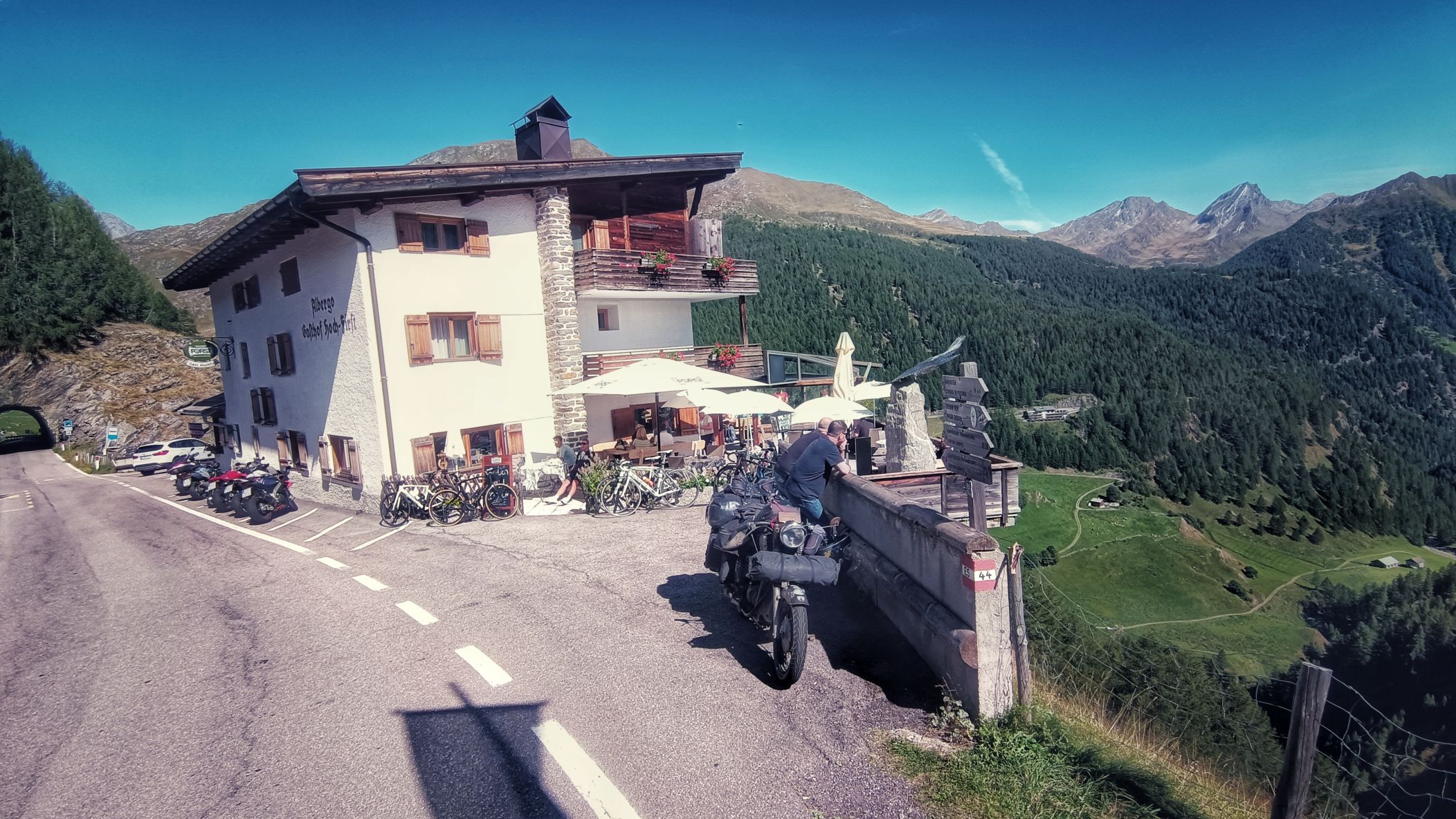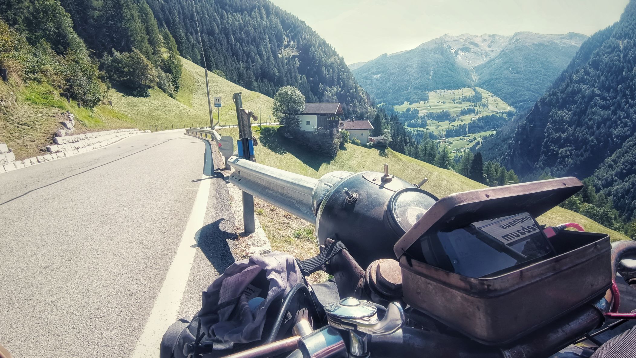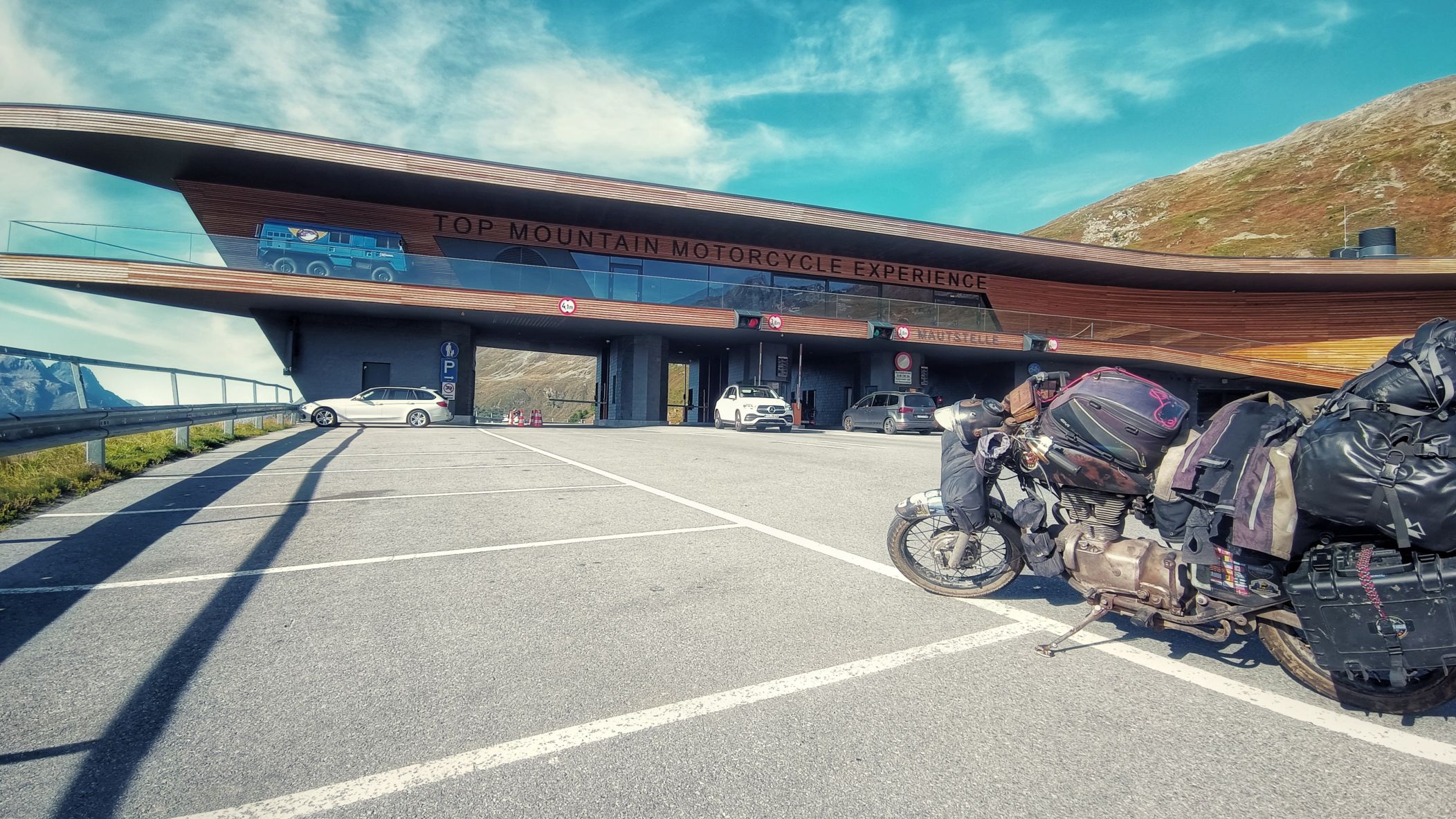 Timmelsjoch an einem Samstag am Ende des Sommers? Nicht die beste Idee. Ein Mix aus Wochenendausflügler und Hobbyrennfahrer verträgt sich nicht wirklich. Und mittendrin ein einsamer AWO-Fahrer. Es wundert mich, daß ich keine Aggressionen oder gar Unfälle gesehen habe. Als ich aus dem Museum komme, sehe ich allerdings den Rettungshubschrauber starten. Auf dem Weg zum Timmelsjoch komme ich bei einem Fotostopp mit einer jungen Tirolerin ins Gespräch, welche mir durchaus vermittelt, daß den Bewohnern dieser Zirkus teils mächtig auf die Ketten geht. Mir gehts heute auch auf den Nerv, und selten war ich so unentspannt in den Alpen unterwegs. Später im Museum kam kaum Begeisterung auf. Die Exponate schienen mir lieblos aneinandergereiht. Ja, es gibt viele alte und schöne Motorräder zu bewundern, aber mir fehlen Geschichten und Informationen, auf die man sich einlassen kann. Hingegen hat man sich bei der Architektur des Museums durchaus was einfallen lassen. Vielleicht war ich nach 4 Wochen auf Axe, ähm, Achse auch einfach nur zu müde, um noch begeisterungsfähig für derlei Sachen zu sein. Aufgrund fehlender Exponate aus Suhl zählt das Museum eh nicht zu den Toppadressen, was historische Motorräder betrifft. Das beste Exponat steht also vor dem Museum, doch interessiert hier auch niemanden wirklich. Nur ein Sachse im üblen heimischen Dialekt fragt, ob ich bis hierher auf eigener Achse gekommen bin. In meinem Kopf kreiseln verschiedene Antworten. Ich entscheide mich für die kürzeste: jo! Übrigens, das Museum war an einem sonnigen Samstag total leer!