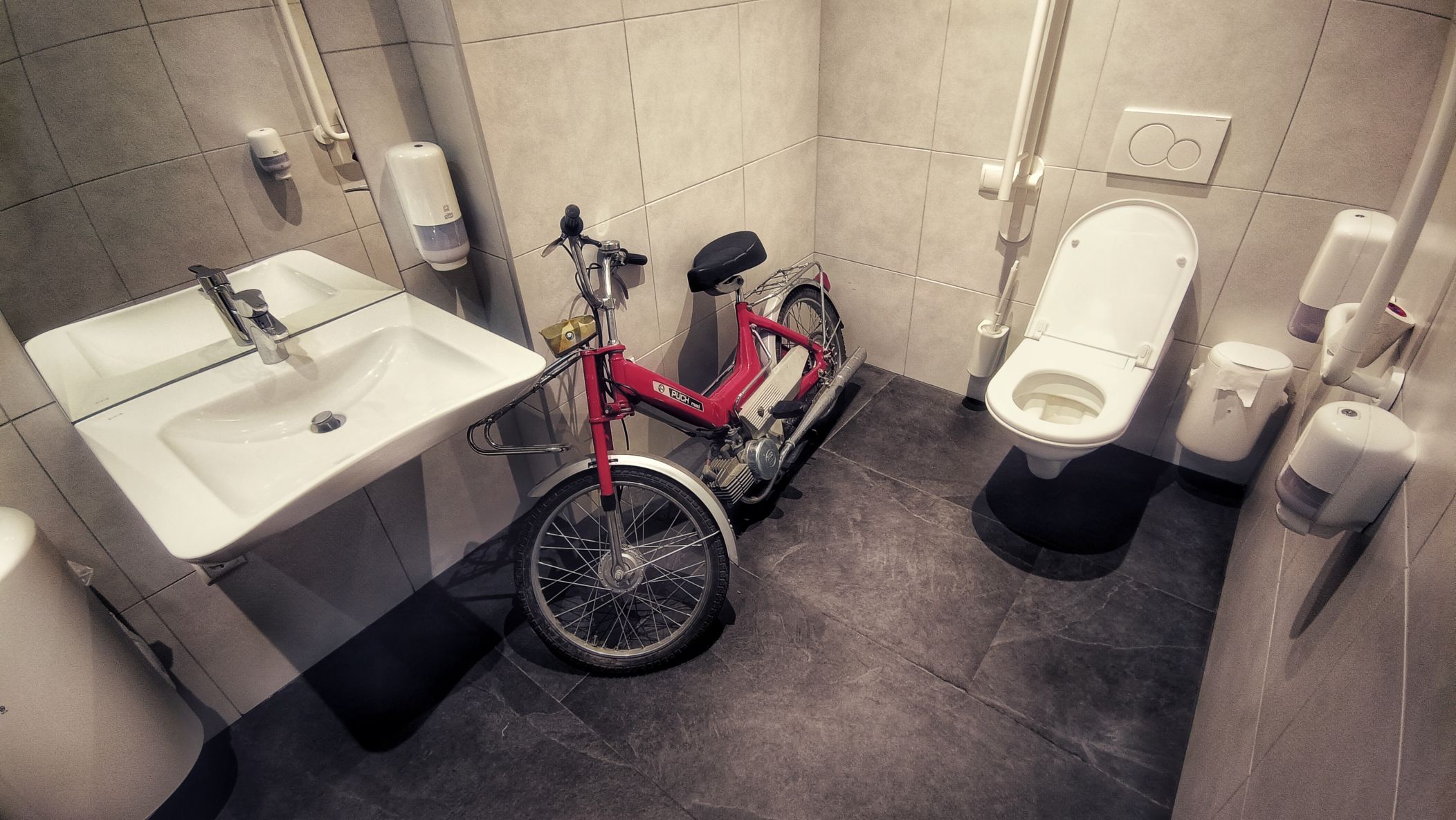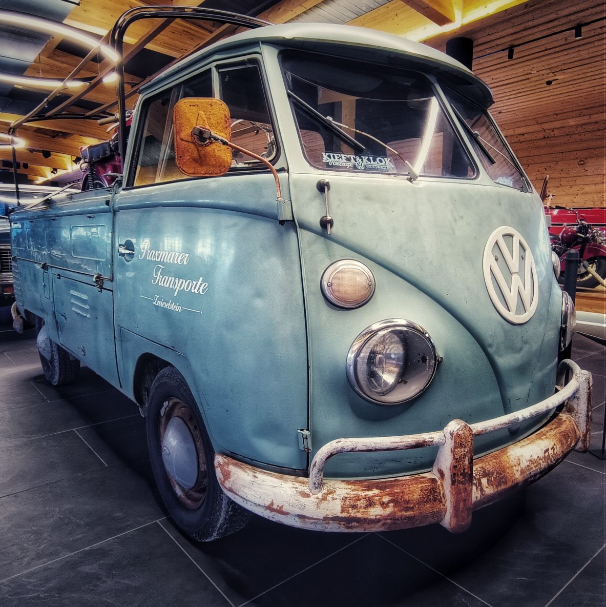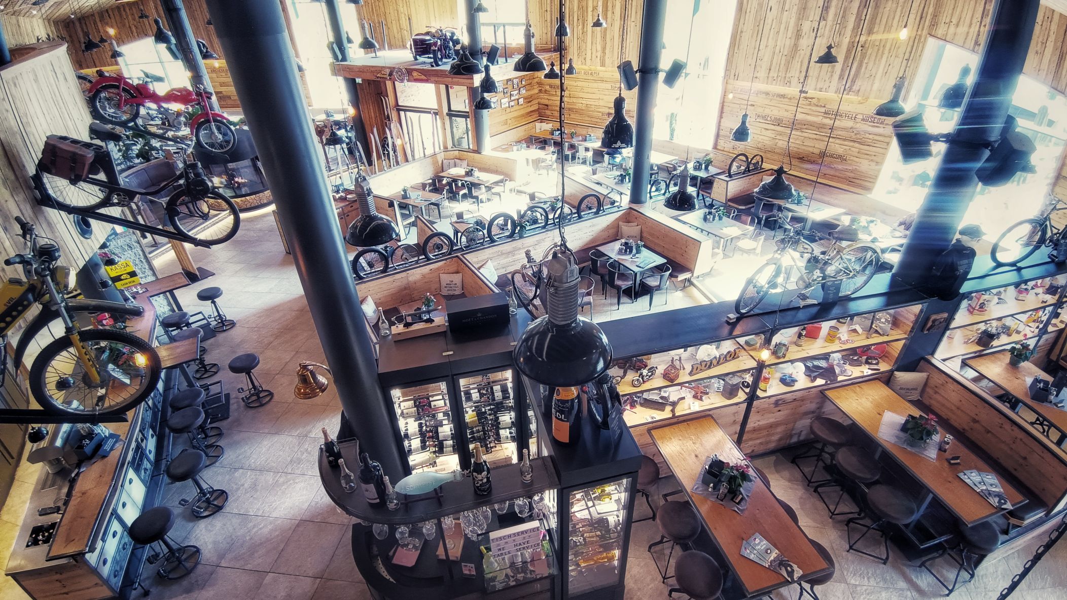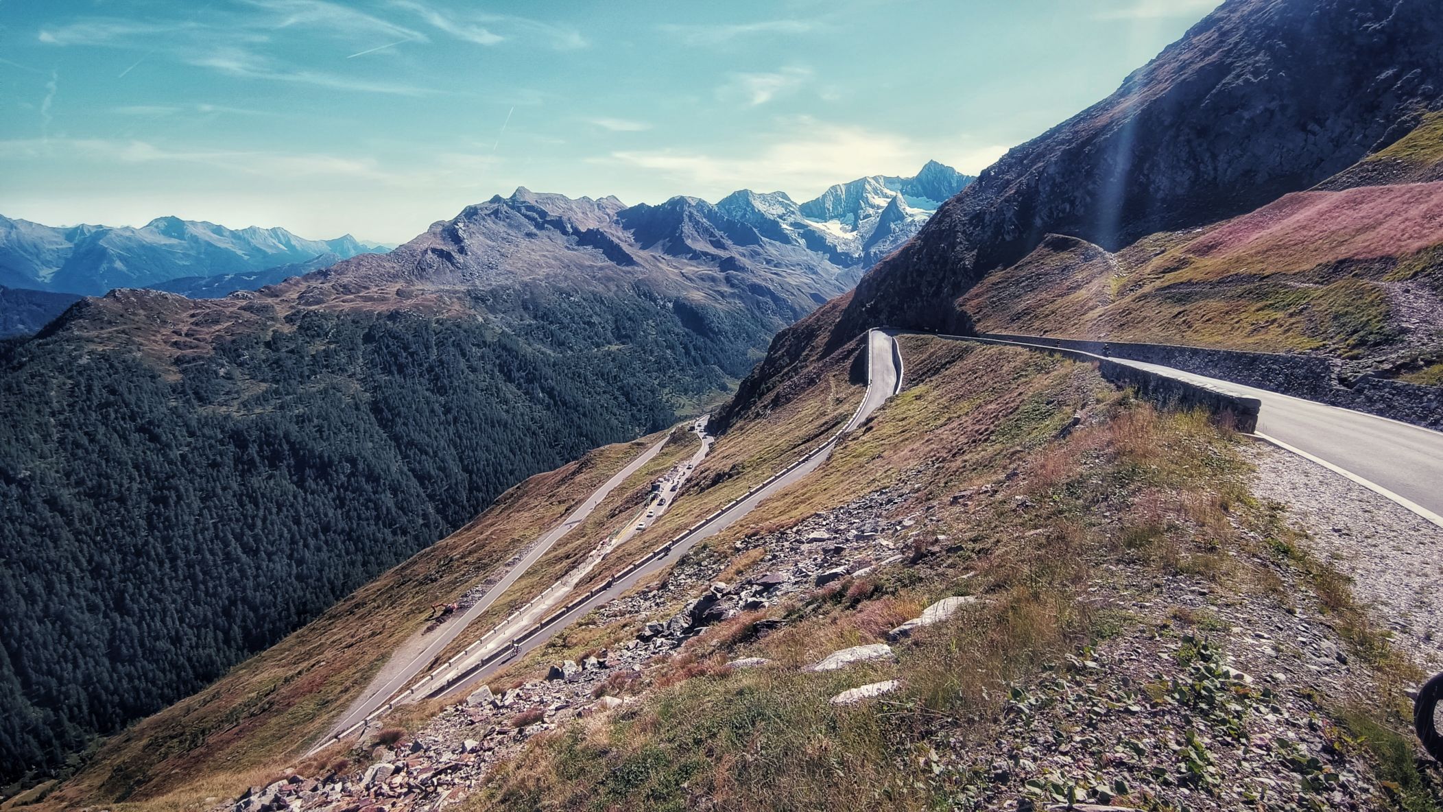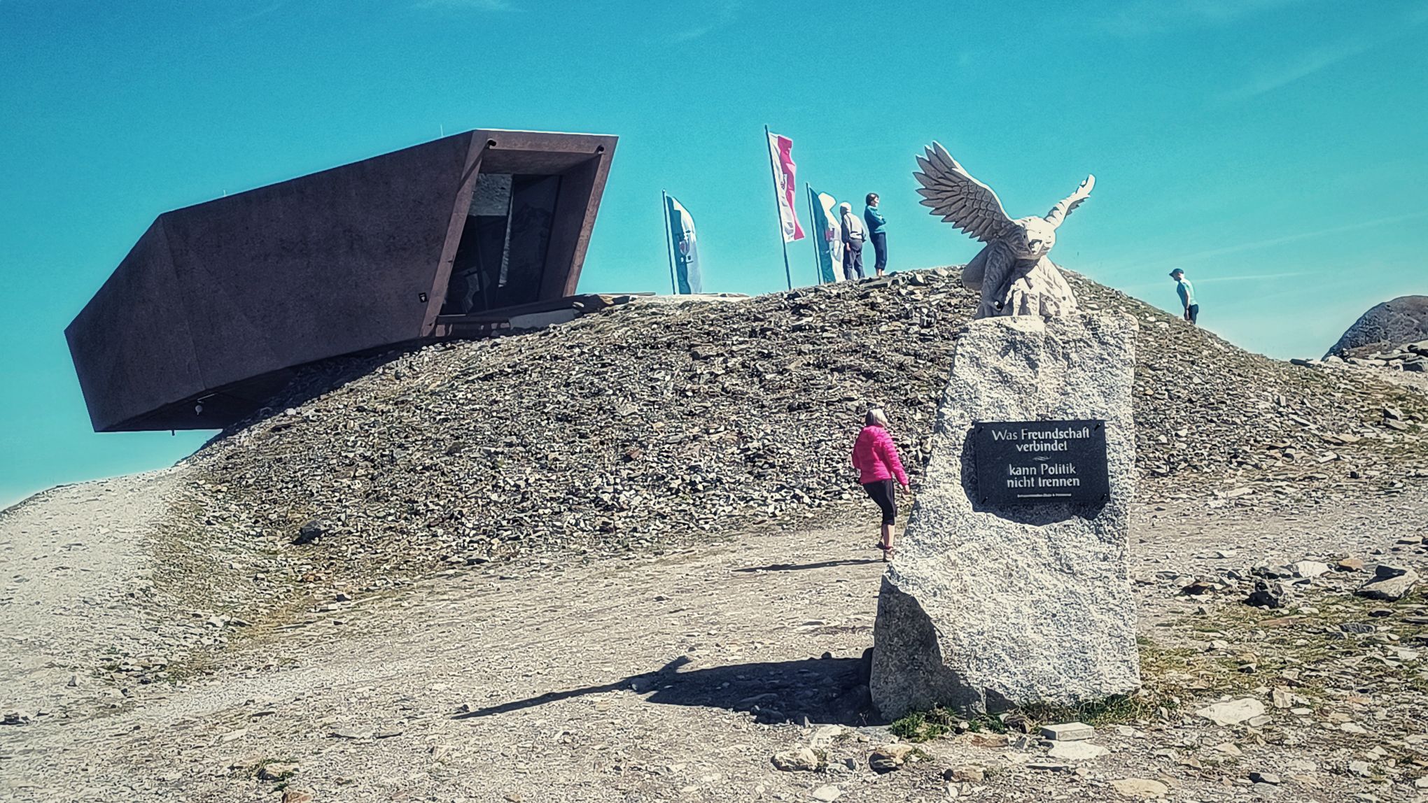 Timmelsjoch an einem Samstag am Ende des Sommers? Nicht die beste Idee. Ein Mix aus Wochenendausflügler und Hobbyrennfahrer verträgt sich nicht wirklich. Und mittendrin ein einsamer AWO-Fahrer. Es wundert mich, daß ich keine Aggressionen oder gar Unfälle gesehen habe. Als ich aus dem Museum komme, sehe ich allerdings den Rettungshubschrauber starten. Auf dem Weg zum Timmelsjoch komme ich bei einem Fotostopp mit einer jungen Tirolerin ins Gespräch, welche mir durchaus vermittelt, daß den Bewohnern dieser Zirkus teils mächtig auf die Ketten geht. Mir gehts heute auch auf den Nerv, und selten war ich so unentspannt in den Alpen unterwegs. Später im Museum kam kaum Begeisterung auf. Die Exponate schienen mir lieblos aneinandergereiht. Ja, es gibt viele alte und schöne Motorräder zu bewundern, aber mir fehlen Geschichten und Informationen, auf die man sich einlassen kann. Hingegen hat man sich bei der Architektur des Museums durchaus was einfallen lassen. Vielleicht war ich nach 4 Wochen auf Axe, ähm, Achse auch einfach nur zu müde, um noch begeisterungsfähig für derlei Sachen zu sein. Aufgrund fehlender Exponate aus Suhl zählt das Museum eh nicht zu den Toppadressen, was historische Motorräder betrifft. Das beste Exponat steht also vor dem Museum, doch interessiert hier auch niemanden wirklich. Nur ein Sachse im üblen heimischen Dialekt fragt, ob ich bis hierher auf eigener Achse gekommen bin. In meinem Kopf kreiseln verschiedene Antworten. Ich entscheide mich für die kürzeste: jo! Übrigens, das Museum war an einem sonnigen Samstag total leer!